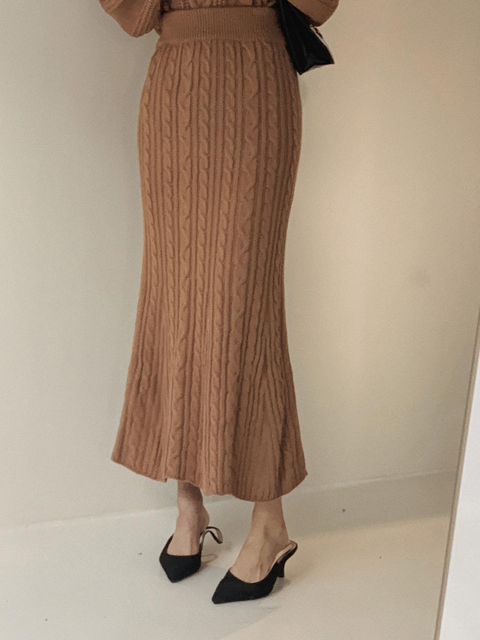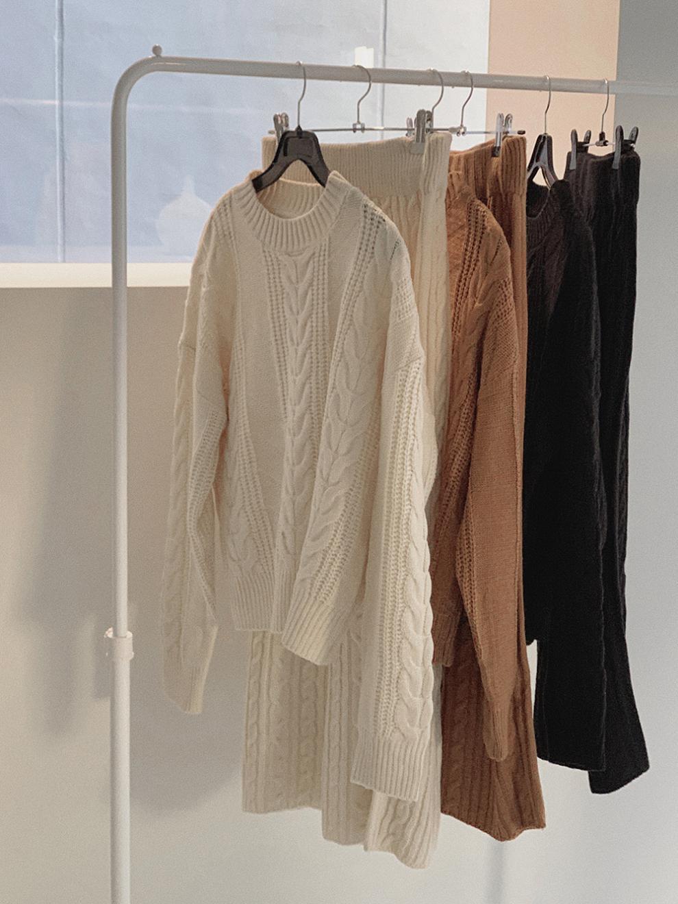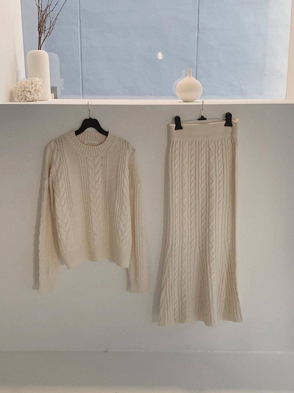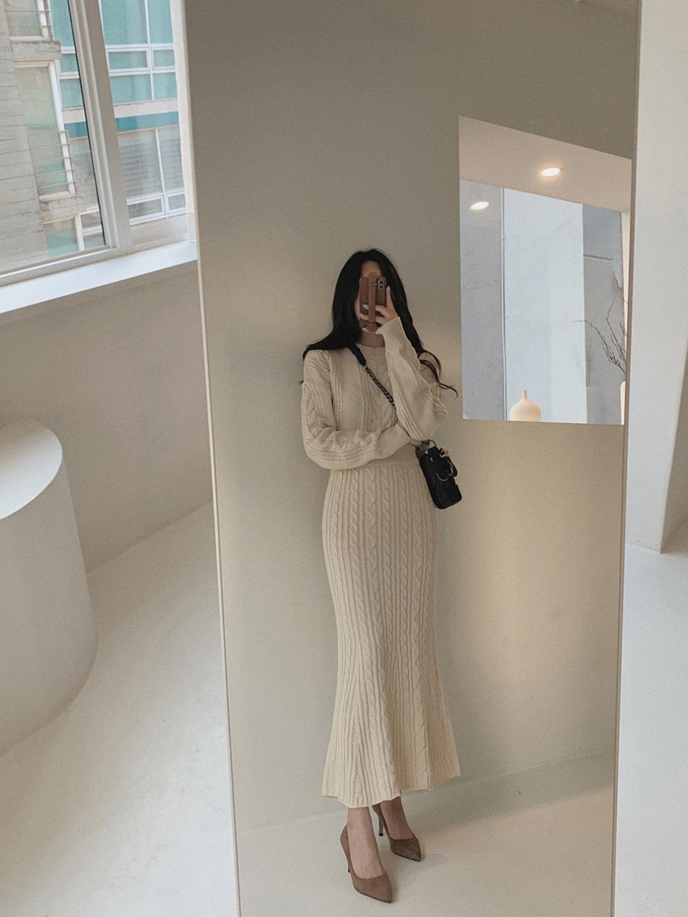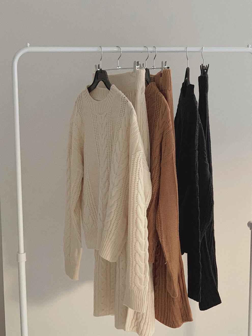 한국풍 시크한 가을 겨울 활용도 높은 트렌디한 루즈핏 스웨터 상의+니트 머메이드 스커트 투피스 세트스토어 가기