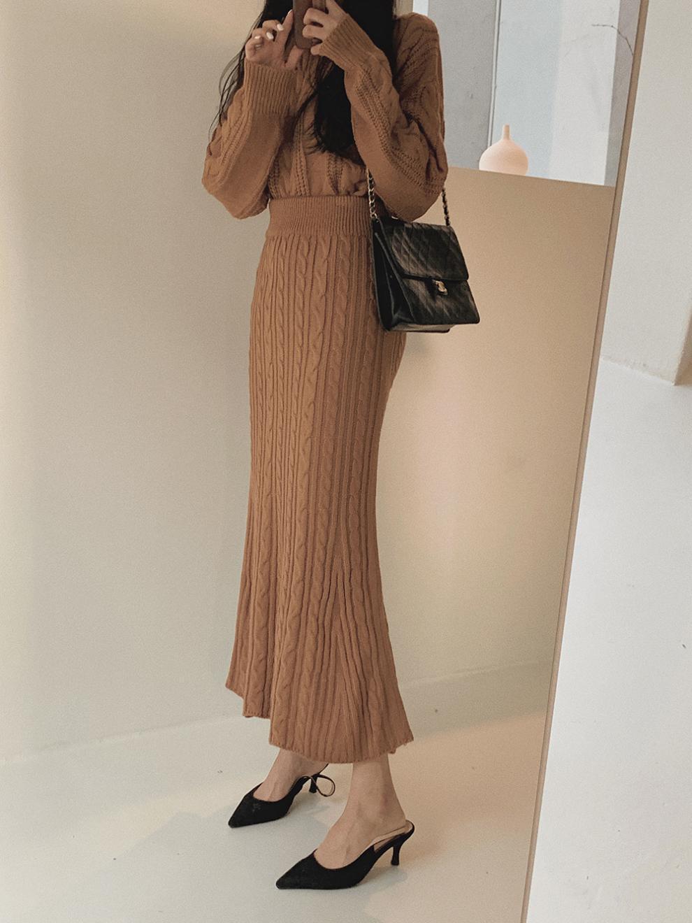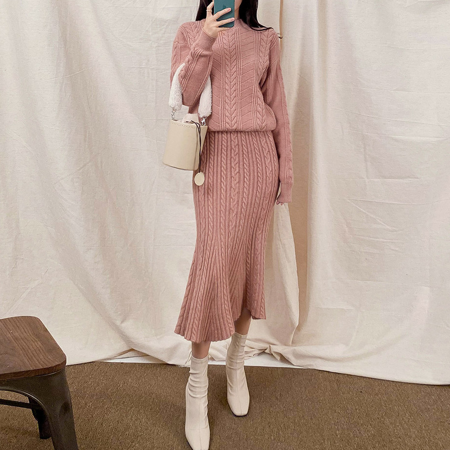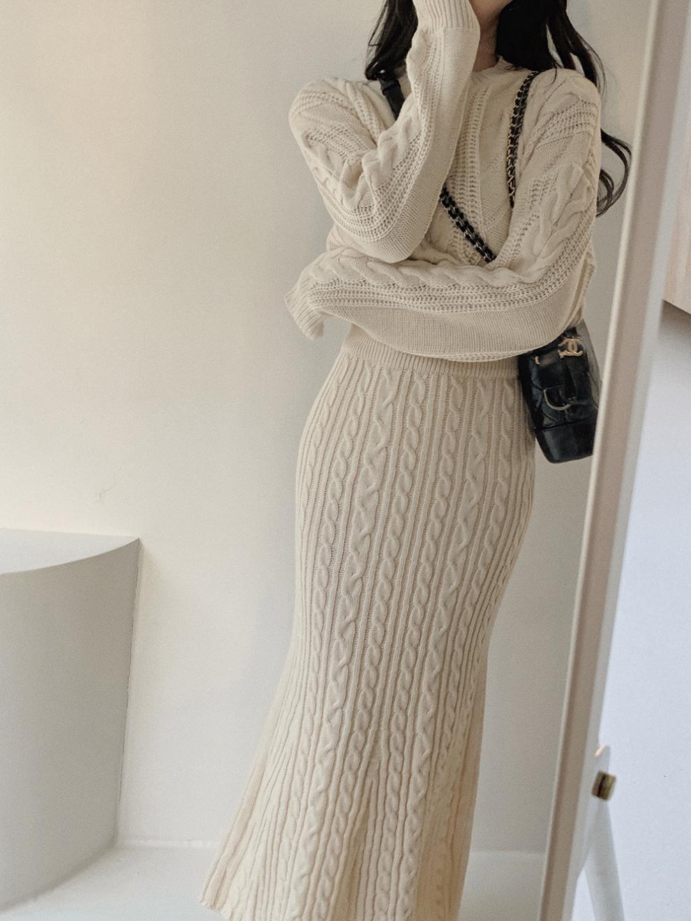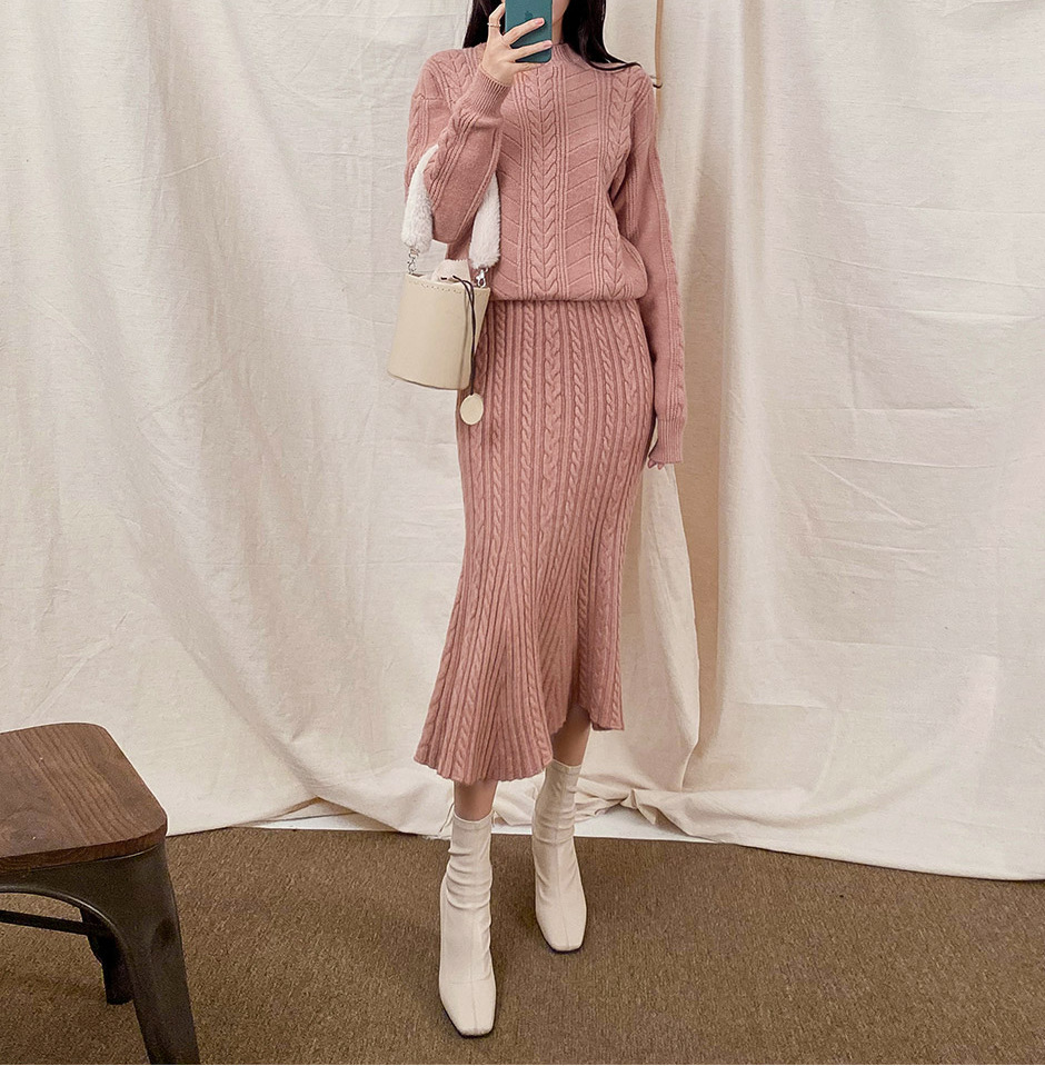 한국풍 시크한 가을 겨울 활용도 높은 트렌디한 루즈핏 스웨터 상의+니트 머메이드 스커트 투피스 세트