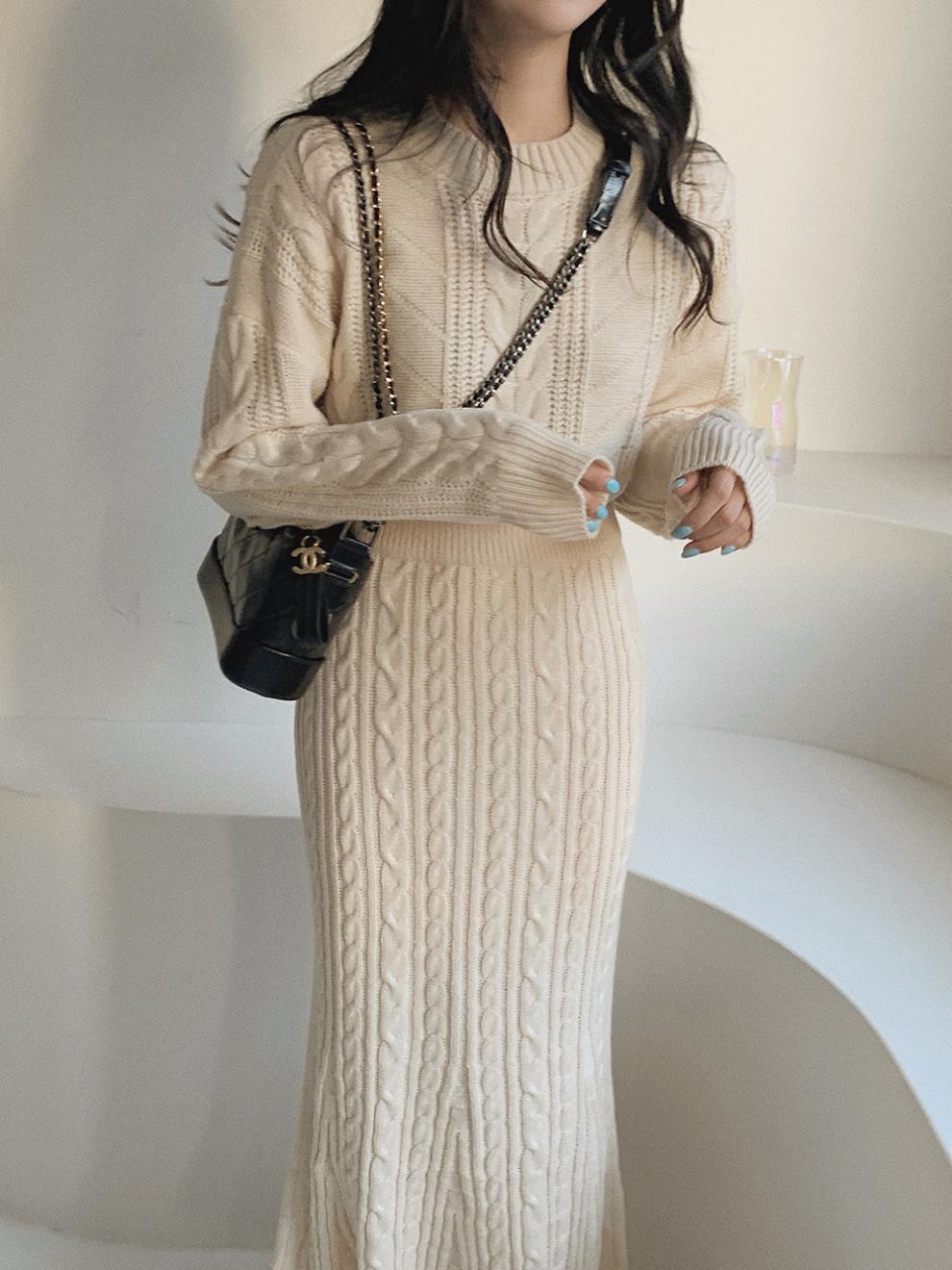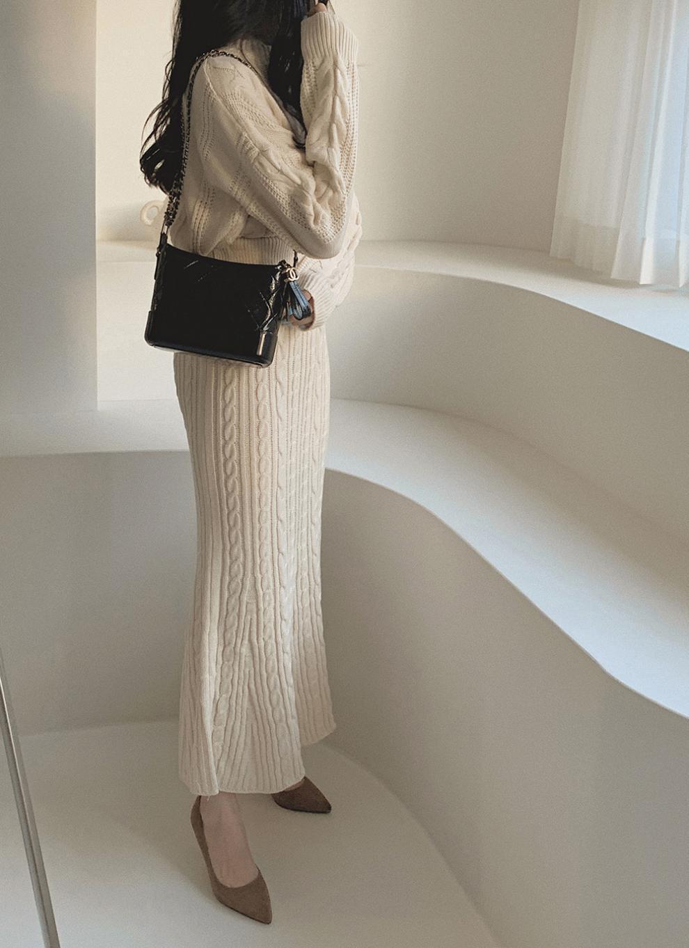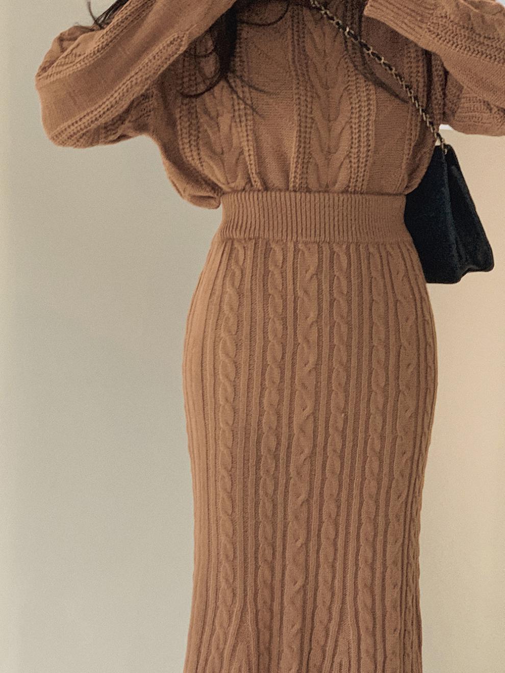 한국풍 시크한 가을 겨울 활용도 높은 트렌디한 루즈핏 스웨터 상의+니트 머메이드 스커트 투피스 세트