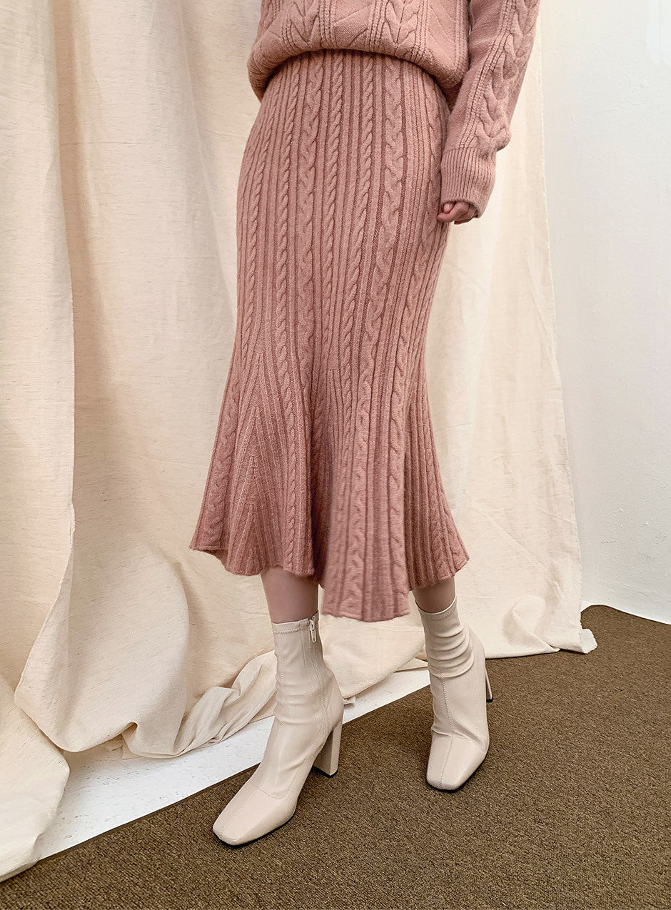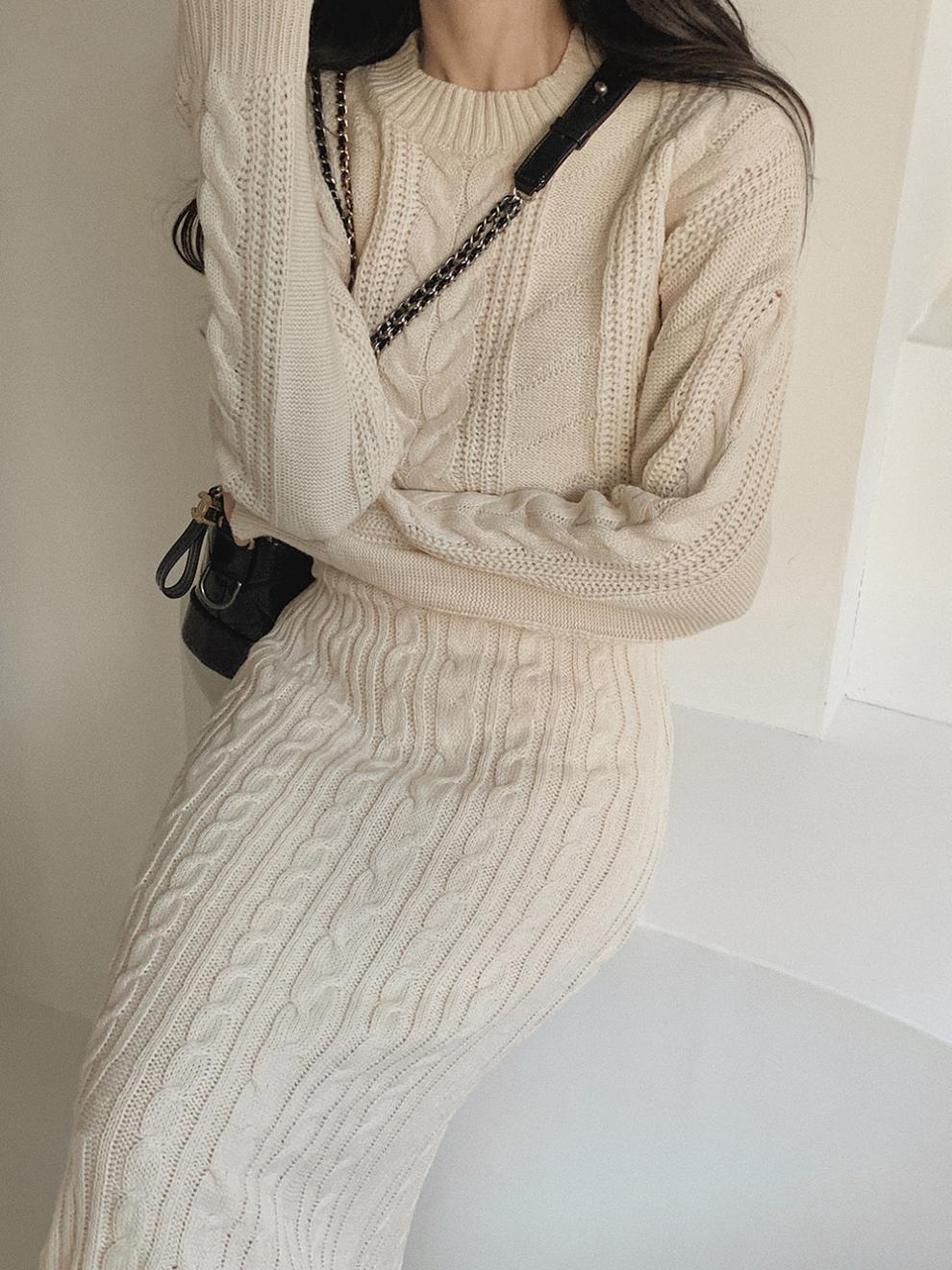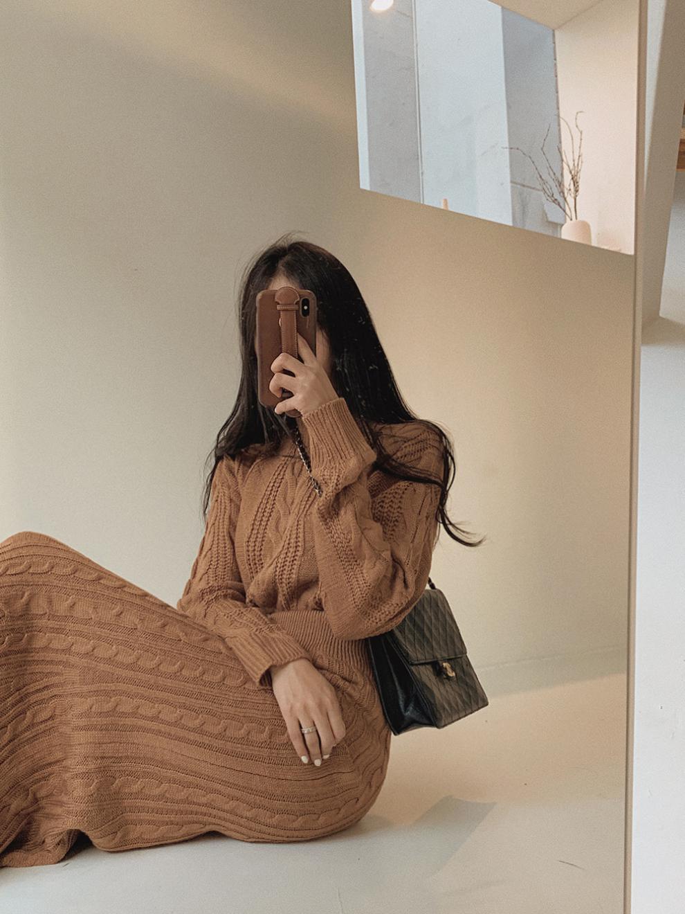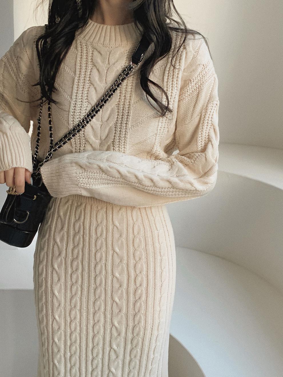 한국풍 시크한 가을 겨울 활용도 높은 트렌디한 루즈핏 스웨터 상의+니트 머메이드 스커트 투피스 세트