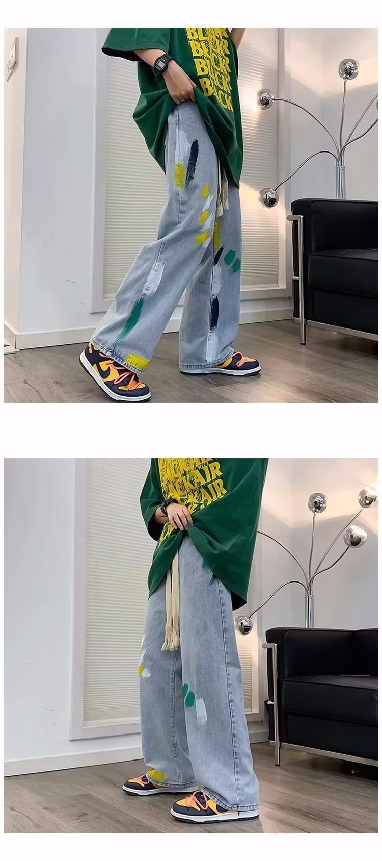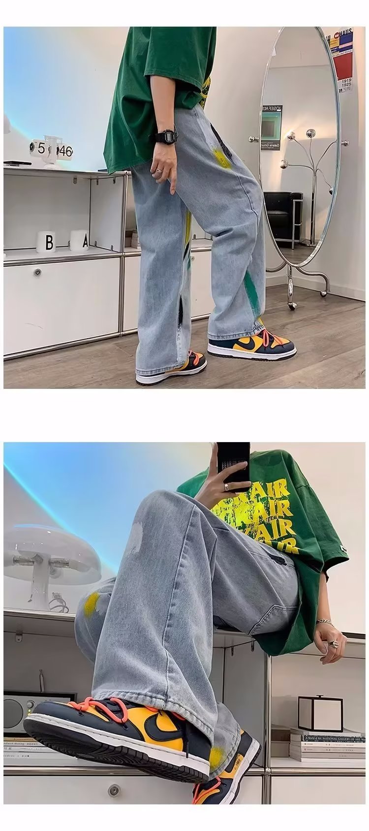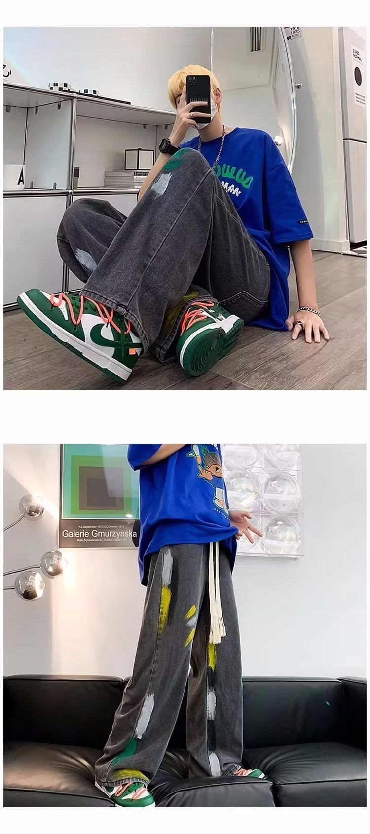 봄과 가을 하이 스트리트 분위기 와이드 레그 청바지 남자의 느슨한 스트레이트 모든 매치 유행 잘 생긴 바지 쉐이크 톤 같은 스타일