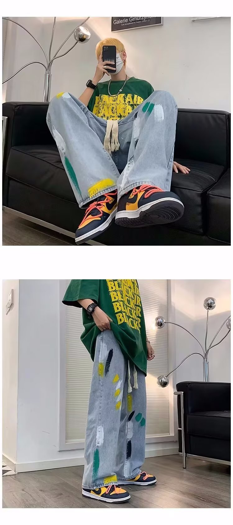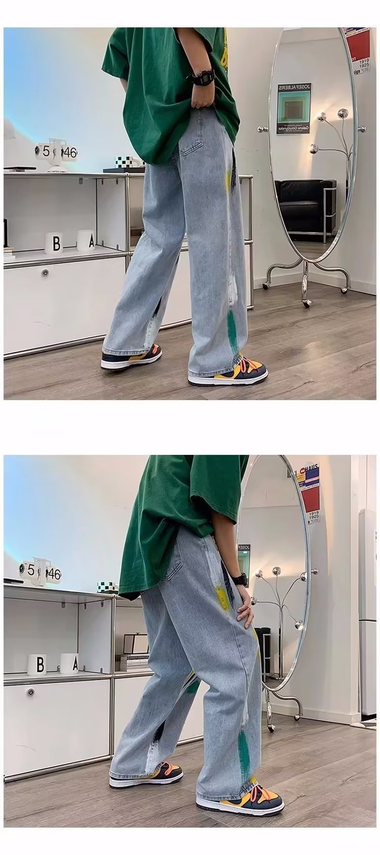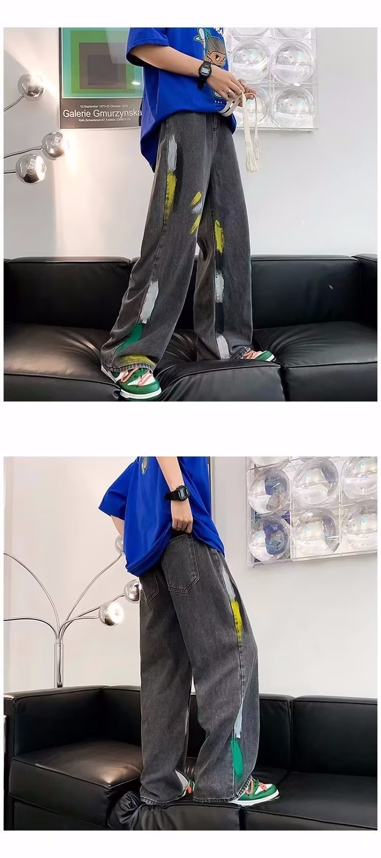 봄과 가을 하이 스트리트 분위기 와이드 레그 청바지 남자의 느슨한 스트레이트 모든 매치 유행 잘 생긴 바지 쉐이크 톤 같은 스타일