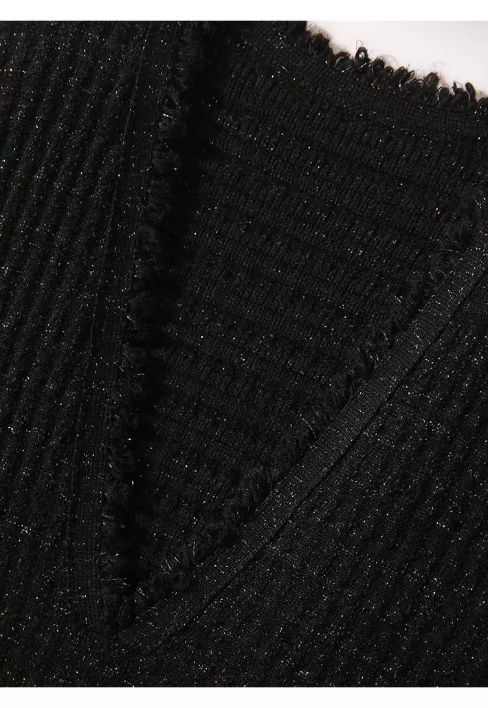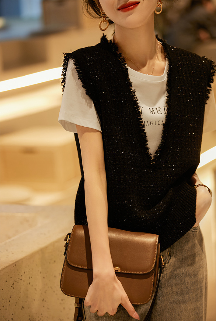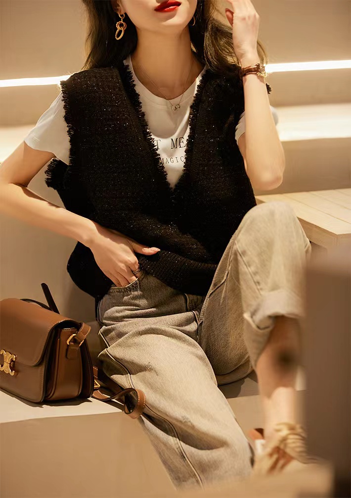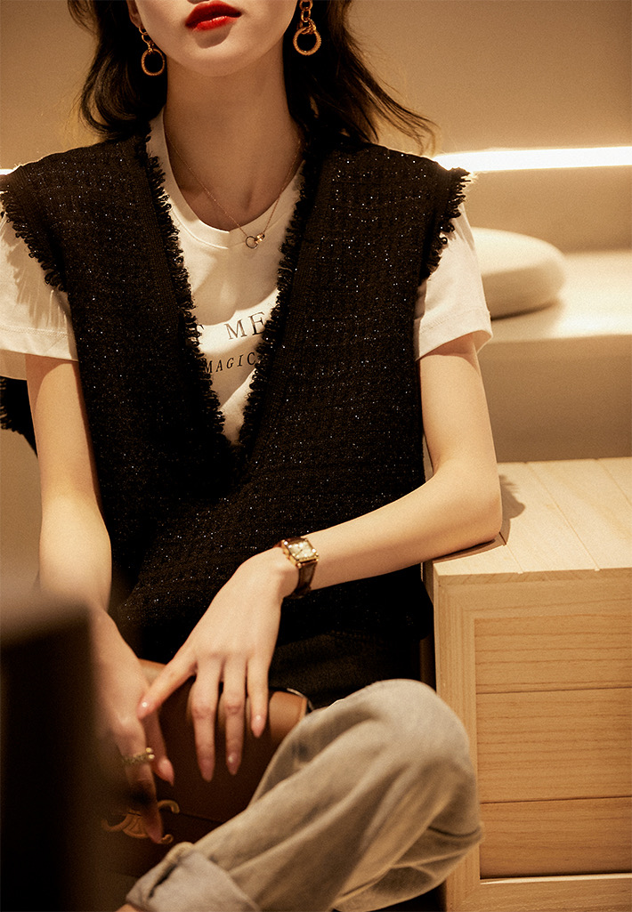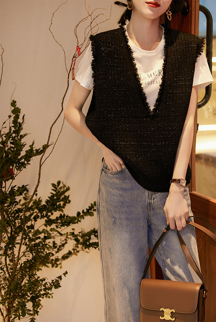 샤넬 스타일 술 밝은 실크 풀오버 V-넥 니트 조끼 여성용 느슨한 스택 민소매 울 조끼 스웨터 조끼