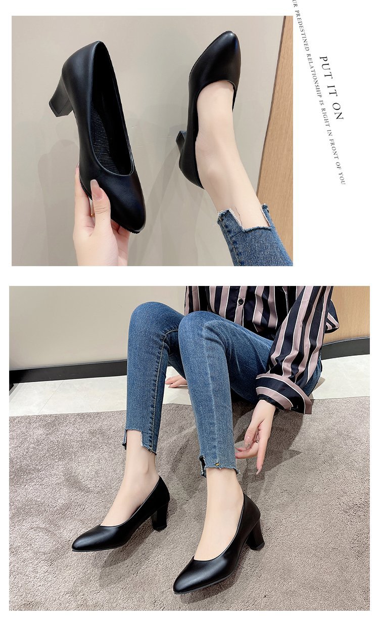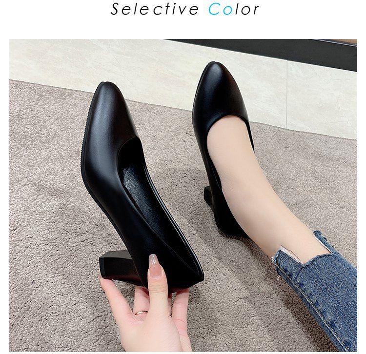 2023 두꺼운 굽 뾰족한 전문 여성 신발 모든 매치 작업 신발 여성용 새로운 하이힐 단층 신발 여성용 블랙 로우 힐 가죽 신발스토어 가기