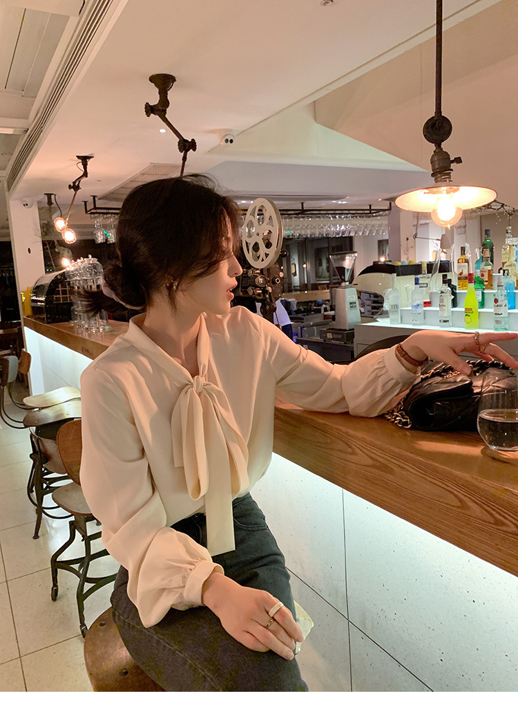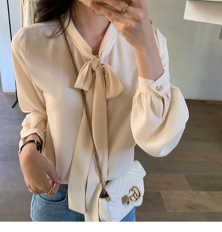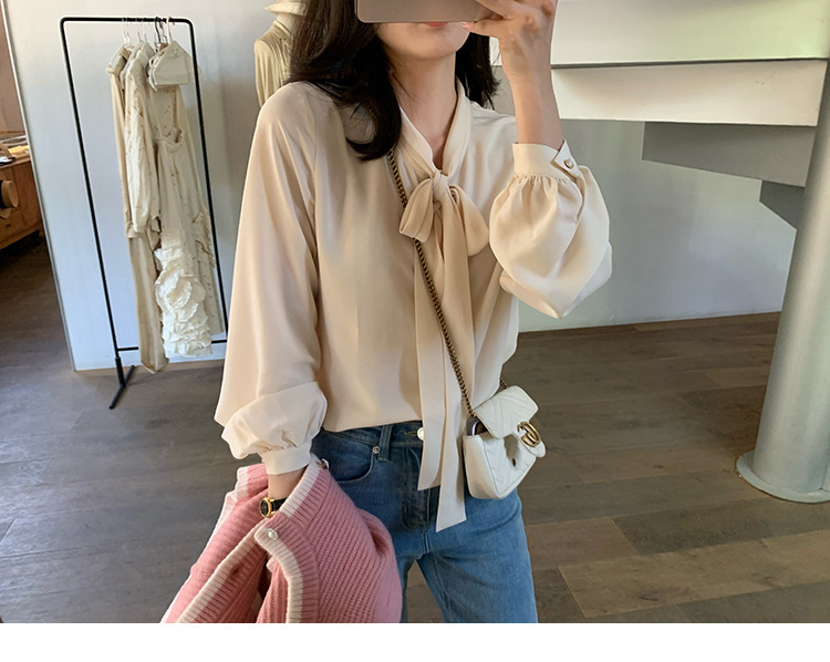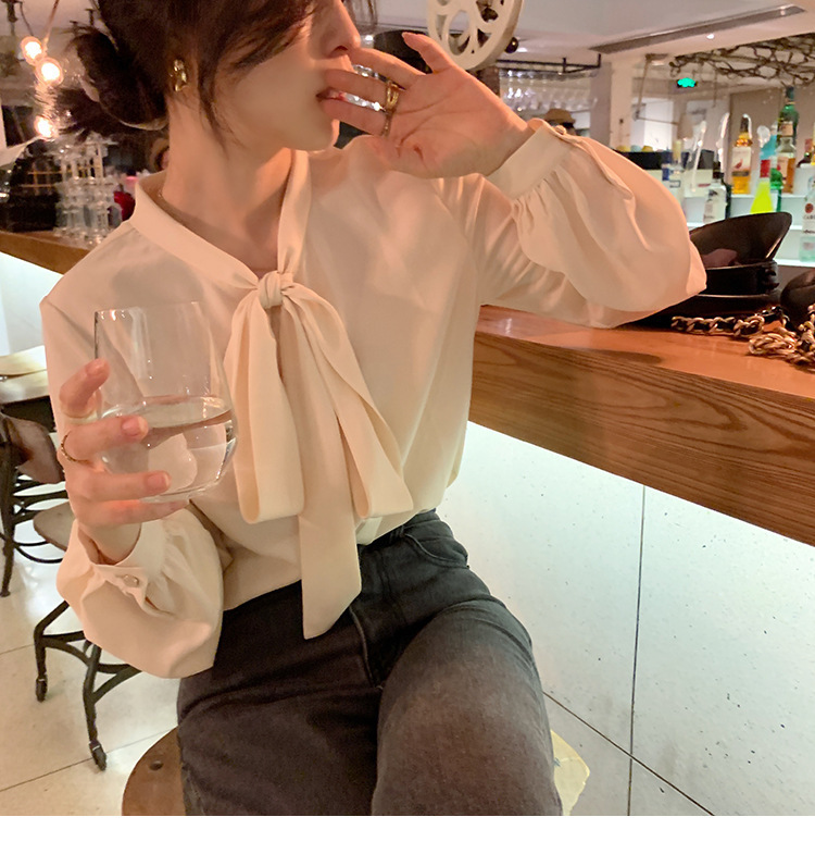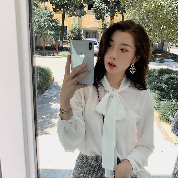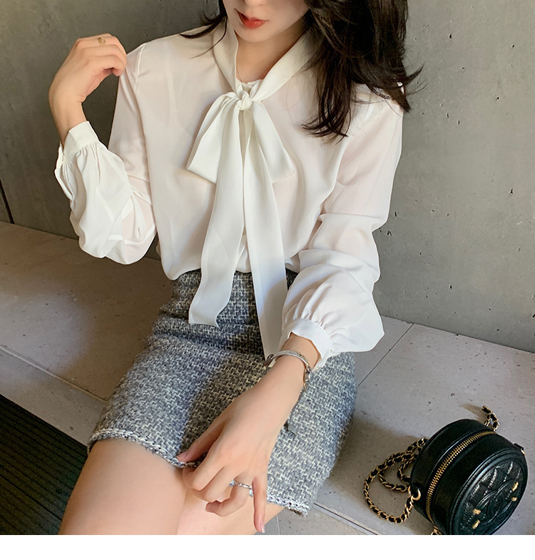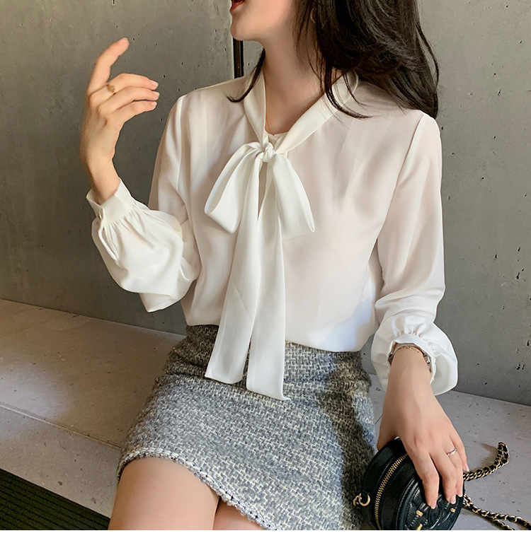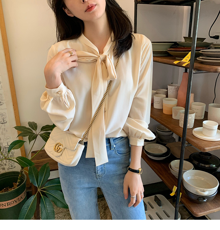 2023 새로운 여성의 부드러운 우아한 디자인 감각 느슨한 틈새 보우 화이트 랜턴 슬리브 여성용 느슨한 셔츠스토어 가기