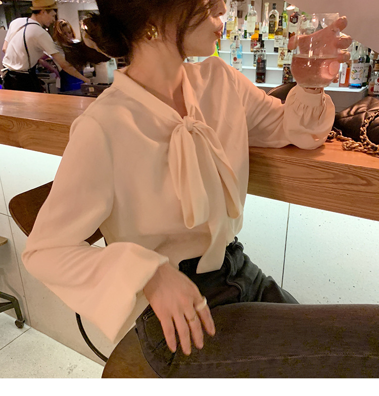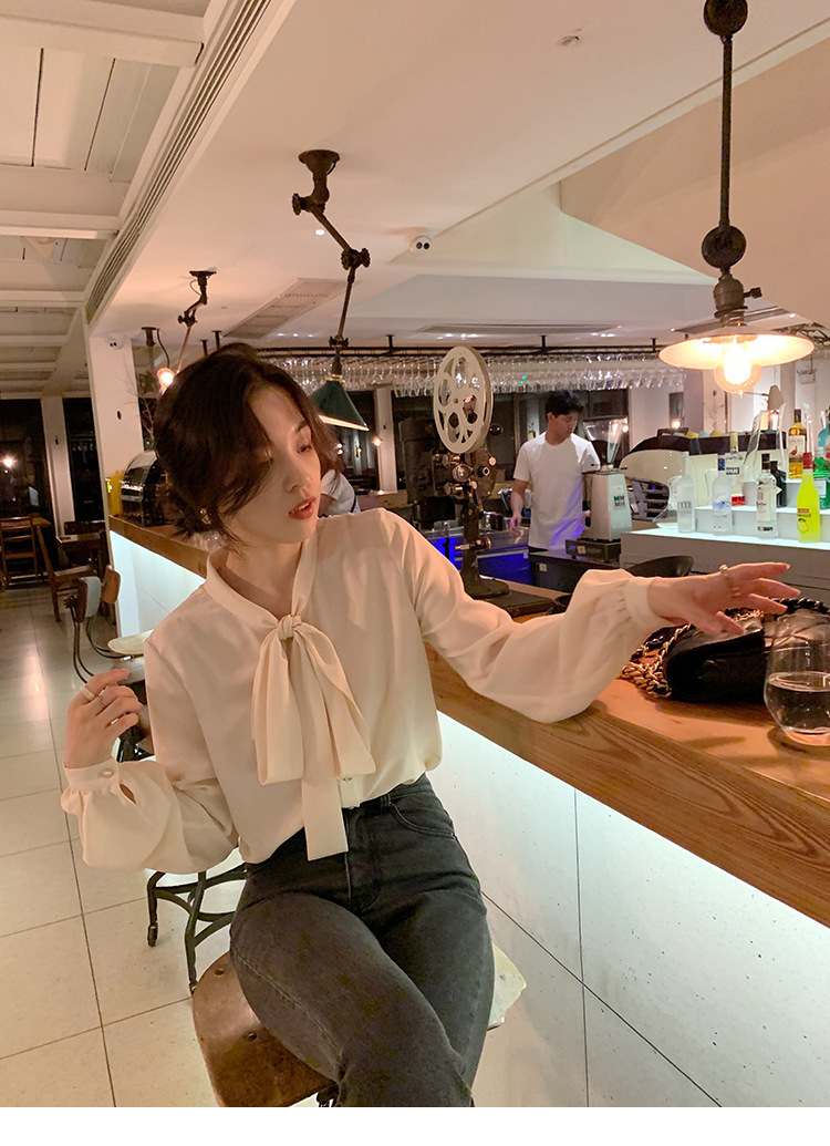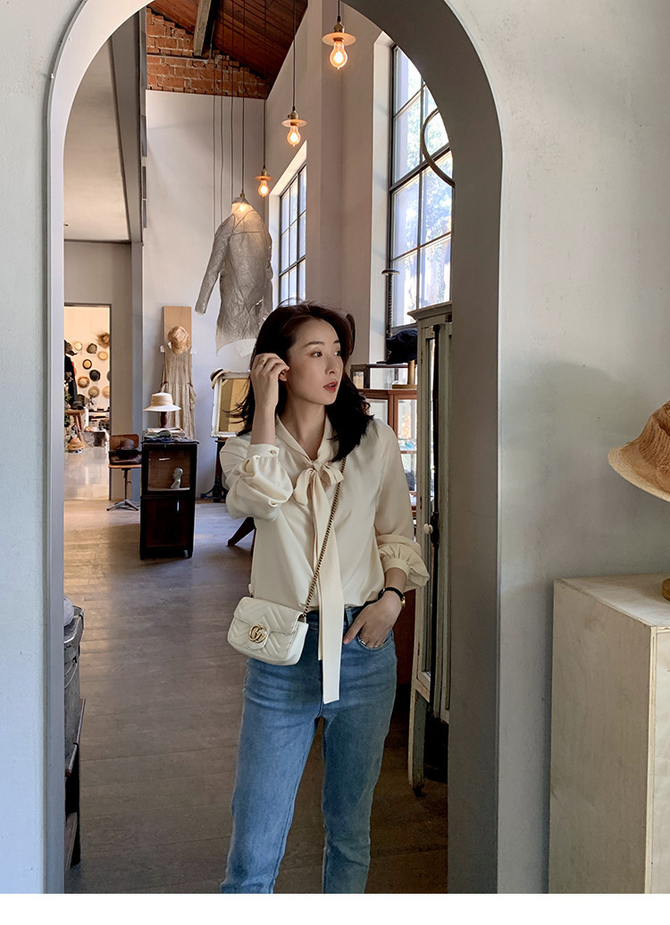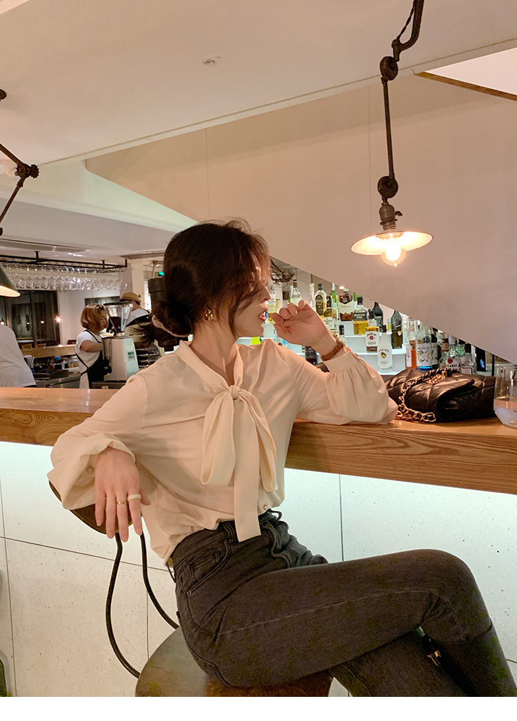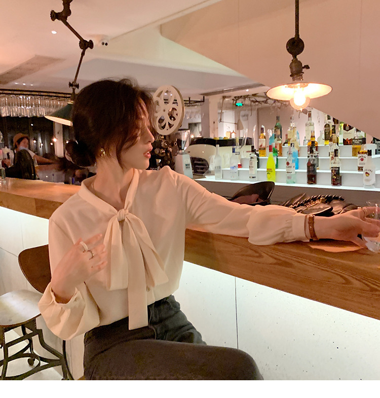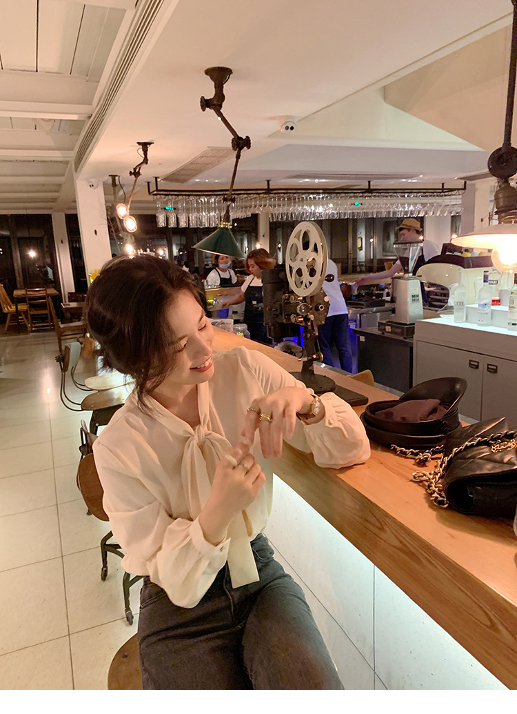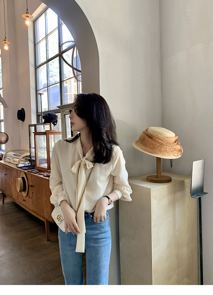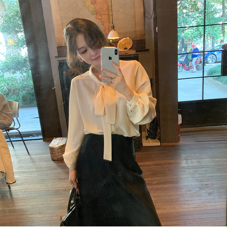 2023 새로운 여성의 부드러운 우아한 디자인 감각 느슨한 틈새 보우 화이트 랜턴 슬리브 여성용 느슨한 셔츠스토어 가기