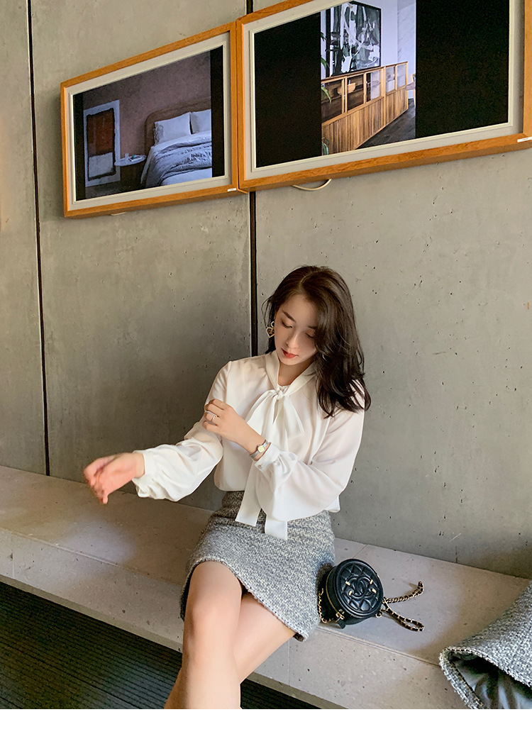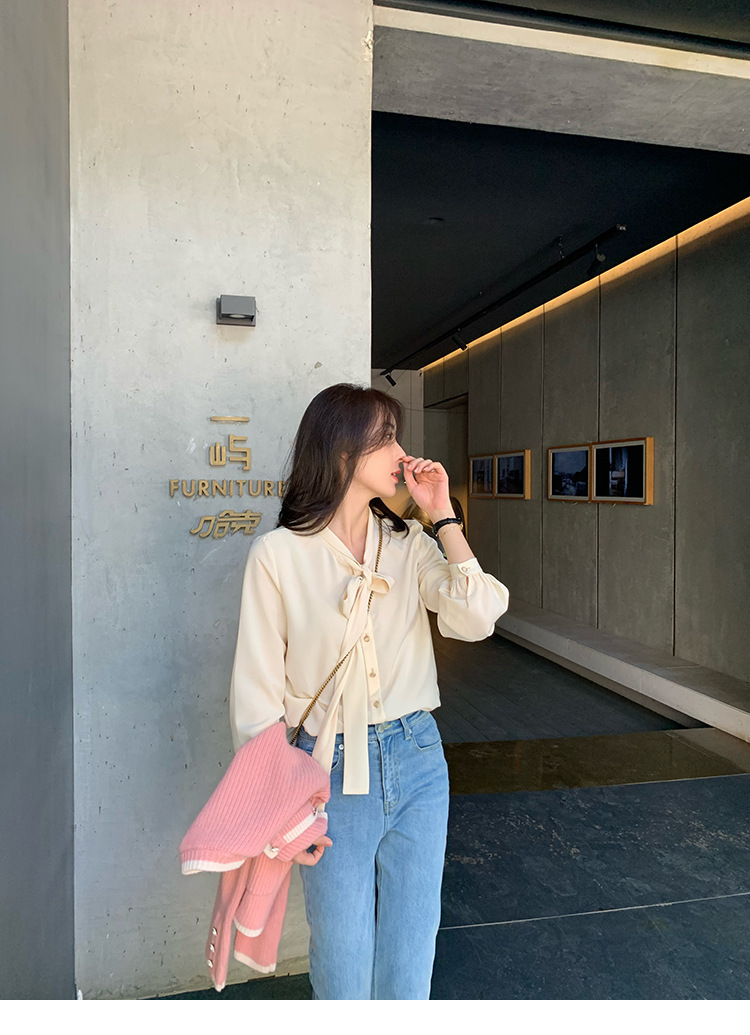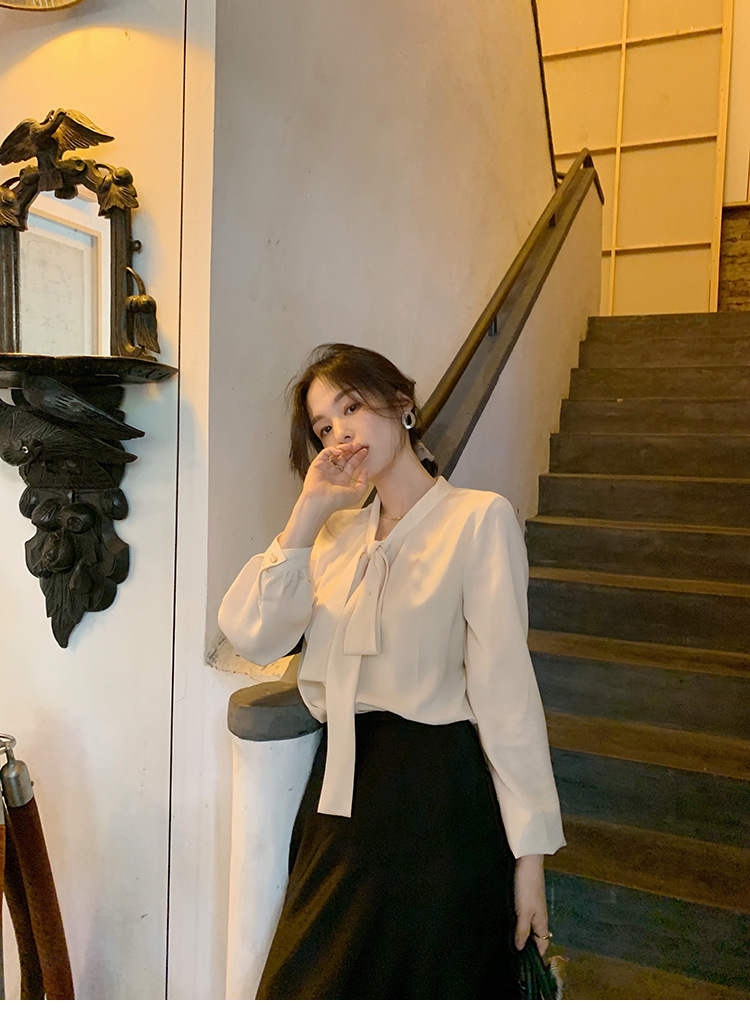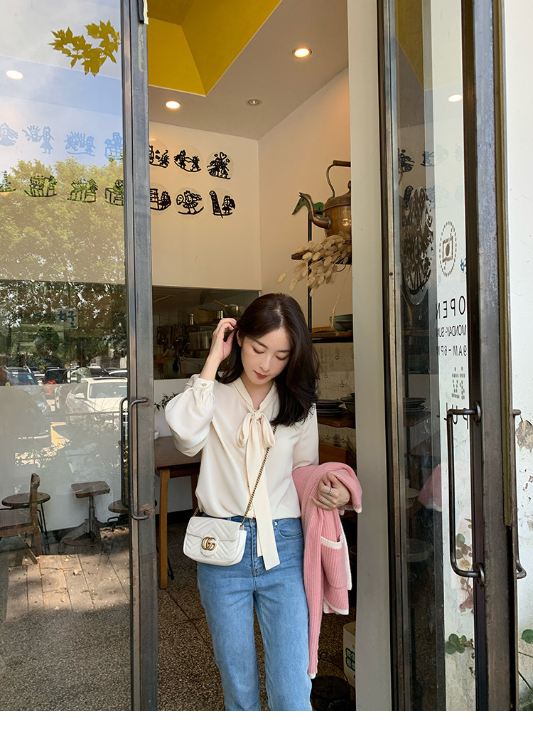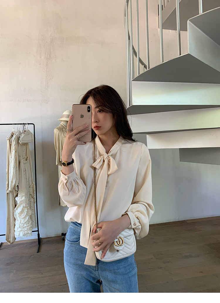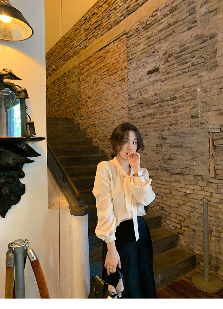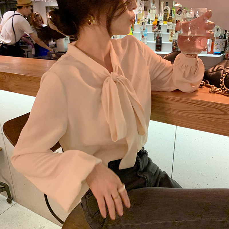 2023 새로운 여성의 부드러운 우아한 디자인 감각 느슨한 틈새 보우 화이트 랜턴 슬리브 여성용 느슨한 셔츠스토어 가기