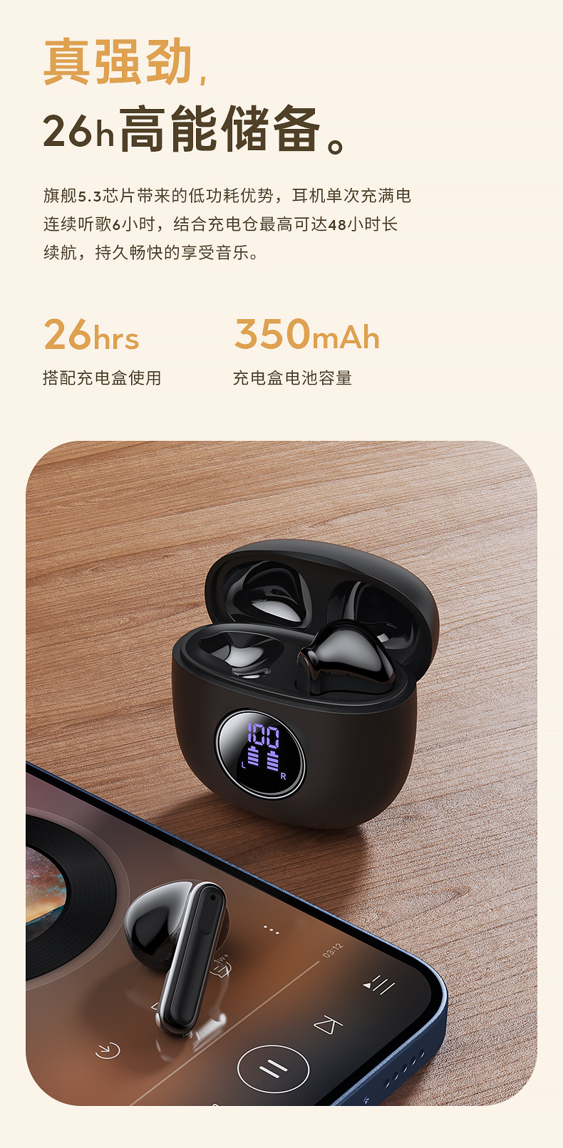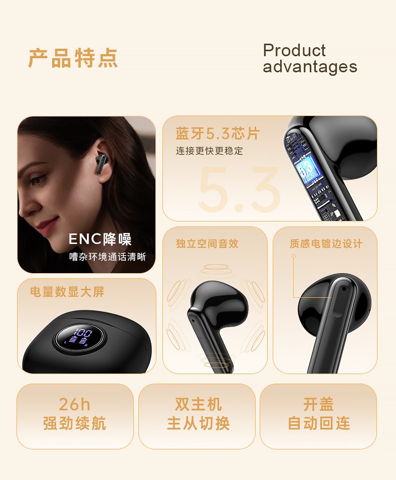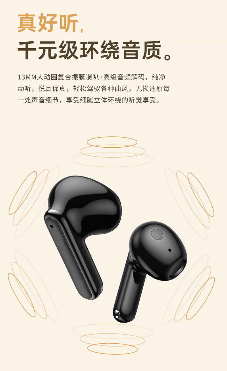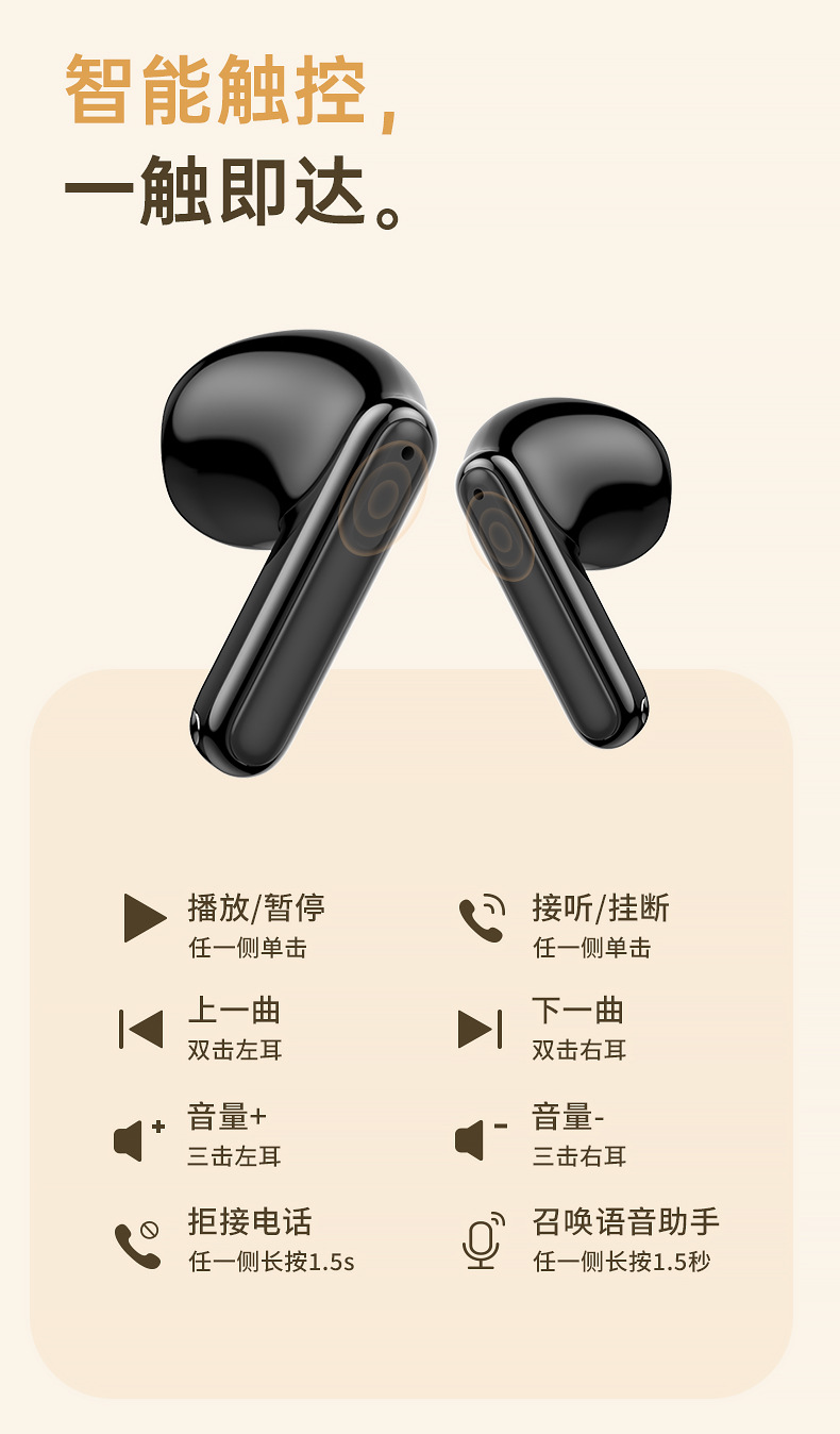【功能】双唛ENC通话降噪+数显电量+游戏超低延迟+触控操作/召唤Siri/上下曲/加减音量/播放暂停,拨打/接听拒绝电话