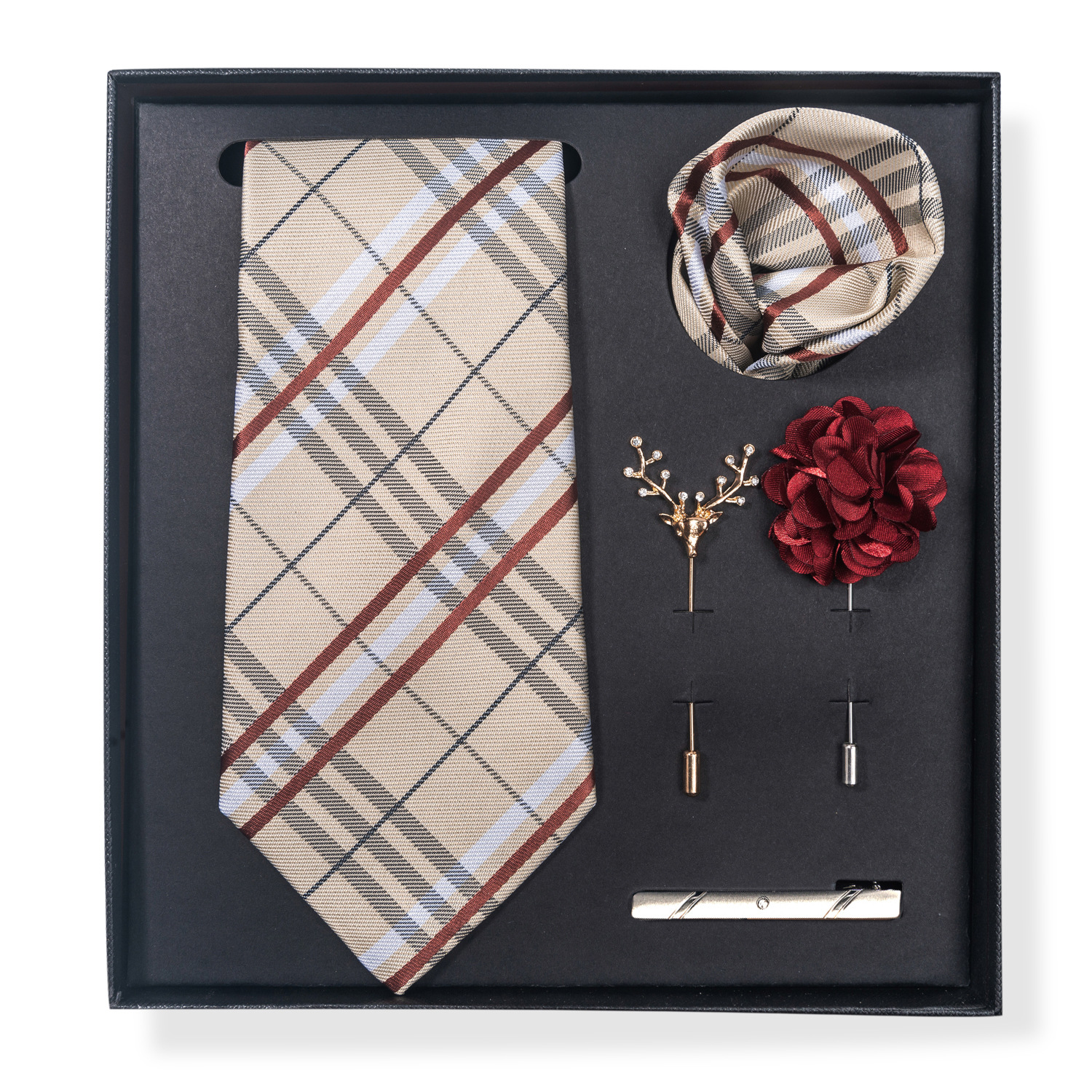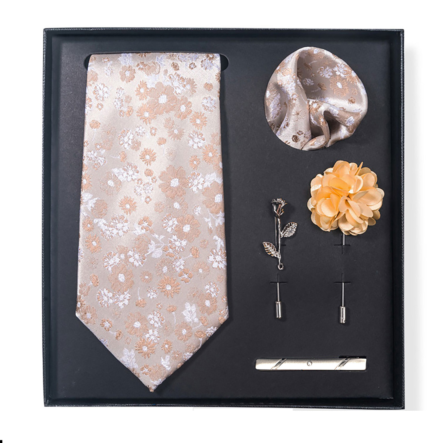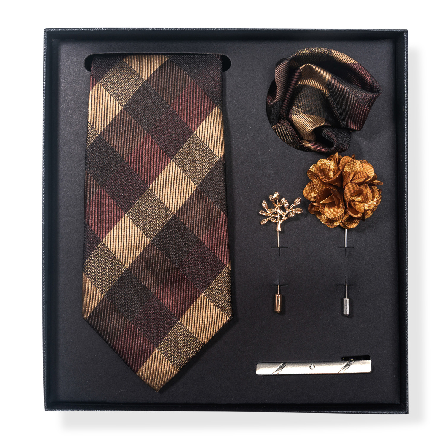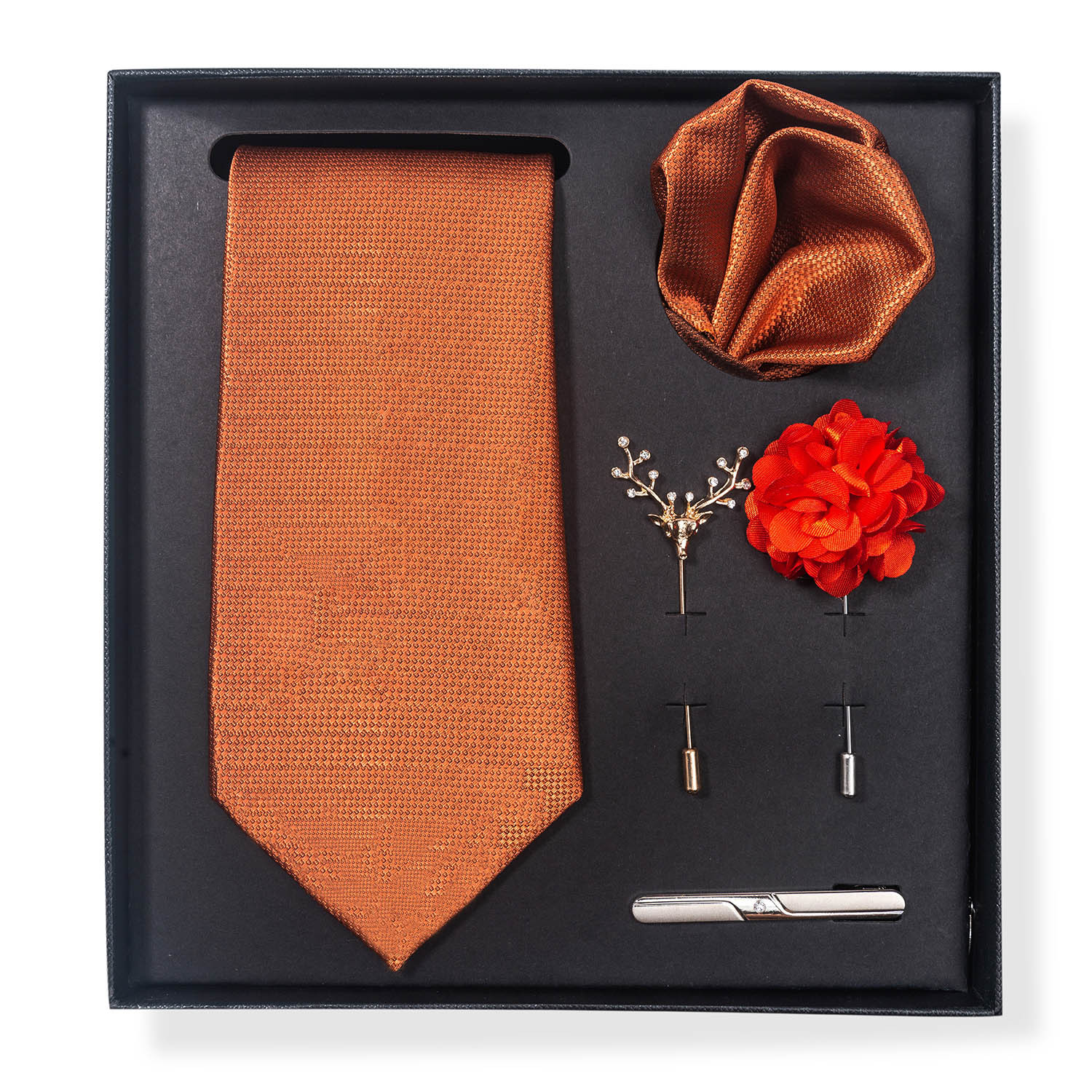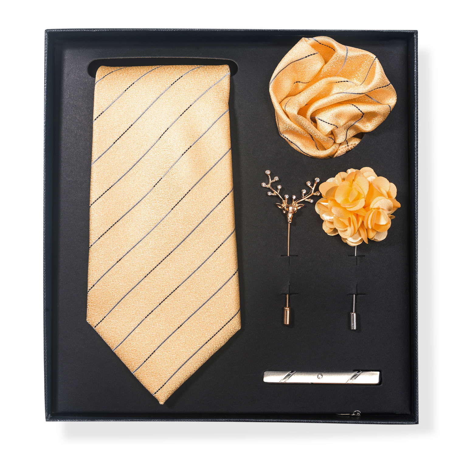 남성용 트렌디한 단색 스트라이프 캐슈넛 넥타이 6종 세트 선물 상자, 스카프, 넥타이핀, 브로치 세트