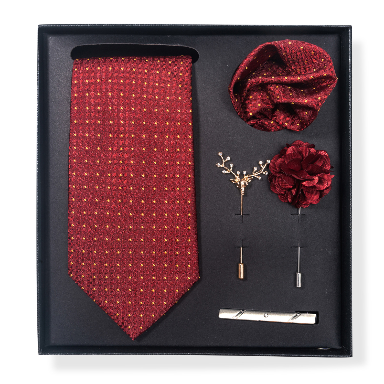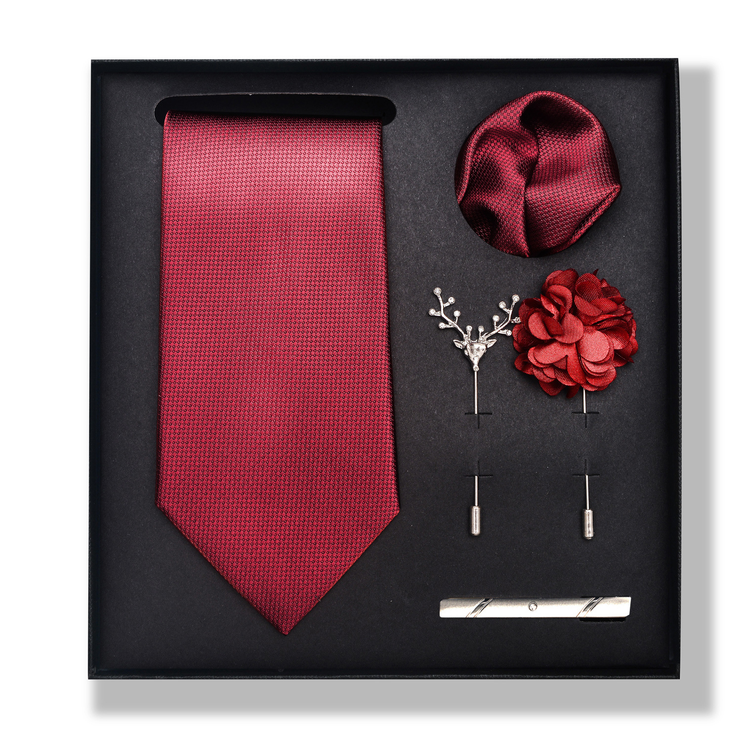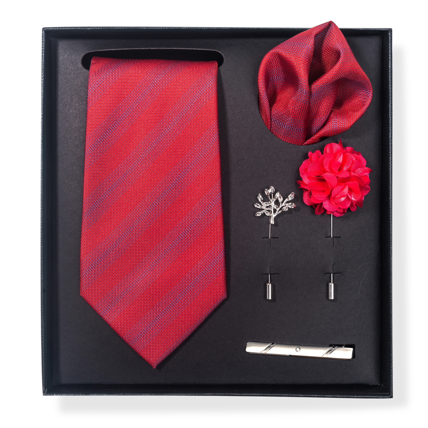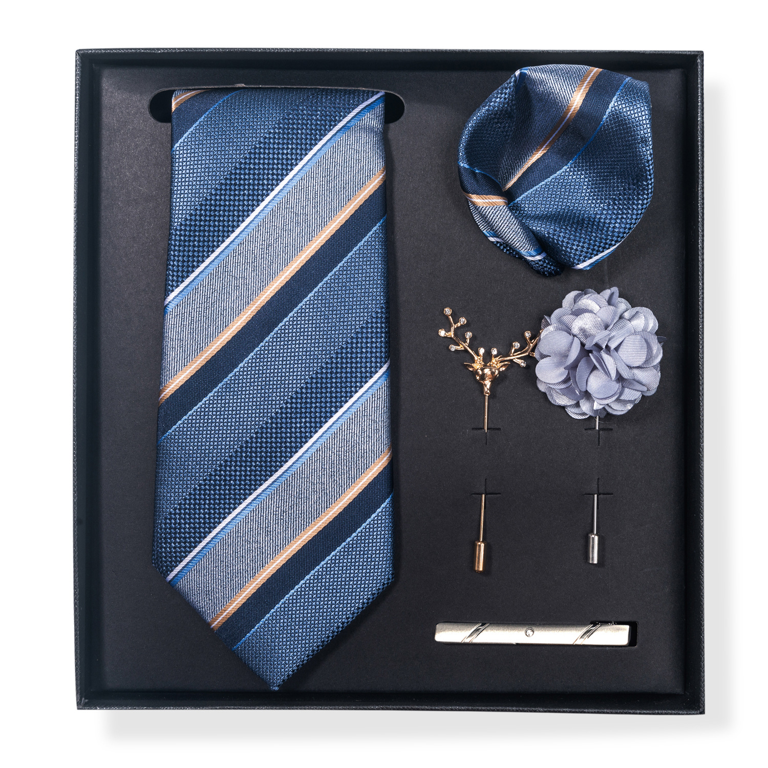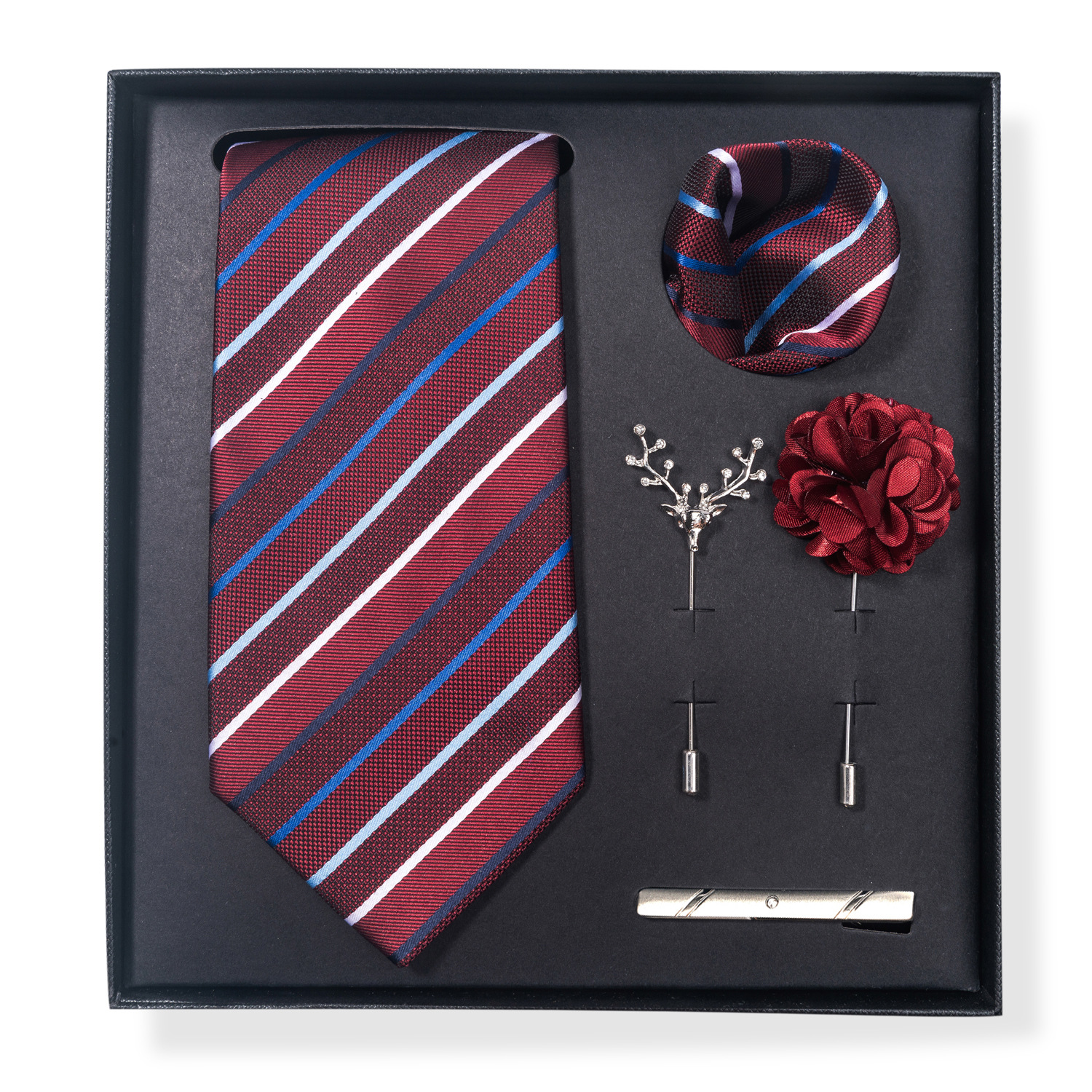 남성용 트렌디한 단색 스트라이프 캐슈넛 넥타이 6종 세트 선물 상자, 스카프, 넥타이핀, 브로치 세트