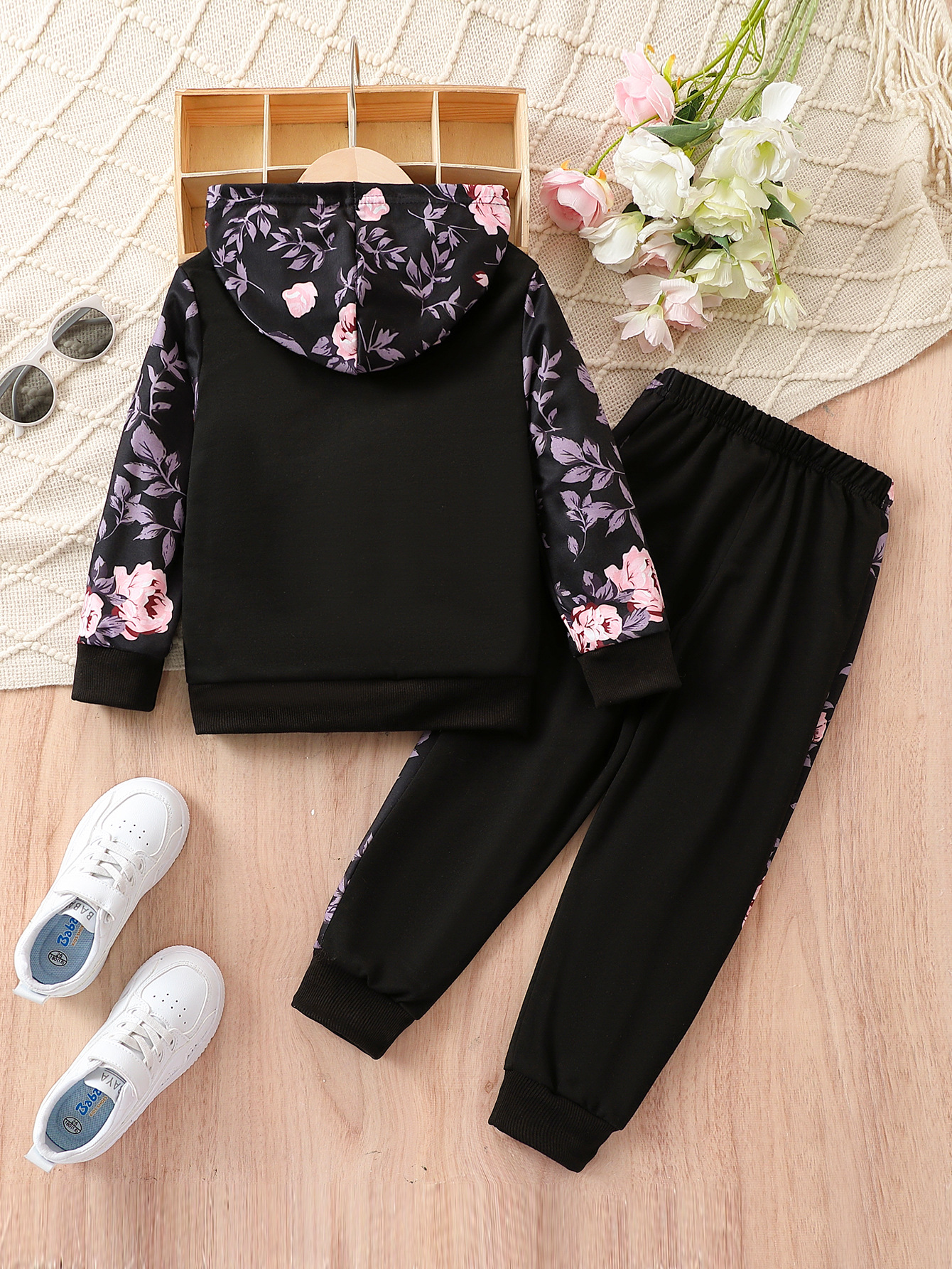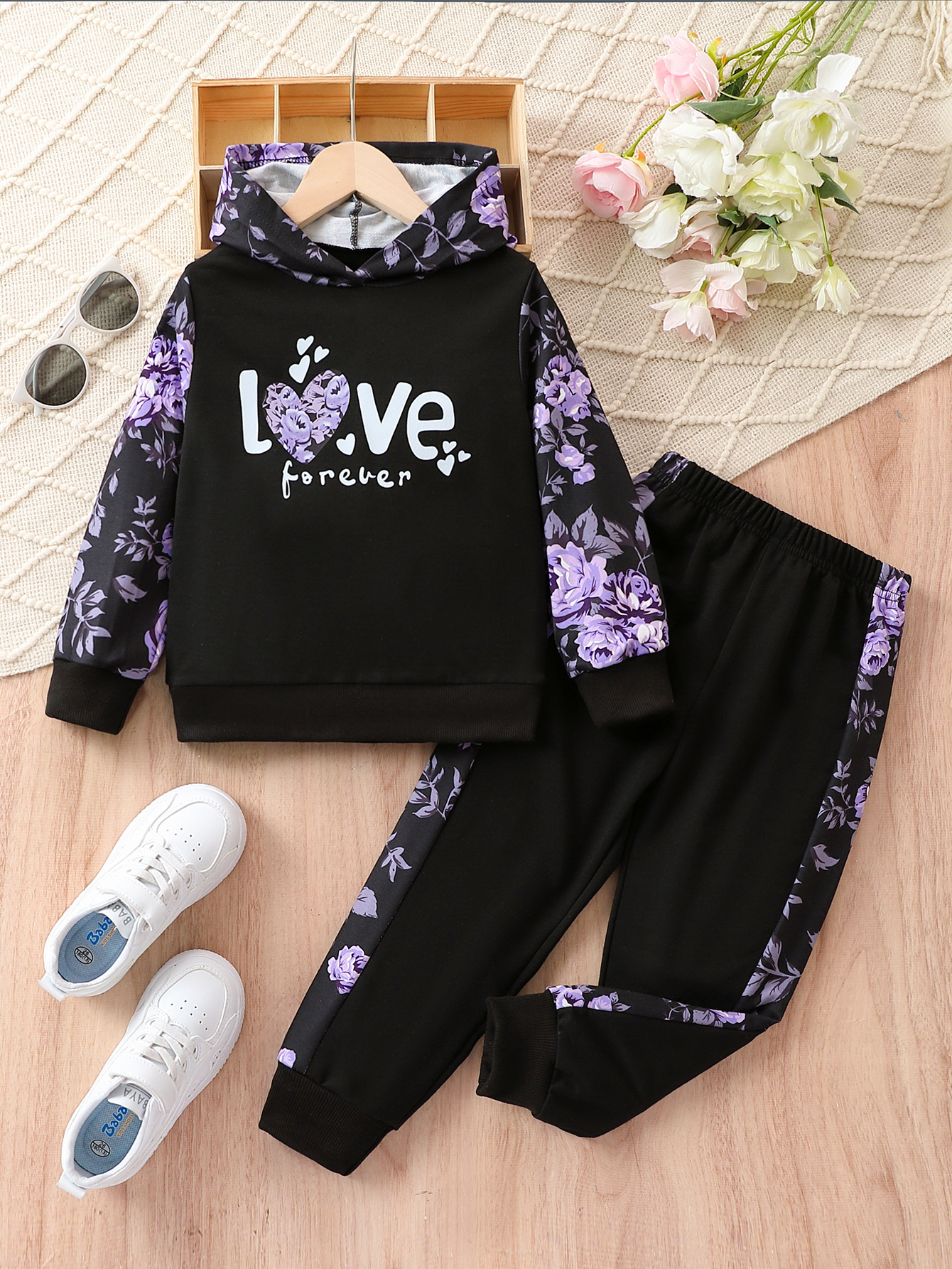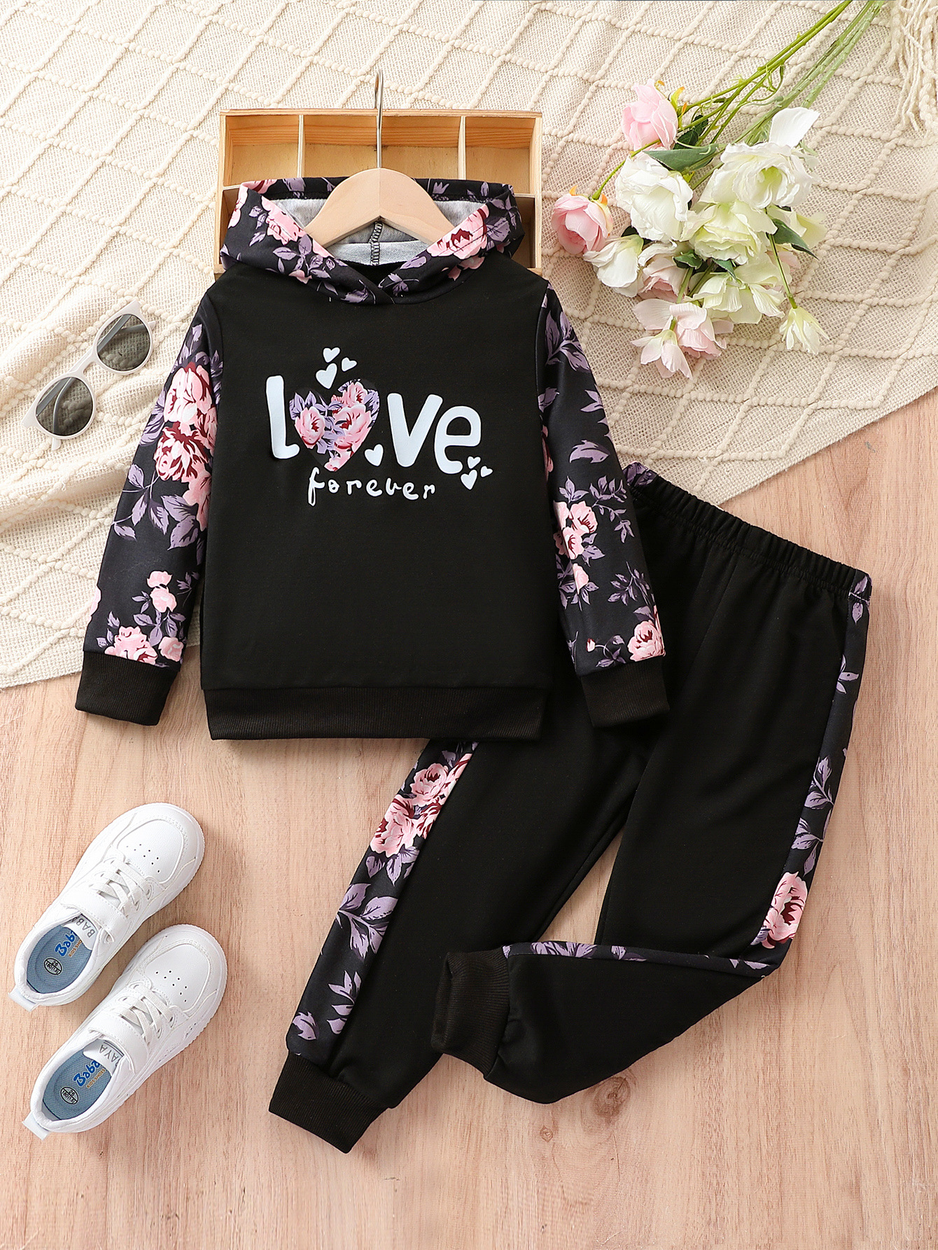 대외 무역 도매 여자 패션 긴 소매 스웨터 두 조각 봄과 가을 귀여운 만화 편지 패턴 꽃 바지 세트스토어 가기