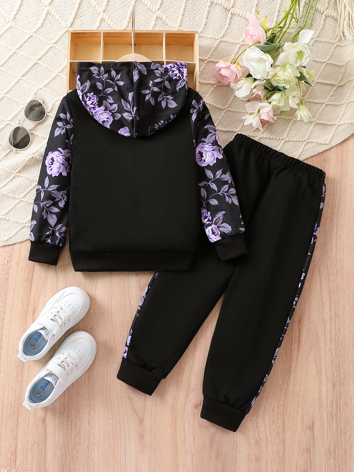 대외 무역 도매 여자 패션 긴 소매 스웨터 두 조각 봄과 가을 귀여운 만화 편지 패턴 꽃 바지 세트
