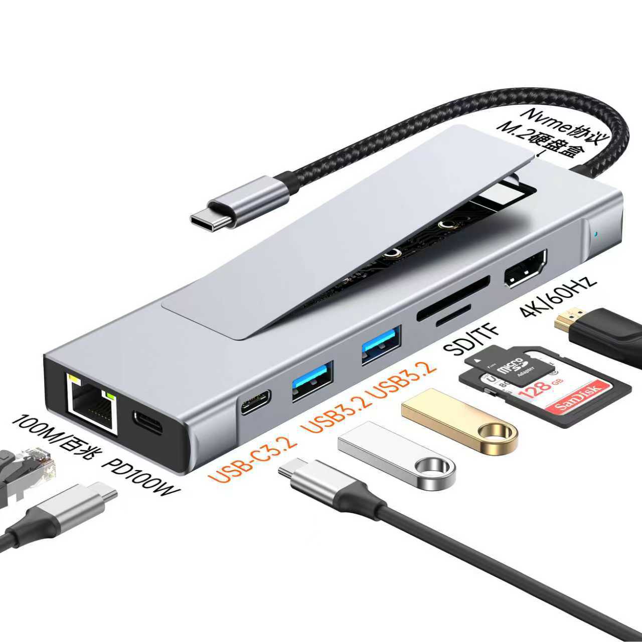 • 8in1【usb3.0*2+usb2.0+pd100w+hdmi+m.2/nvme+sd+tf】