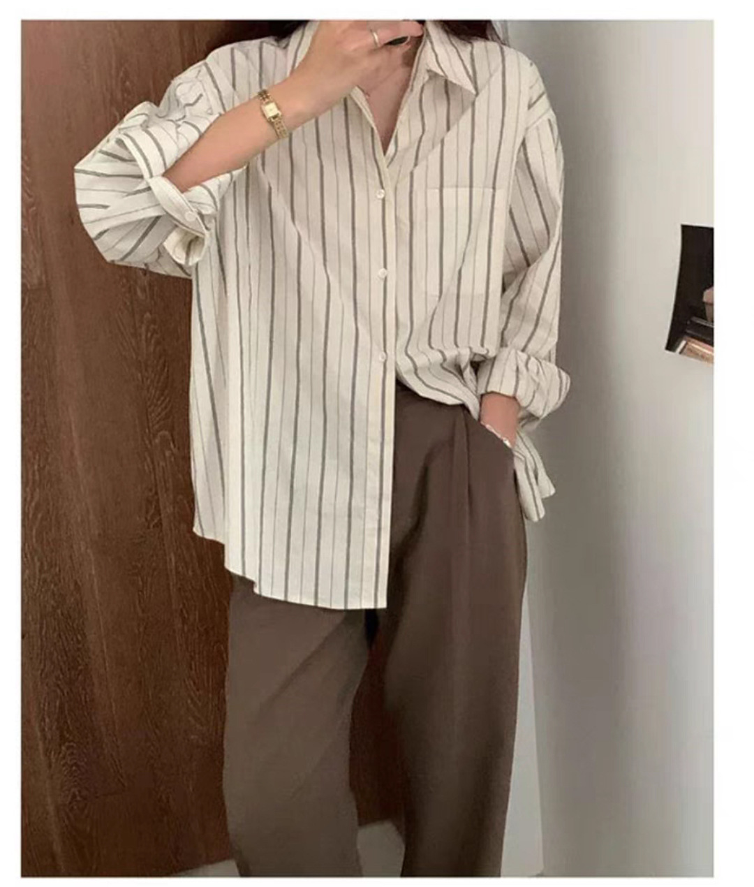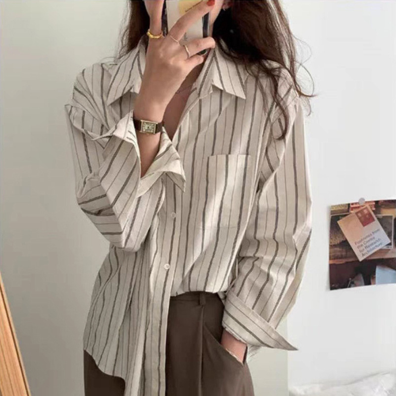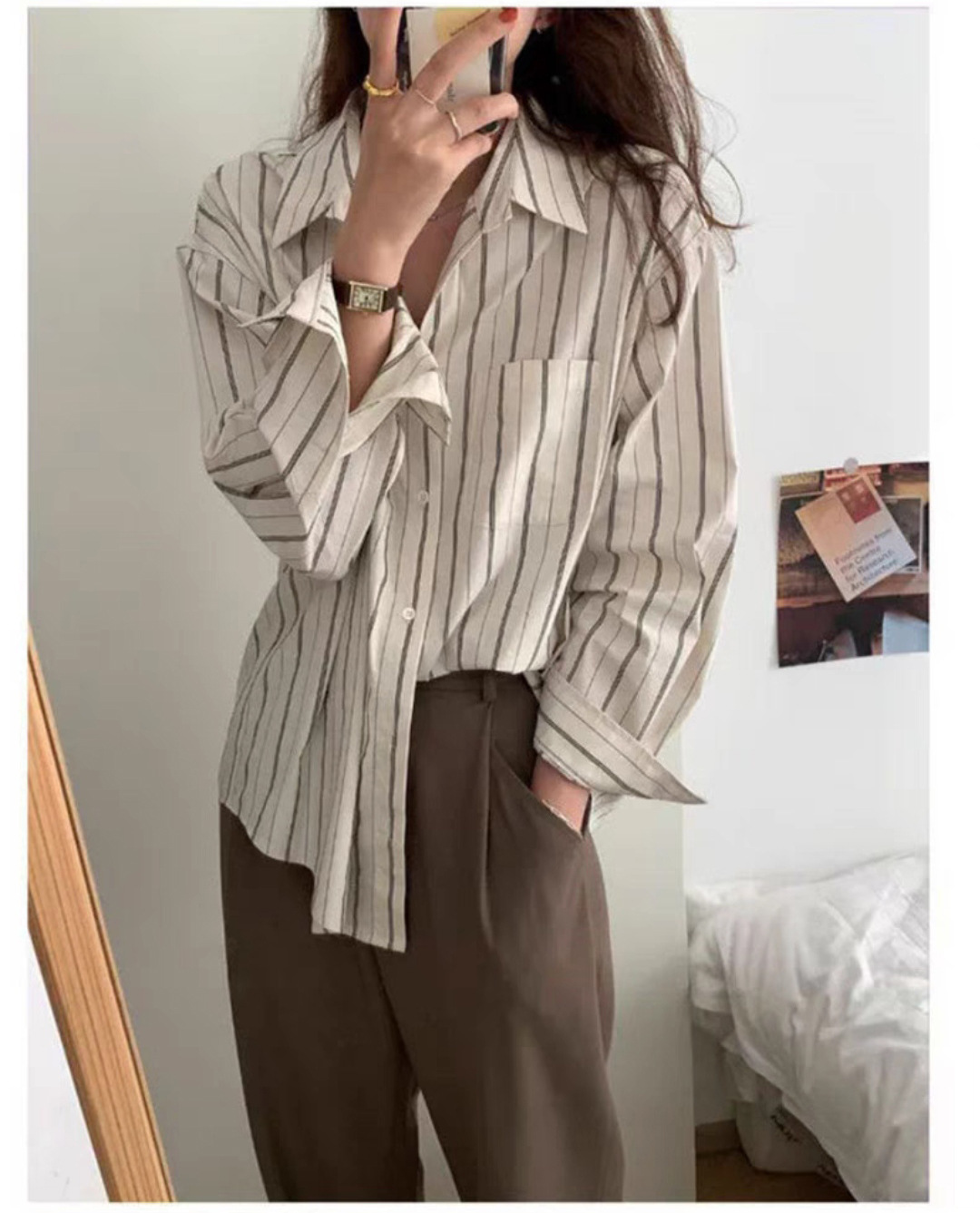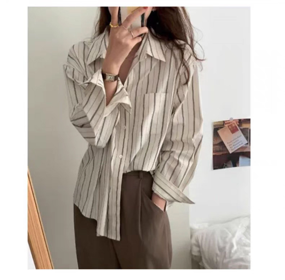 초봄 2025 신상 세로 스트라이프 셔츠 여성 디자인 틈새 긴팔 셔츠 루즈하고 시크한 얇은 탑스토어 가기