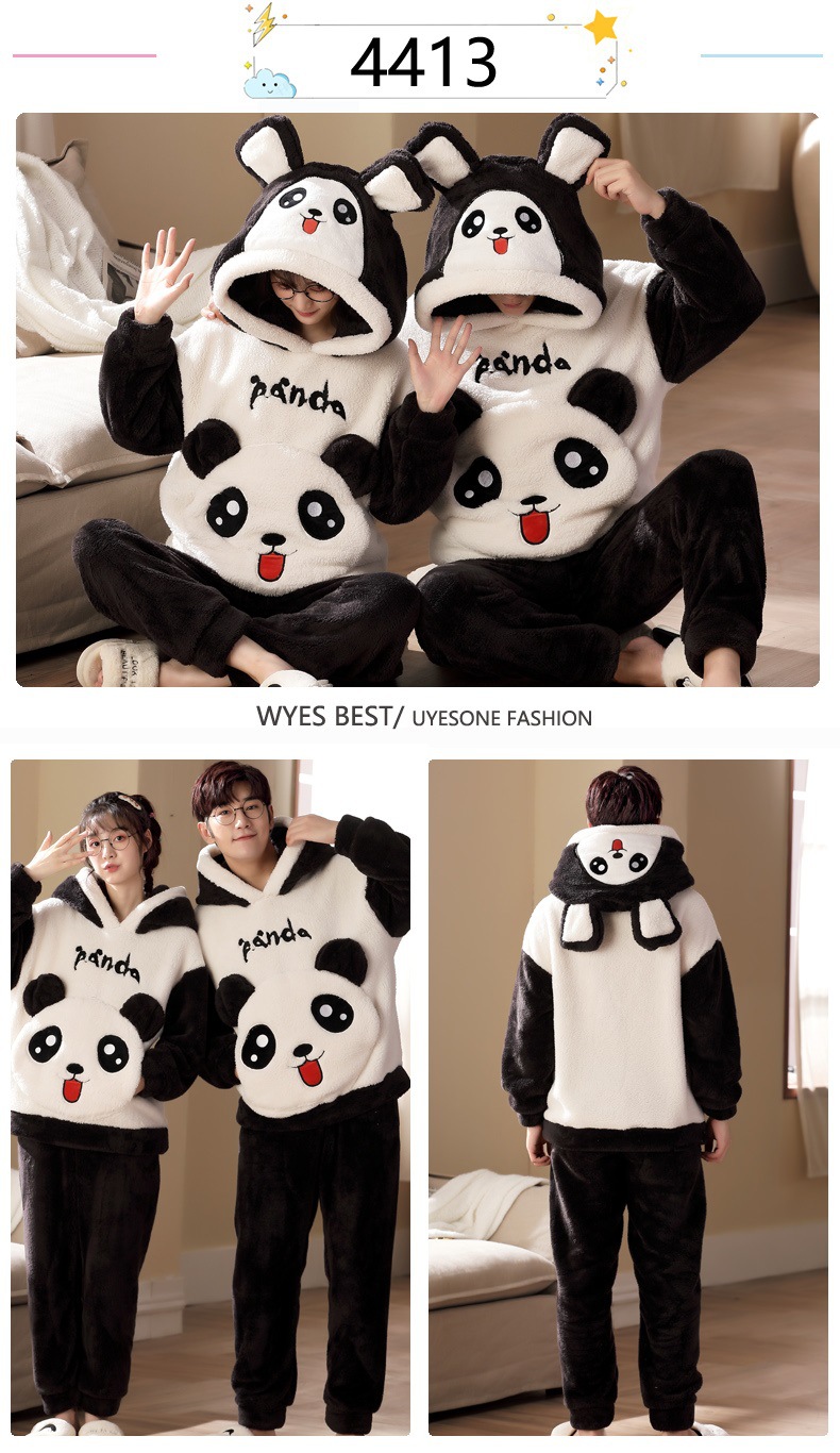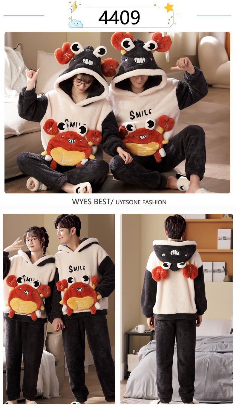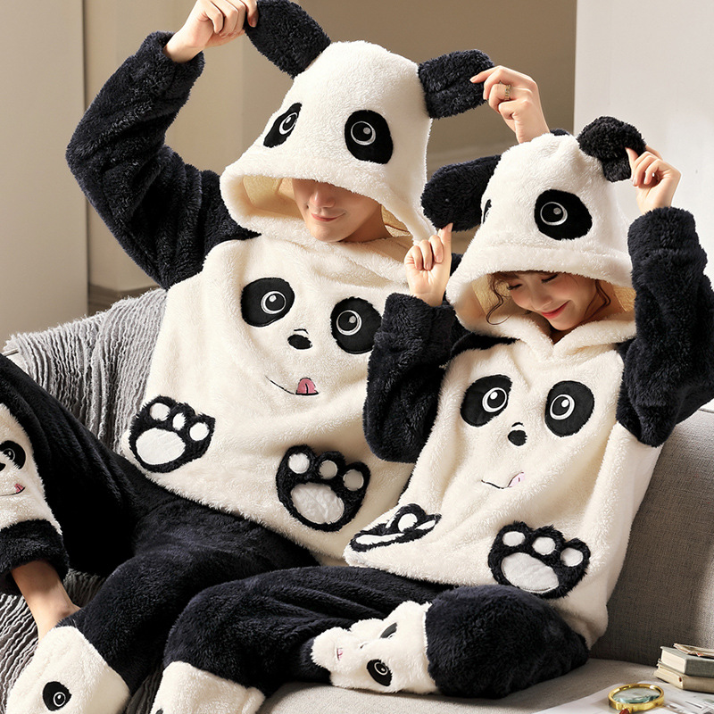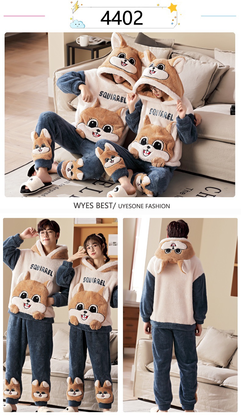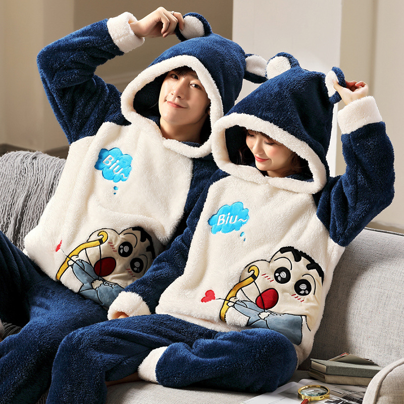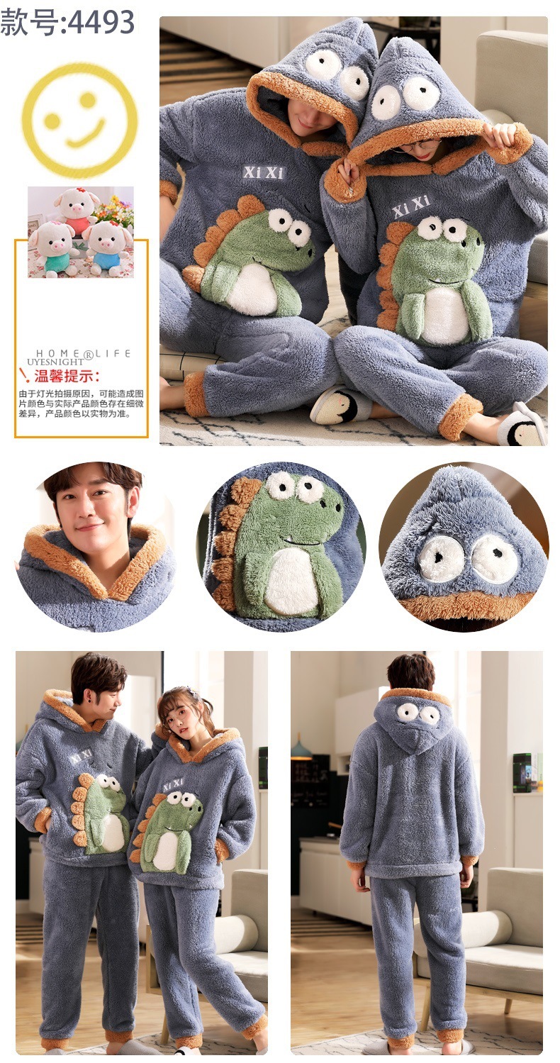 커플 잠옷 여자의 가을과 겨울 산호 양털 두꺼운 따뜻한 만화 플러스 사이즈 남자의 후드 세트 플란넬 가정 옷스토어 가기