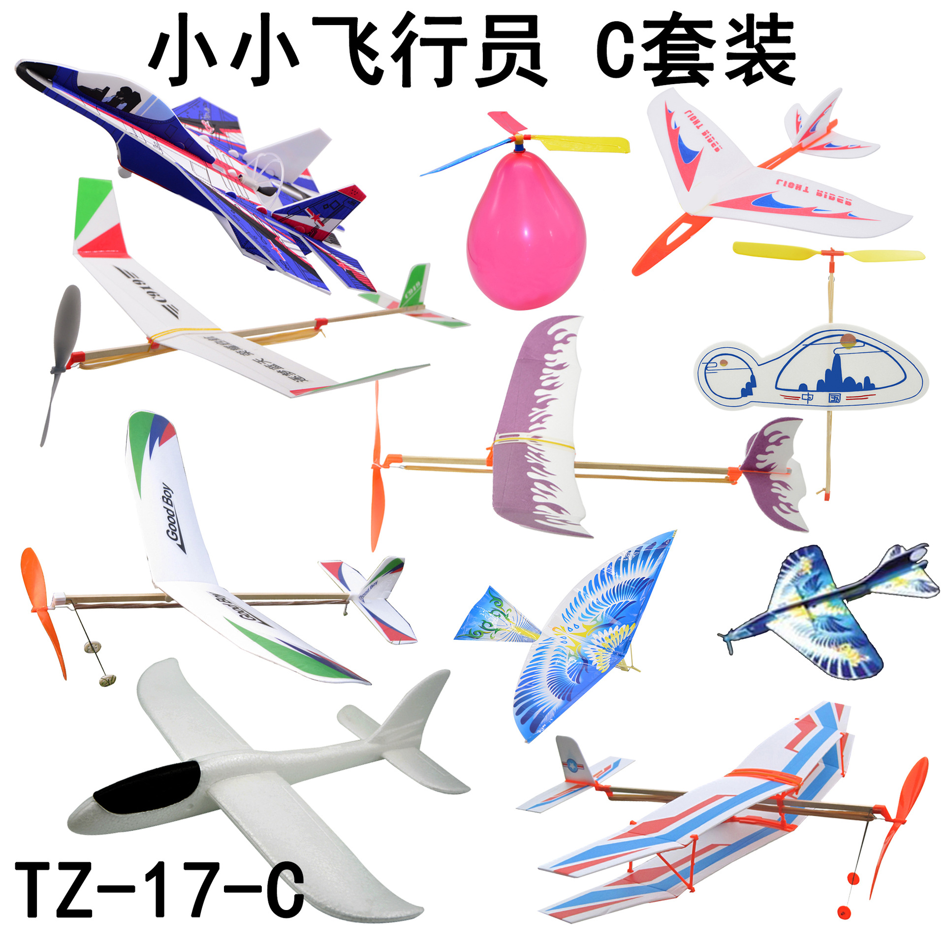 TZ-17C 小小飞行员套装 配置:FJ102 气球飞机,FJ105 直升机,FJ204 扑翼机,FJ402 回旋飞机,FJ404 手掷飞机,FJ502-668 雷神,FJ504-118 皮筋飞机,FJ505- A818 双翼闪电战斗机,KX1911-728 弹射飞机,KX1922-C919 橡筋动力滑翔机,KX2019 苏27战斗机