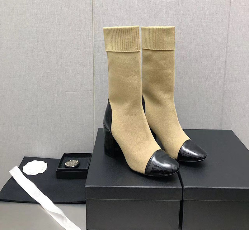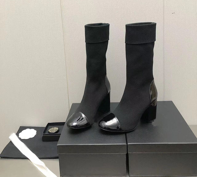 2024 Xiaoxiangfeng 가을, 겨울 새로운 스타일 니트 스트레치 양말 부츠 라운드 발가락 하이힐 중간 튜브 소 가죽 부츠 여성용스토어 가기