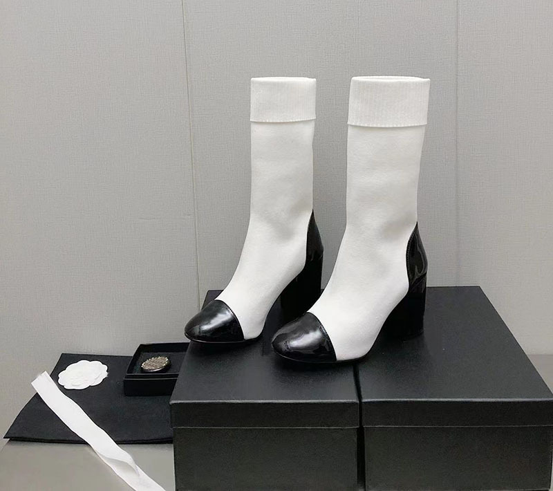 2024 Xiaoxiangfeng 가을, 겨울 새로운 스타일 니트 스트레치 양말 부츠 라운드 발가락 하이힐 중간 튜브 소 가죽 부츠 여성용