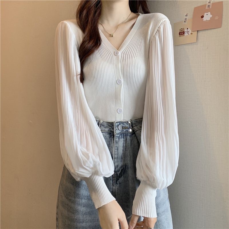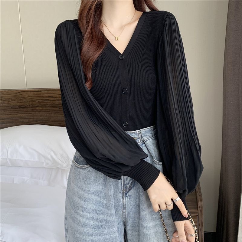 브이넥 랜턴 슬리브 쉬폰 스티칭 우아한 여성 여름 2023 싱글 브레스트 한국식 슬림 니트 가디건 탑