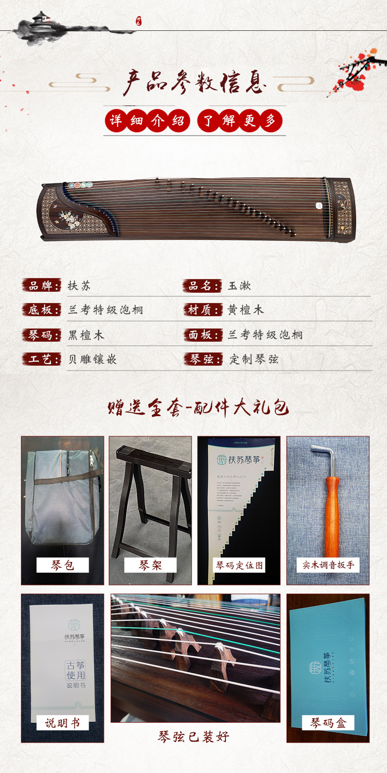 配件:高档琴架、琴弦已装好、琴码、琴码盒、实木调音扳手、琴码定位图、高档琴包、指甲、胶布。