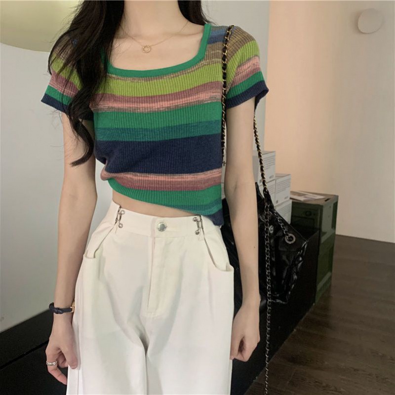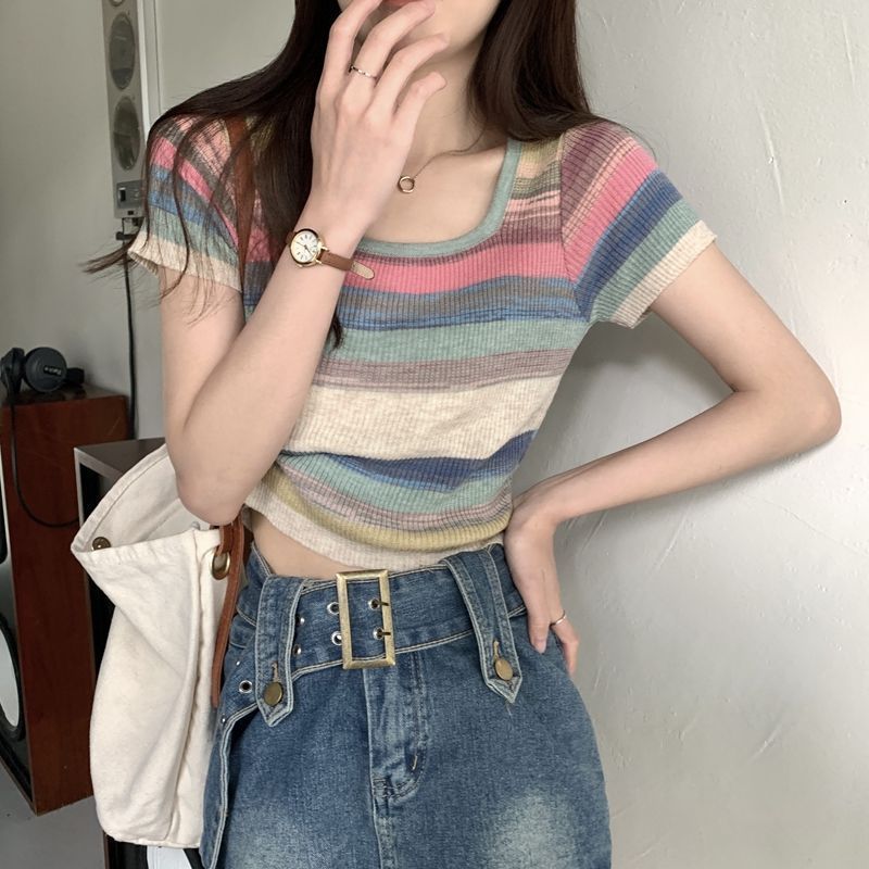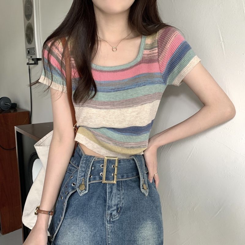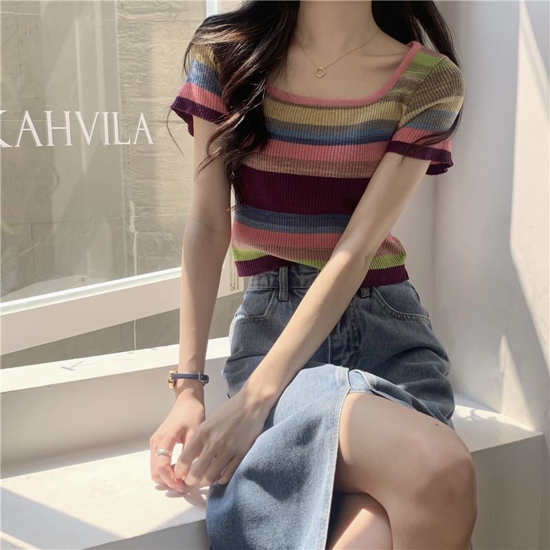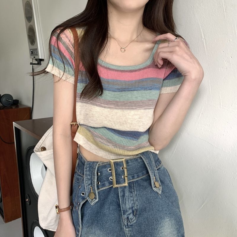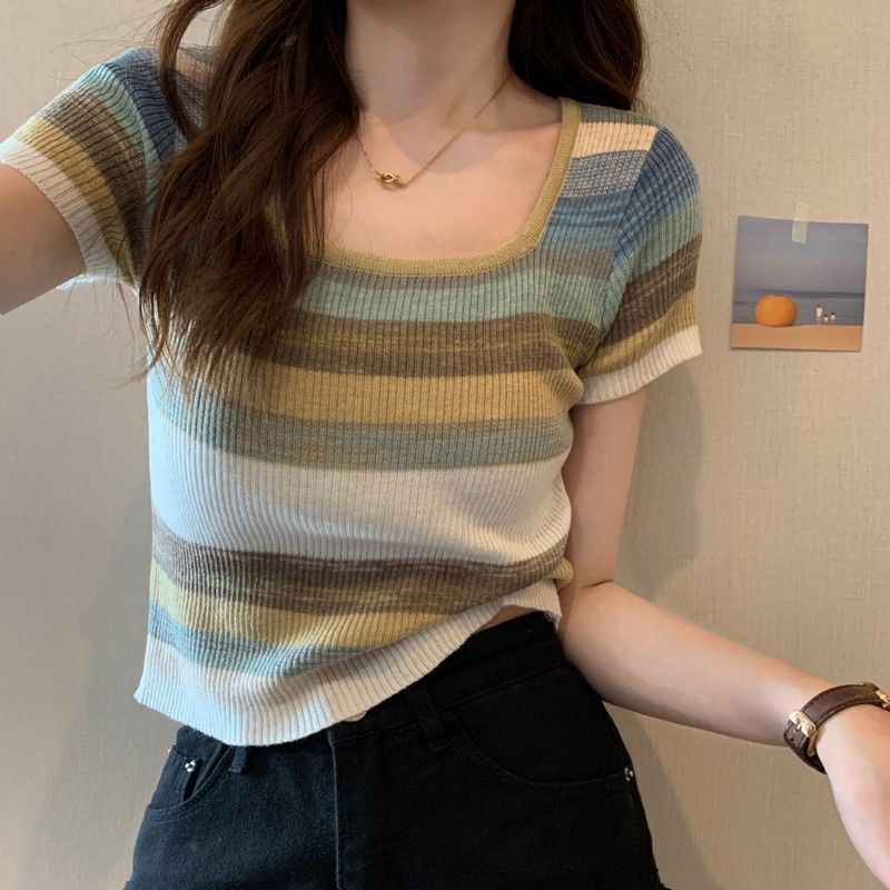 레인보우 스트라이프 스퀘어 칼라 프론트 숄더 니트 반팔 티셔츠 여성용 여름 얇은 디자인 감각 순수한 욕망 짧은 달콤한 핫 탑 인스토어 가기