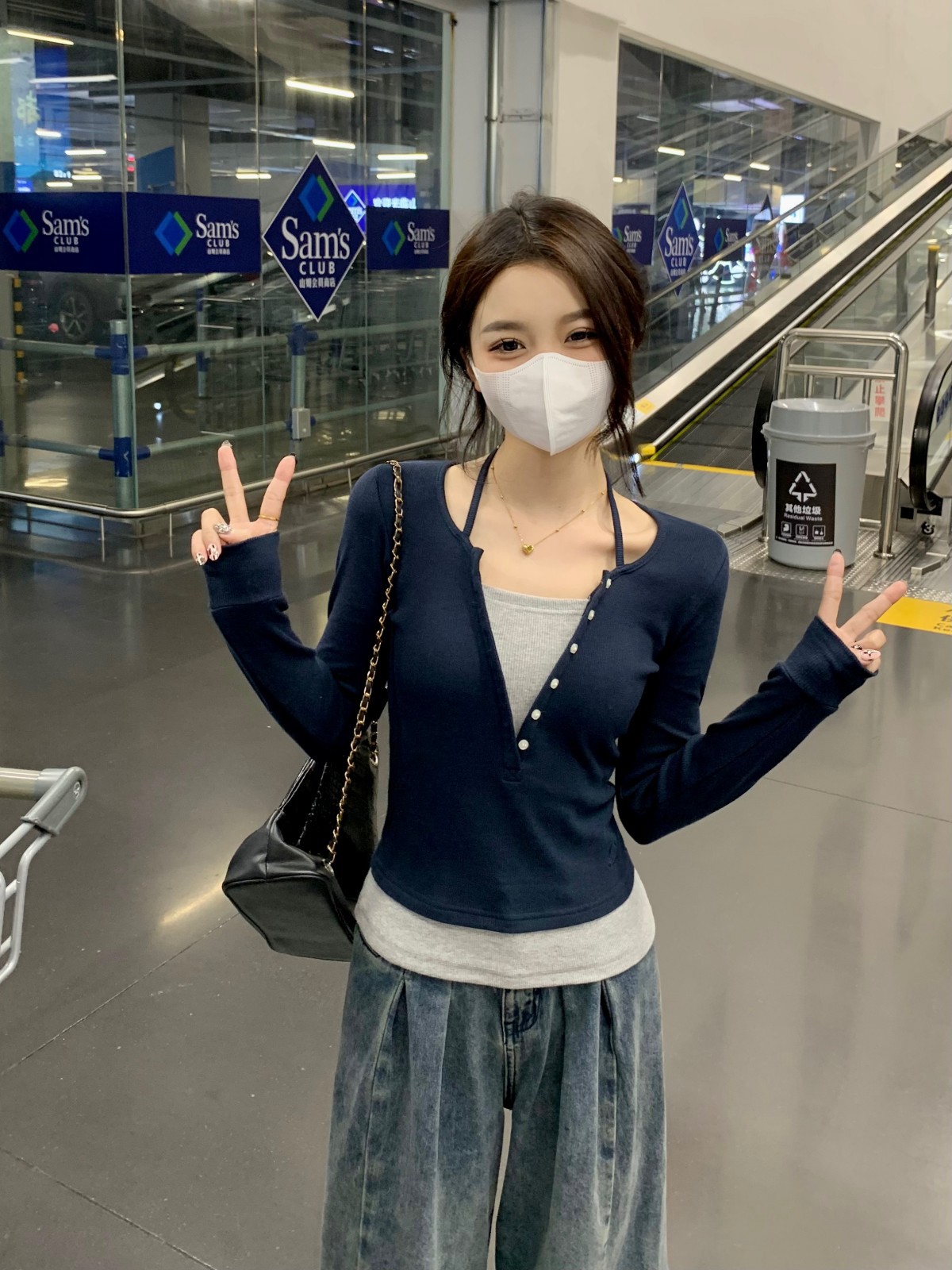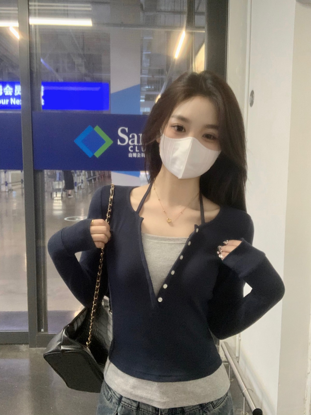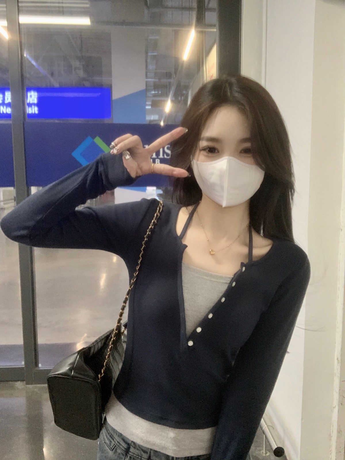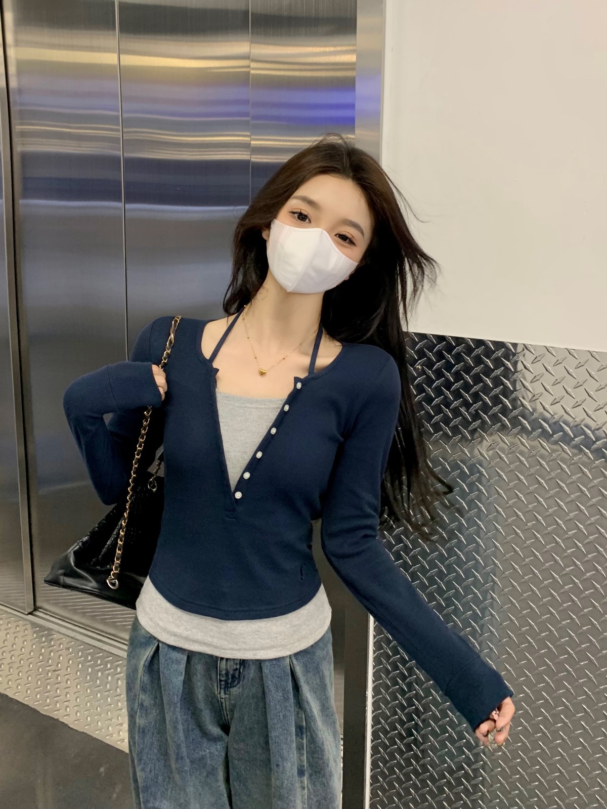 가을 스티치의 세대 새로운 짧은 슬림 슬림 가짜 2 면 V 넥 긴 소매 티셔츠 여성베이스 셔츠스토어 가기