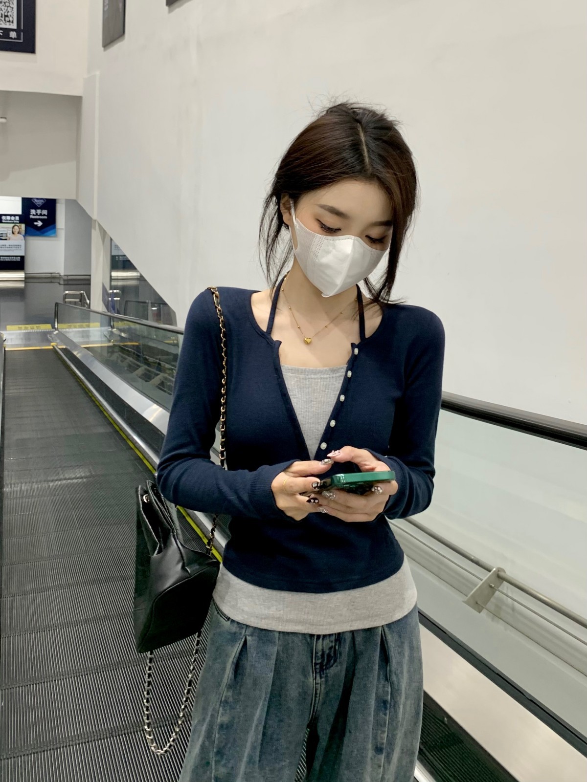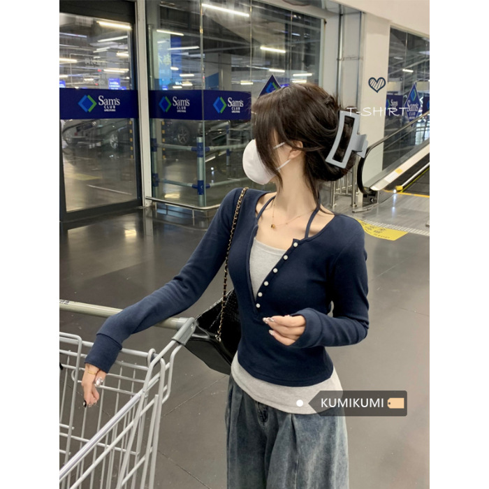 가을 스티치의 세대 새로운 짧은 슬림 슬림 가짜 2 면 V 넥 긴 소매 티셔츠 여성베이스 셔츠