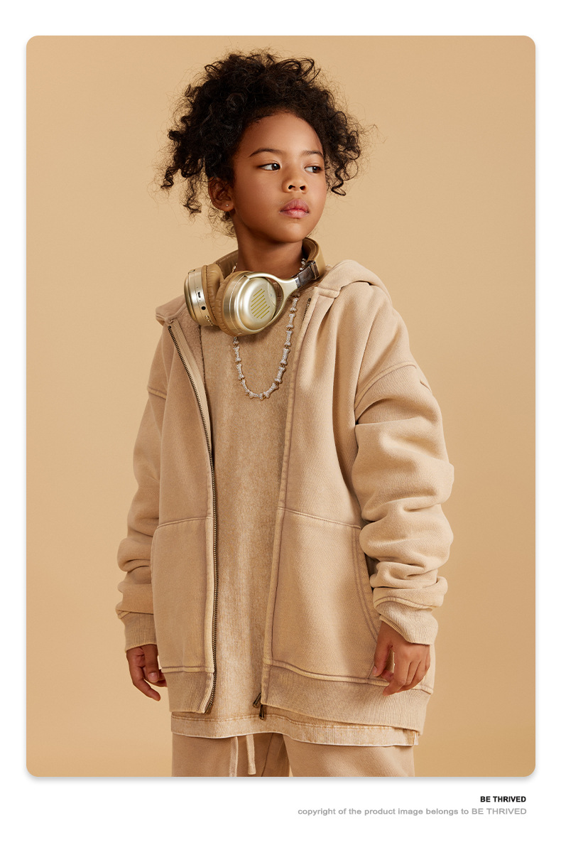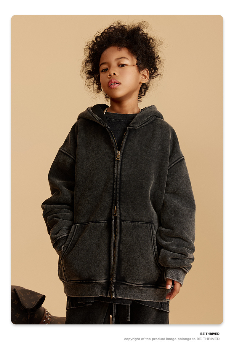 BE 아동복 | 2025 가을 겨울 크로스보더 특별 벨벳 가디건 아동복 워싱 후드 재킷 트렌디 브랜드 스웨트 재킷