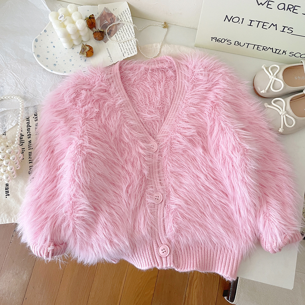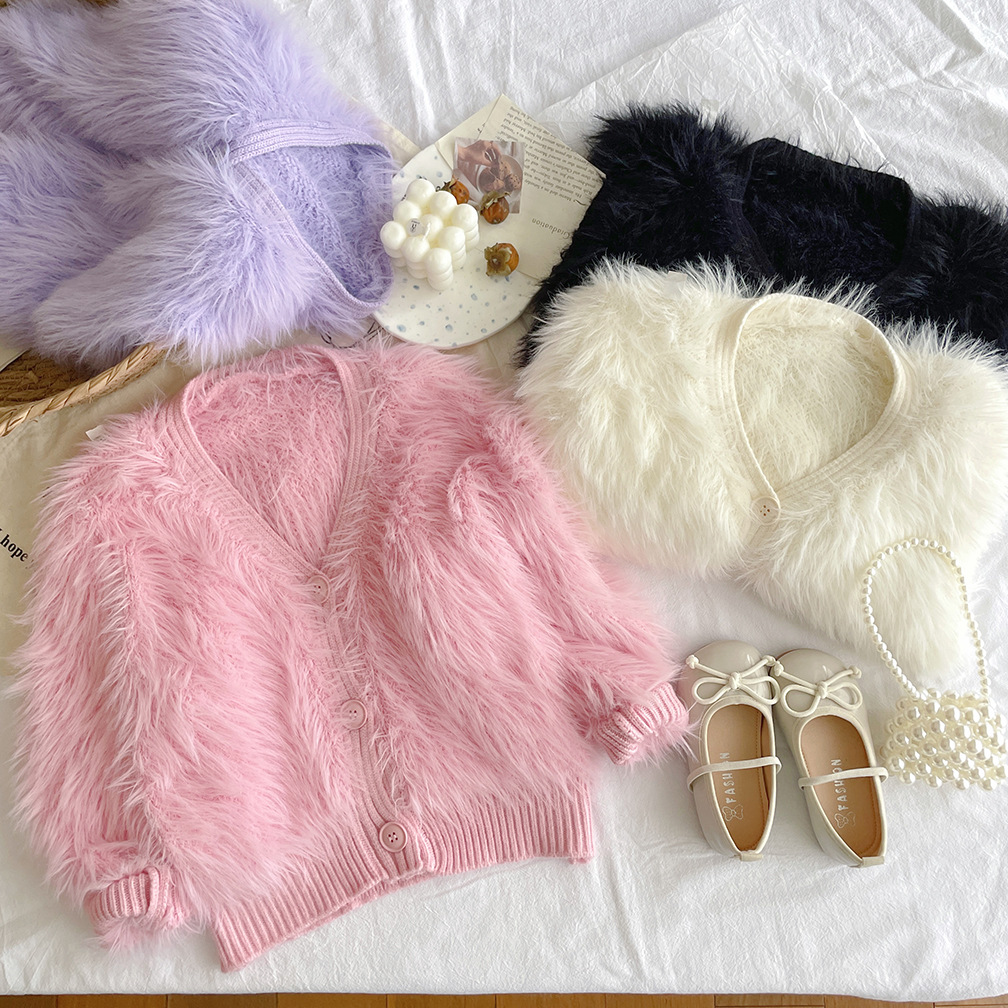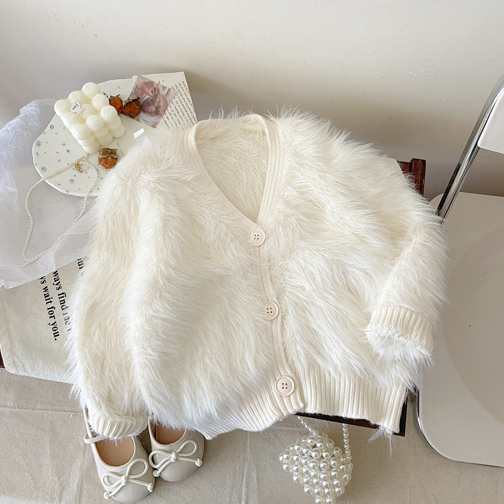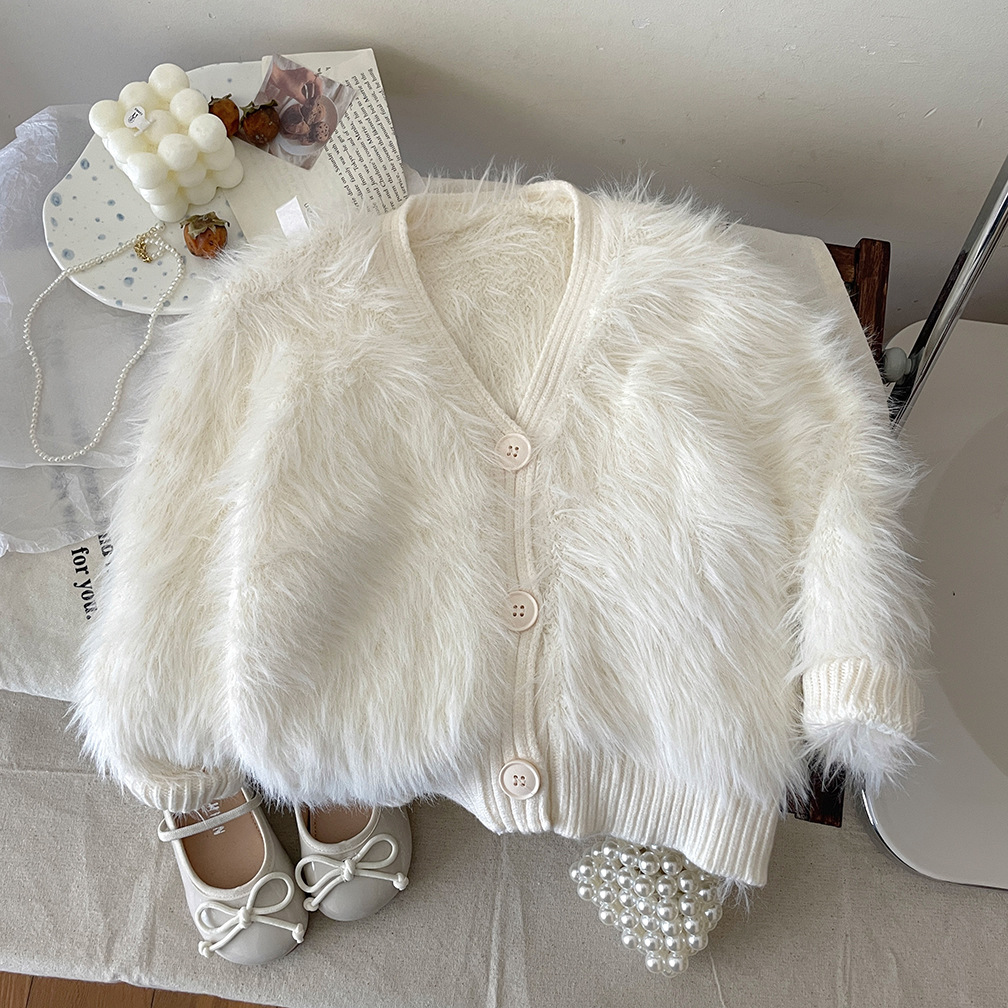 여아 한국식 23 스타일 밍크 벨벳 브이넥 플러시 두꺼운 니트 가디건 스웨터 자켓 아동 겨울 탑스토어 가기