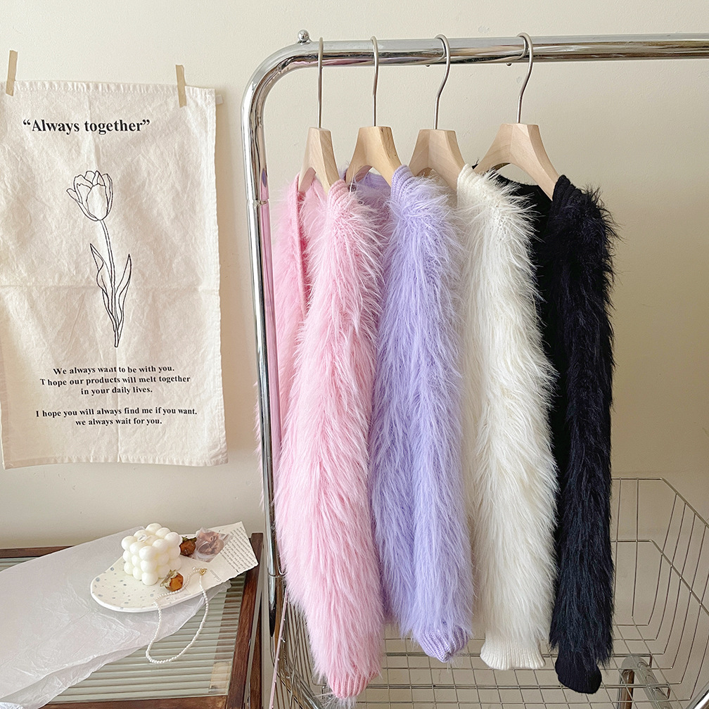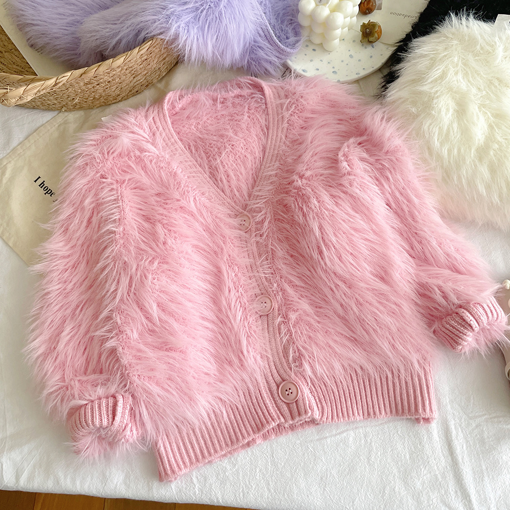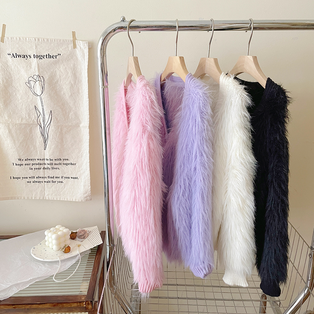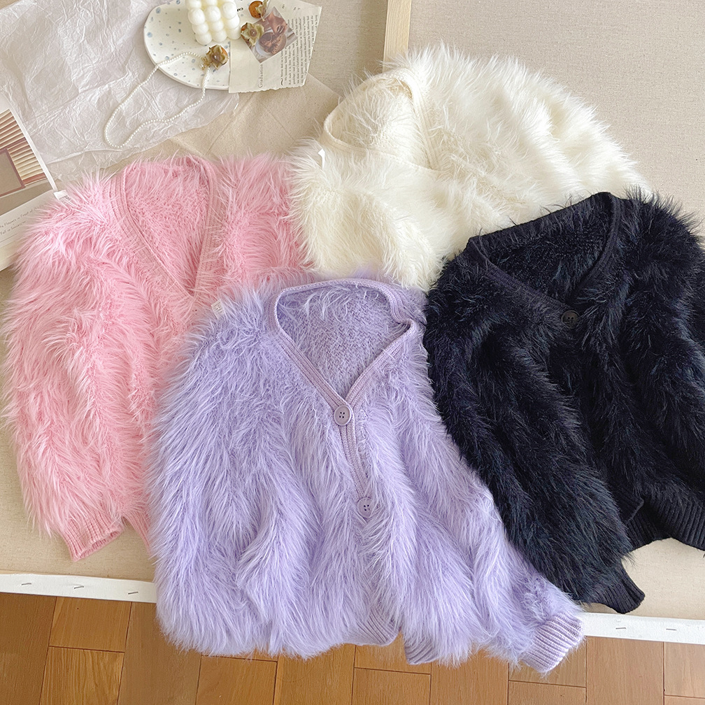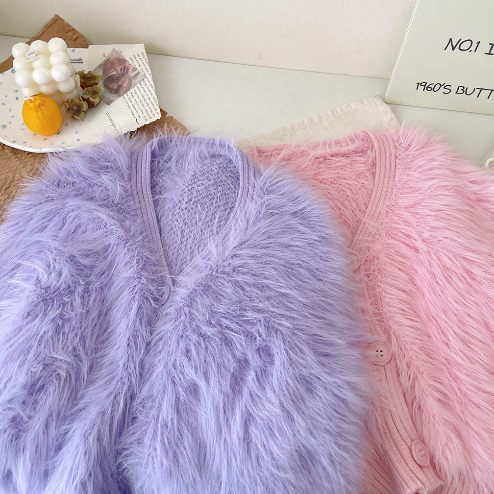 여아 한국식 23 스타일 밍크 벨벳 브이넥 플러시 두꺼운 니트 가디건 스웨터 자켓 아동 겨울 탑스토어 가기
