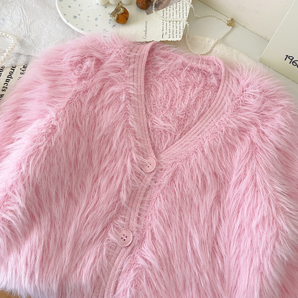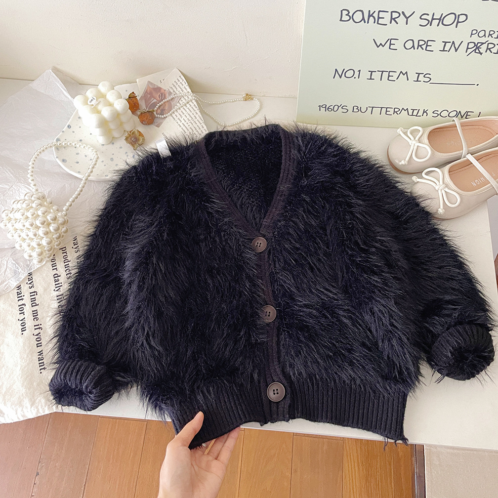 여아 한국식 23 스타일 밍크 벨벳 브이넥 플러시 두꺼운 니트 가디건 스웨터 자켓 아동 겨울 탑