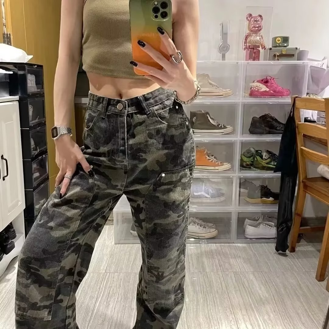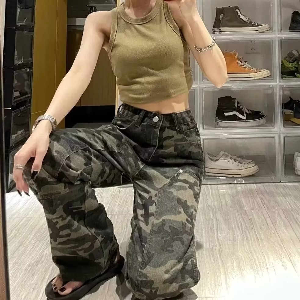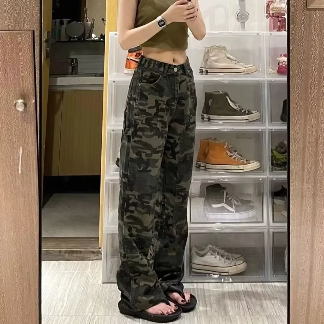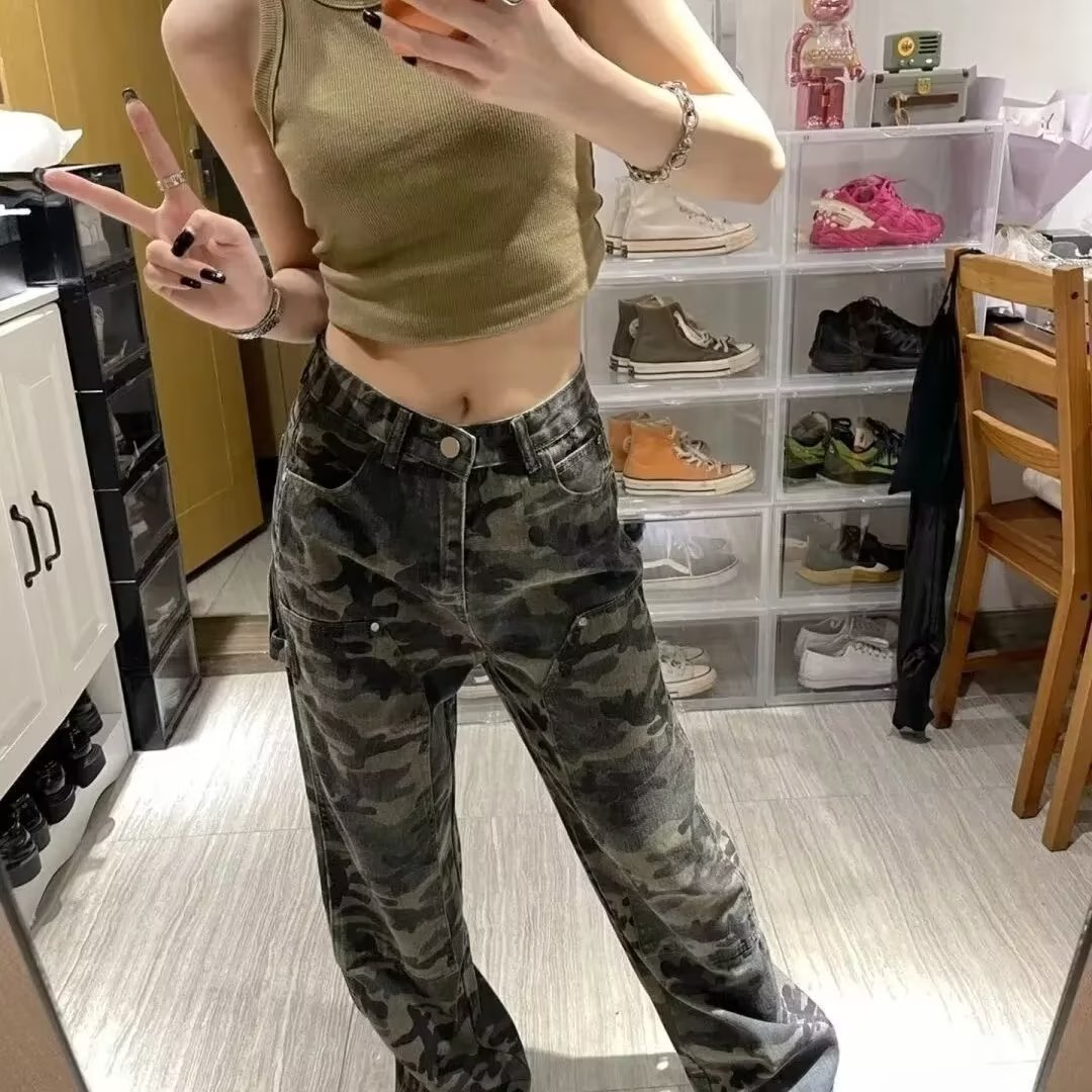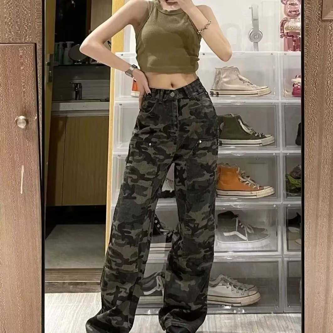 위장 데님 작업 바지 여자의 여름 느슨한 미국 스타일 복고풍 하이 웨이스트 스트레이트 와이드 다리 바닥 바지 높은 거리에스토어 가기