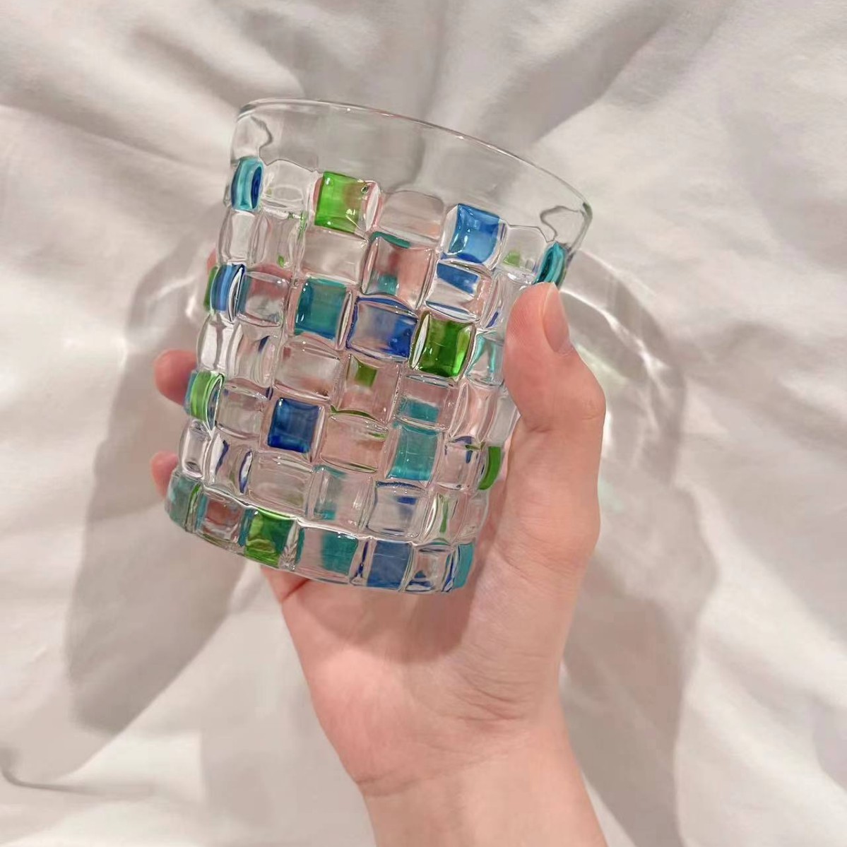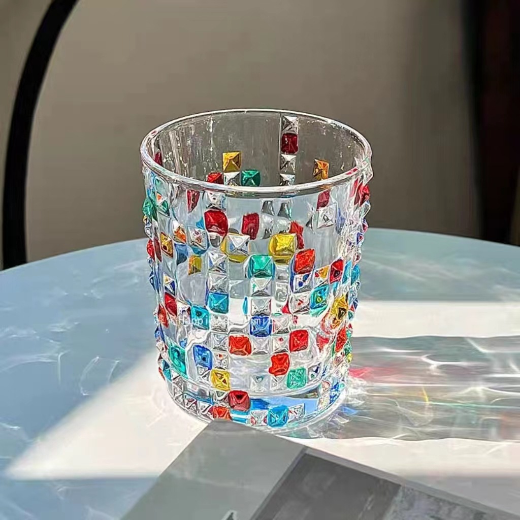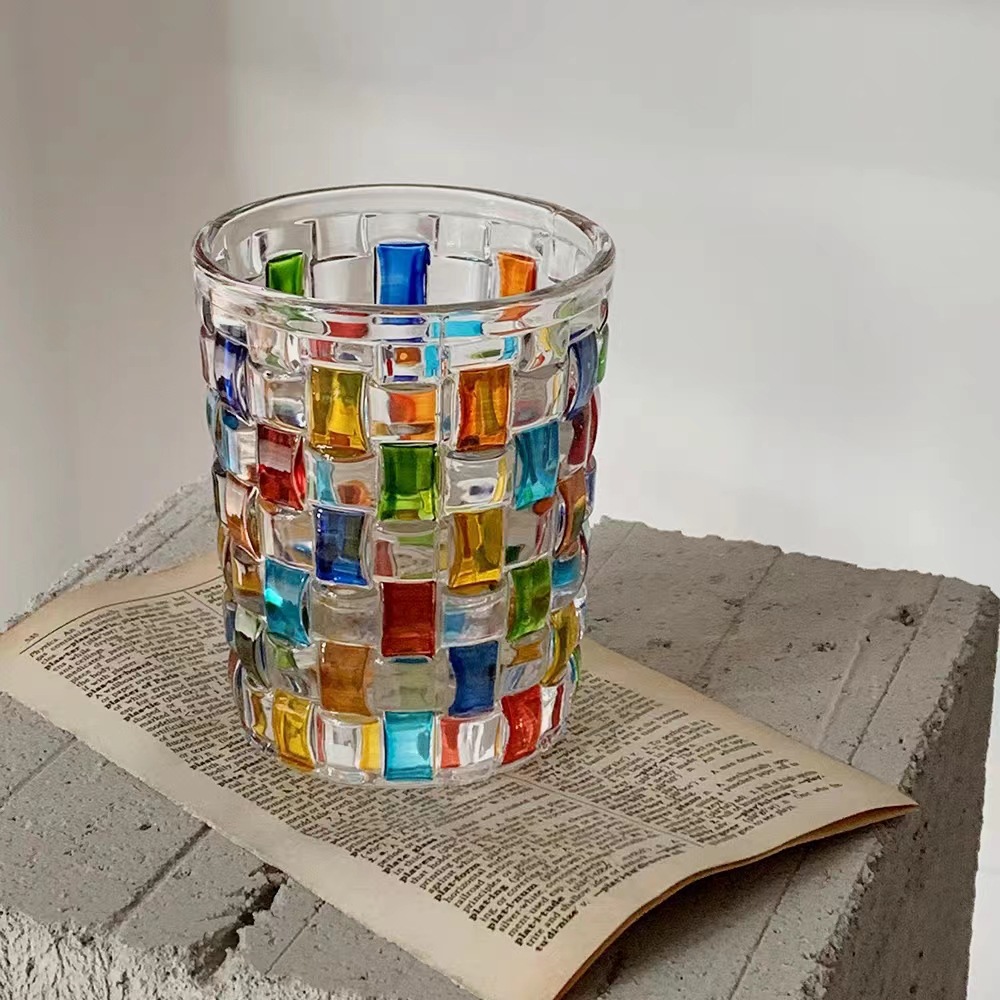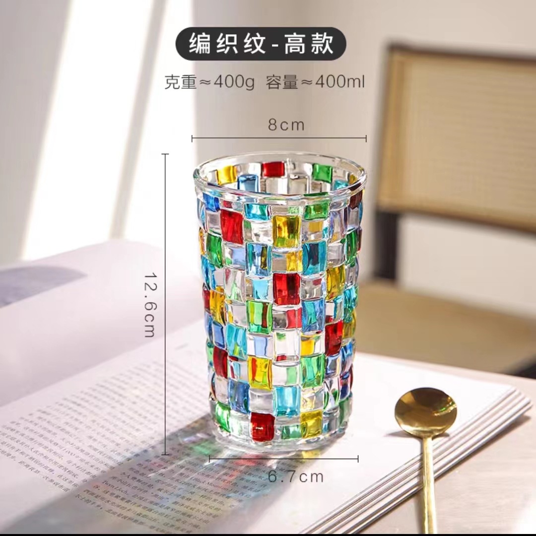 그린 유리 컵 컬러 블록 불규칙한 물 컵 차가운 음료 주스 컵 여름 가정용 무지개 마시는 컵