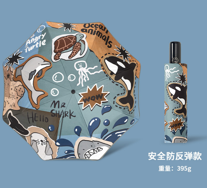 • 귀여운 짐승이 파란색 우산 손잡이를 휩쓸고 있습니다. 둥근 모서리가 자동으로 8k로 접힙니다. [안전 반사 스트립 포함]