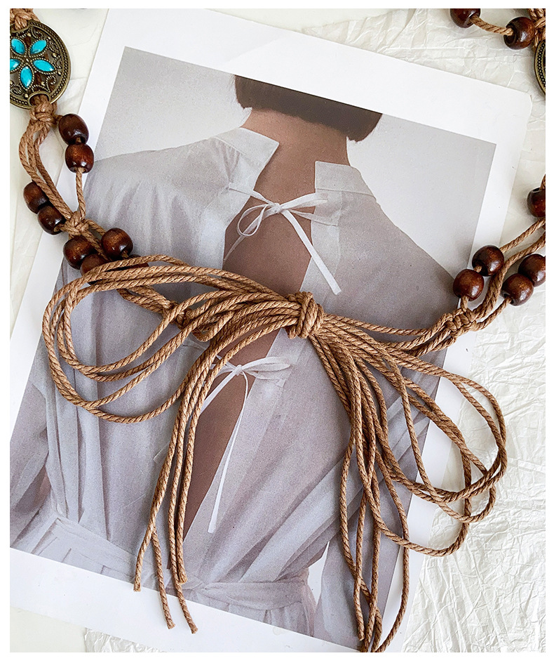 민족 스타일 여성 벨트 아크릴 청록색 짠 여성 벨트 수제 왁스 로프 나무 구슬 보석 짠 허리 체인