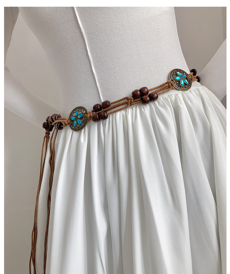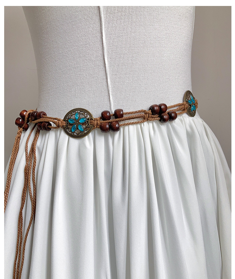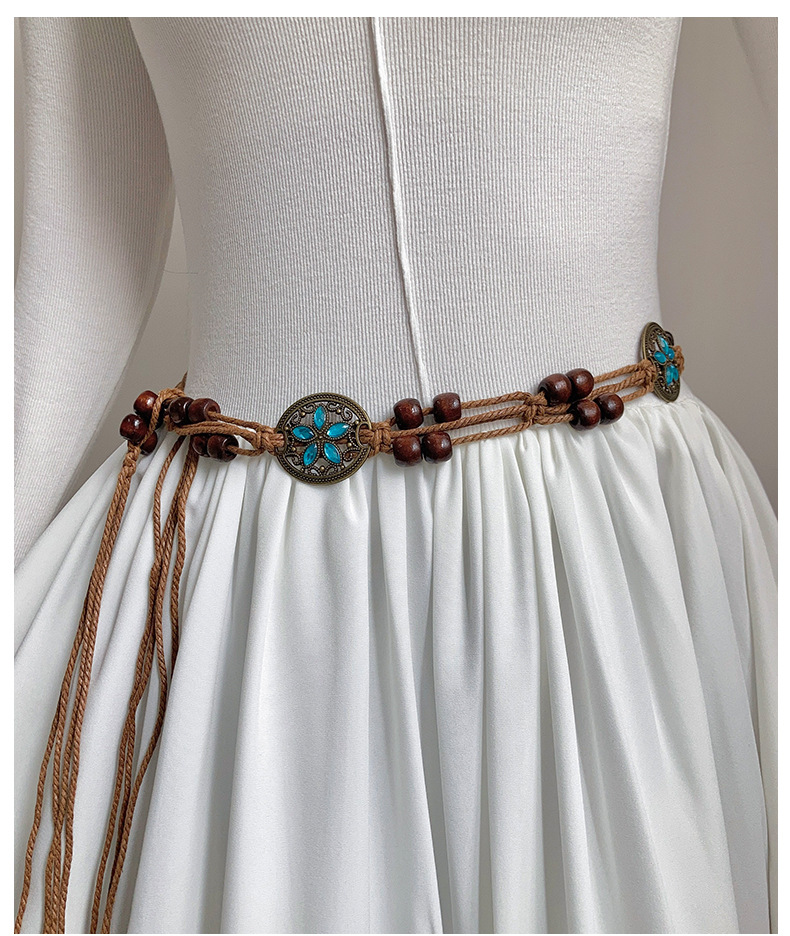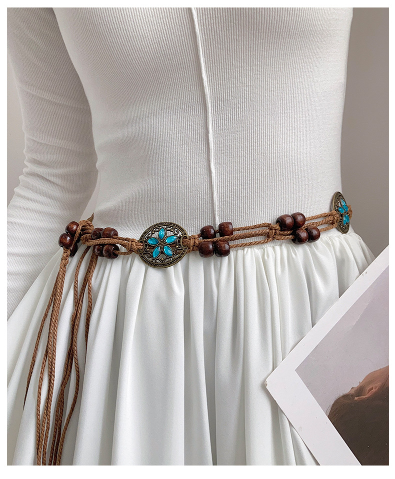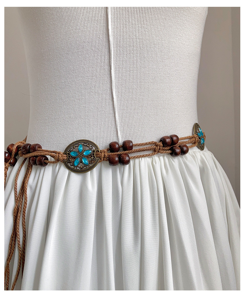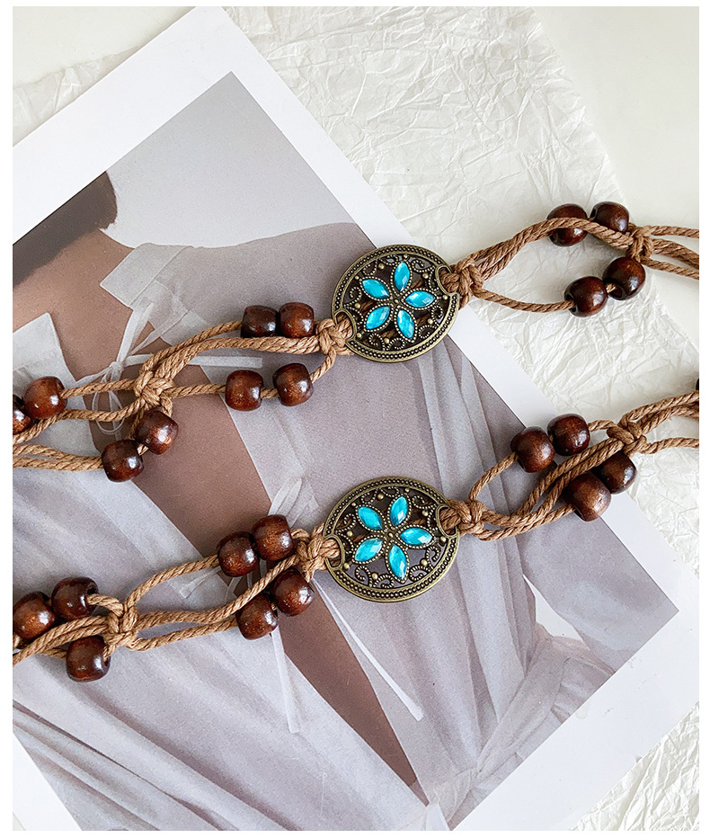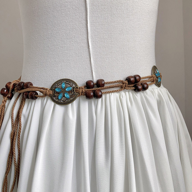 민족 스타일 여성 벨트 아크릴 청록색 짠 여성 벨트 수제 왁스 로프 나무 구슬 보석 짠 허리 체인스토어 가기