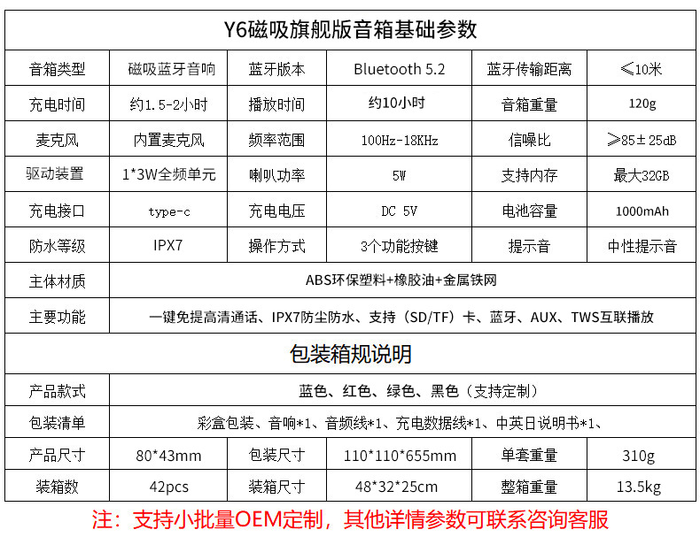 오딘 블루투스 스피커 Y6 휴대용 무선 미니 마그네틱 작은 소리 야외 방수 욕실 무거운 서브 우퍼