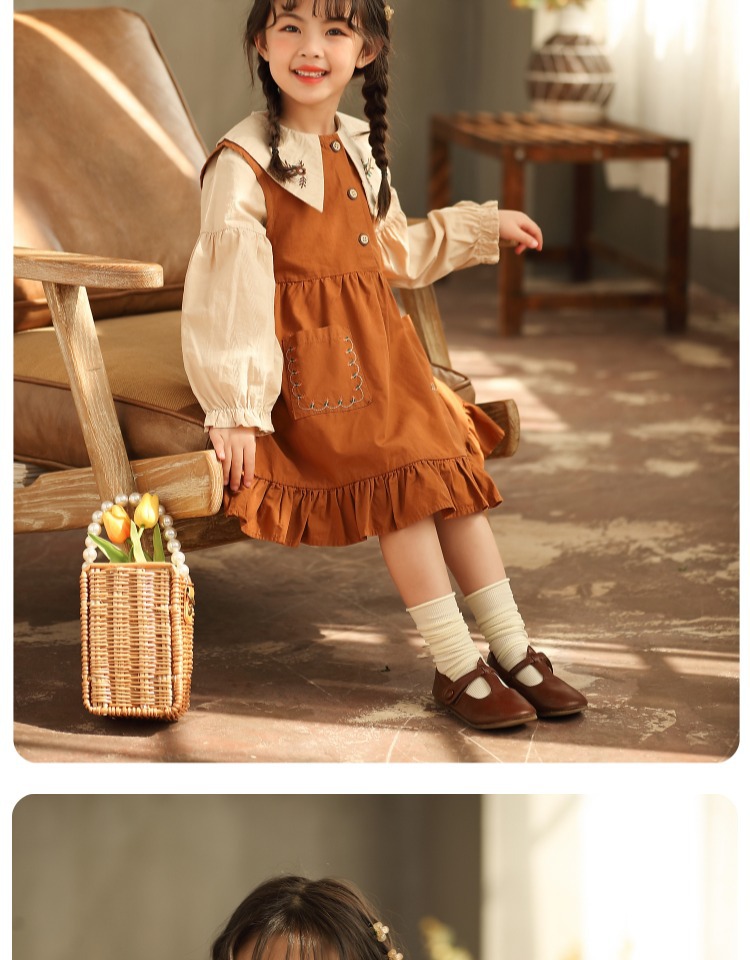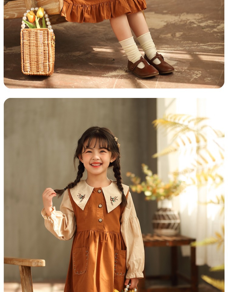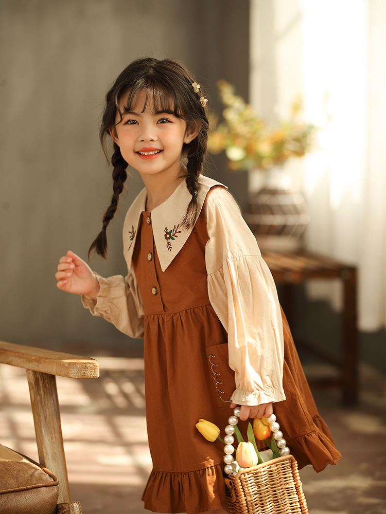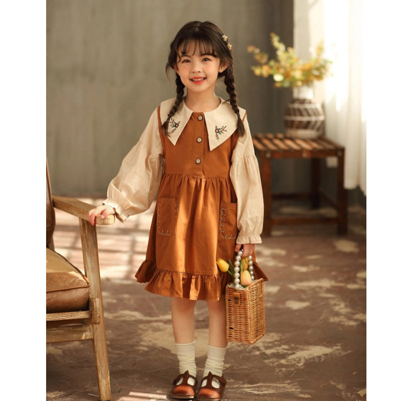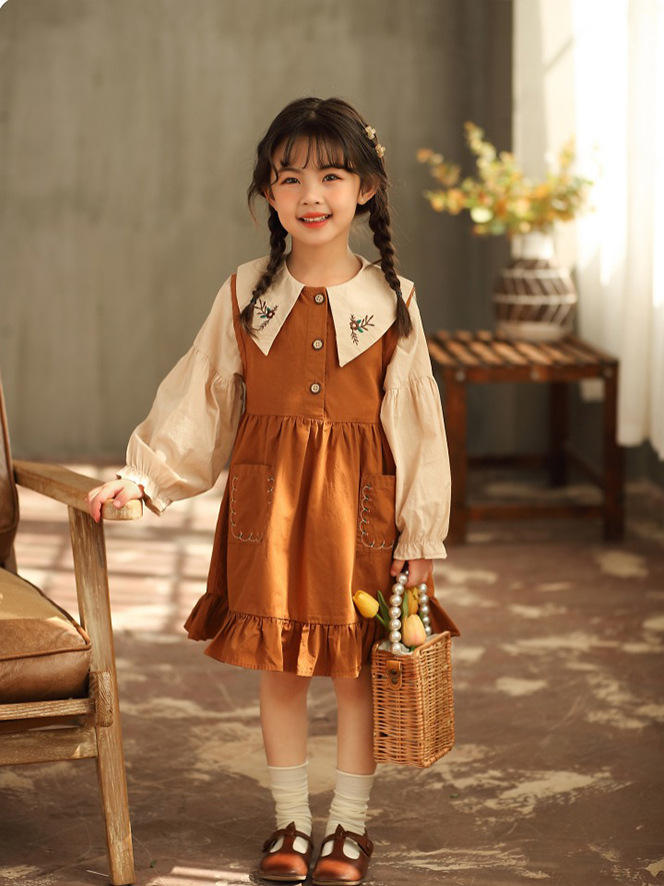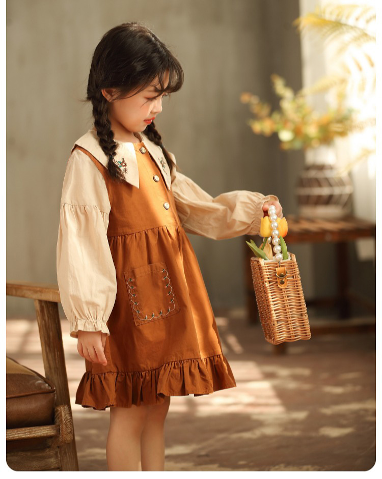 여자 가을 드레스 가짜 투피스 2025 새로운 봄, 가을 긴팔 자수 메일라드 인형 칼라 중대형 어린이스토어 가기