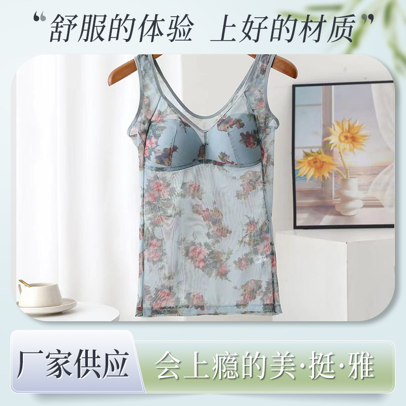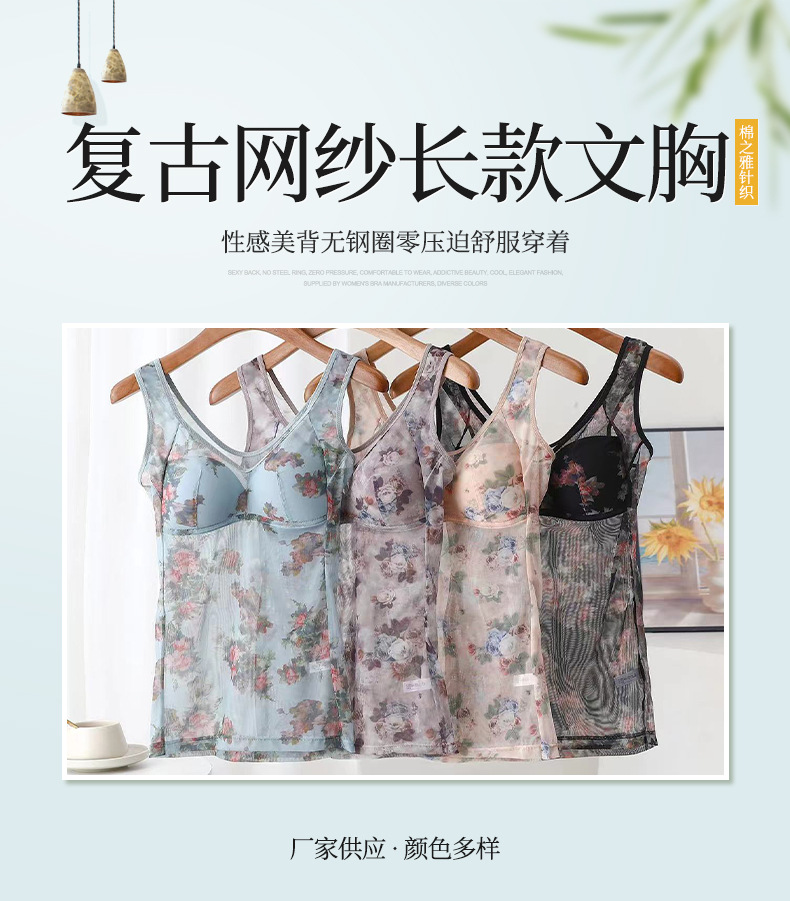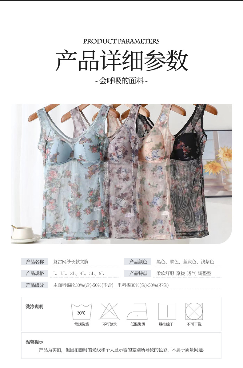 805 레트로 메쉬 큰 꽃무늬 노와이어 얇은 푸쉬업 편안한 탱크탑 스타일 롱 브라 대형 사이즈 이너웨어