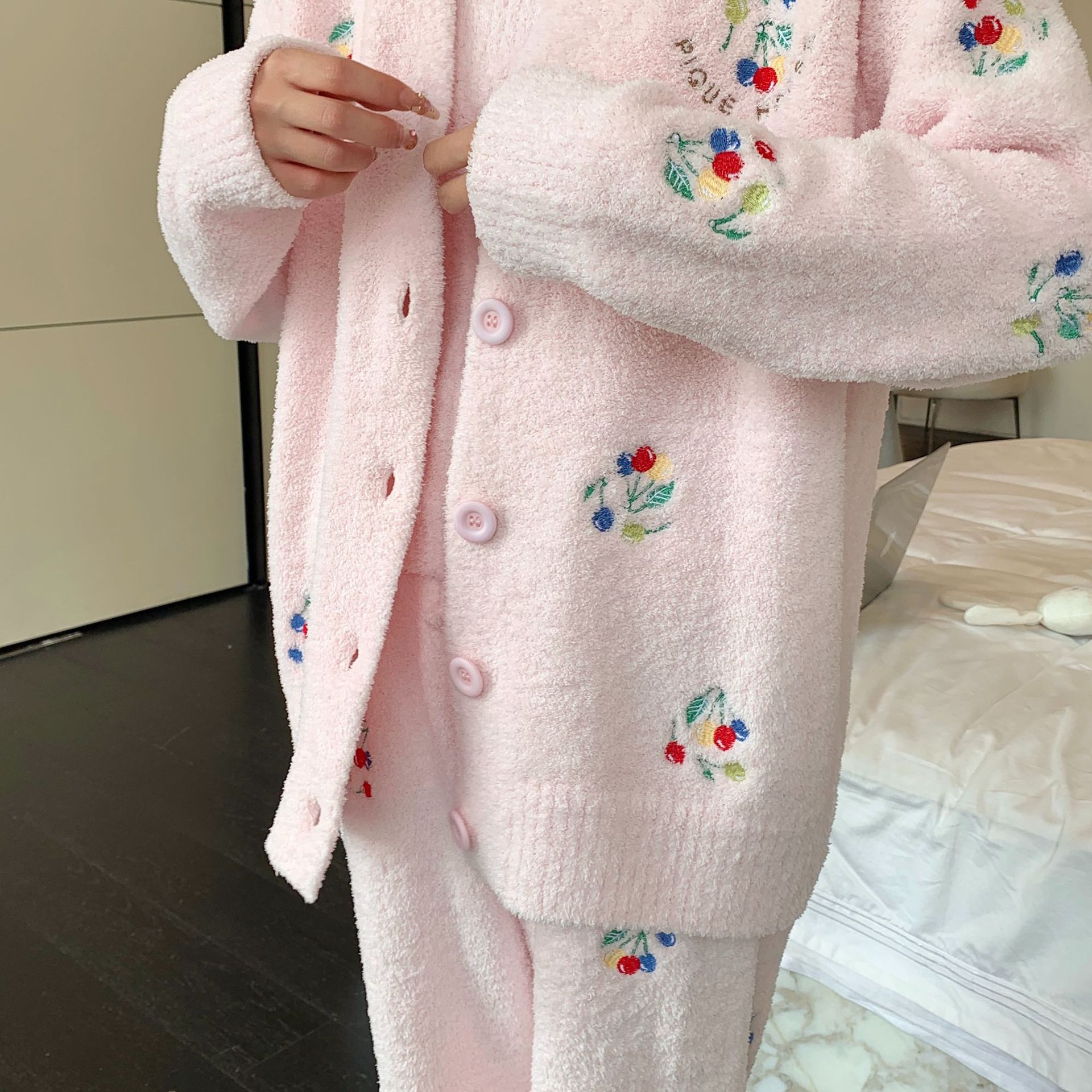 가을과 겨울 새로운 부드러운 달콤한 색상 자수 체리 카디건 게으른 스타일 홈 의류 잠옷 여성용 3 종 세트