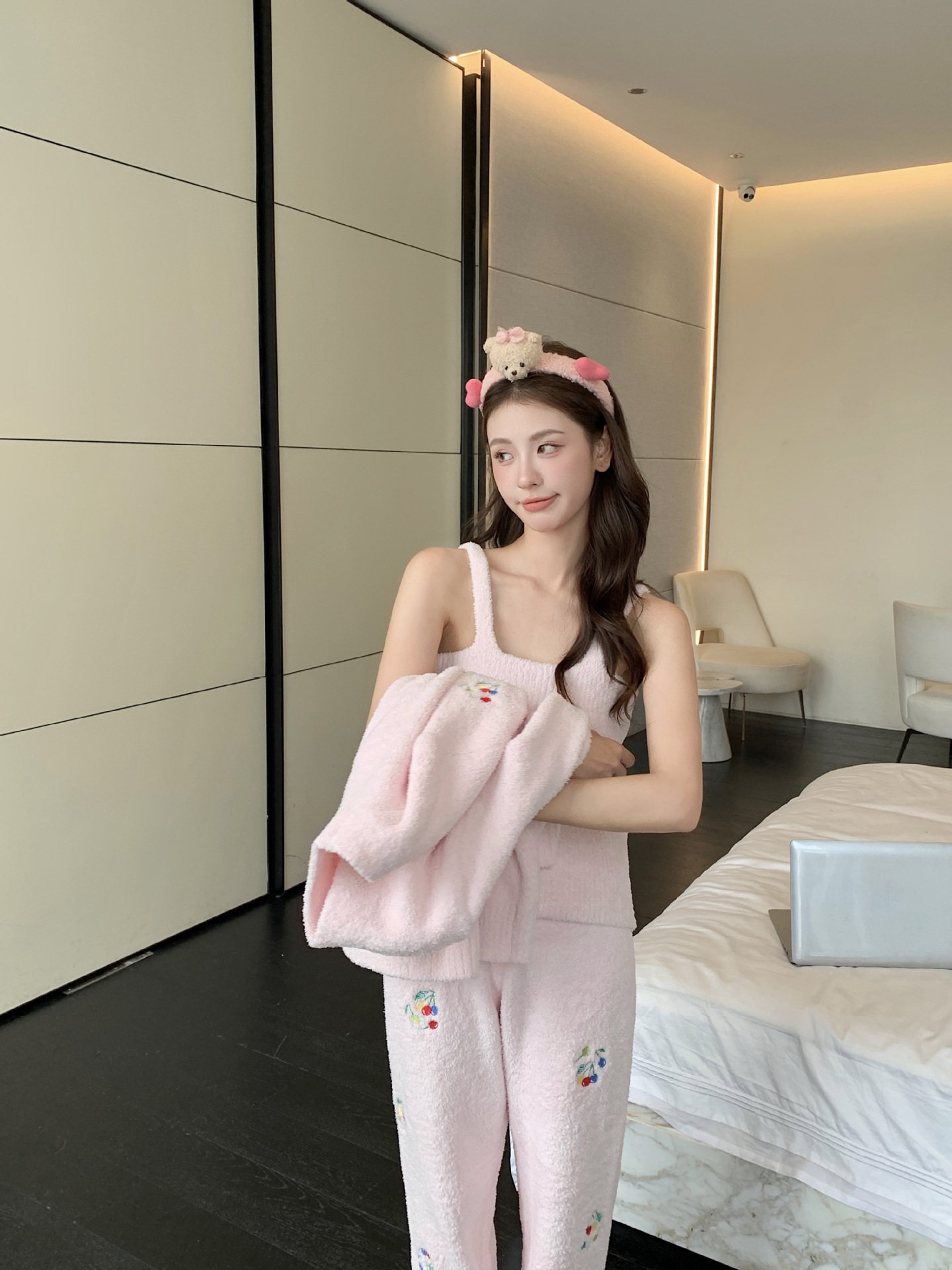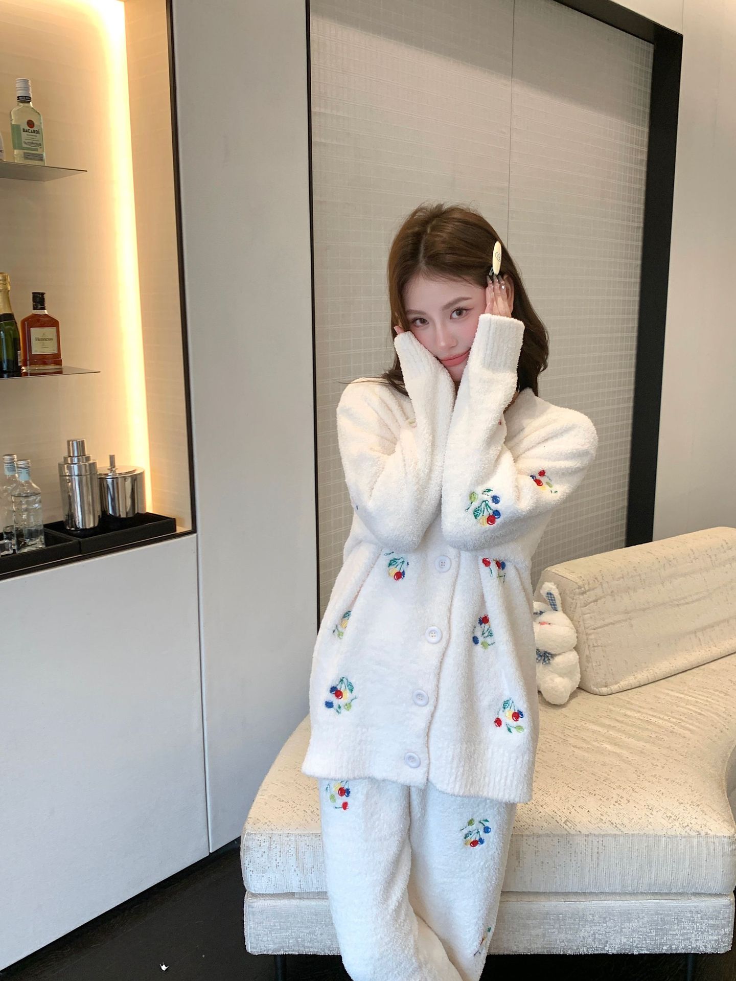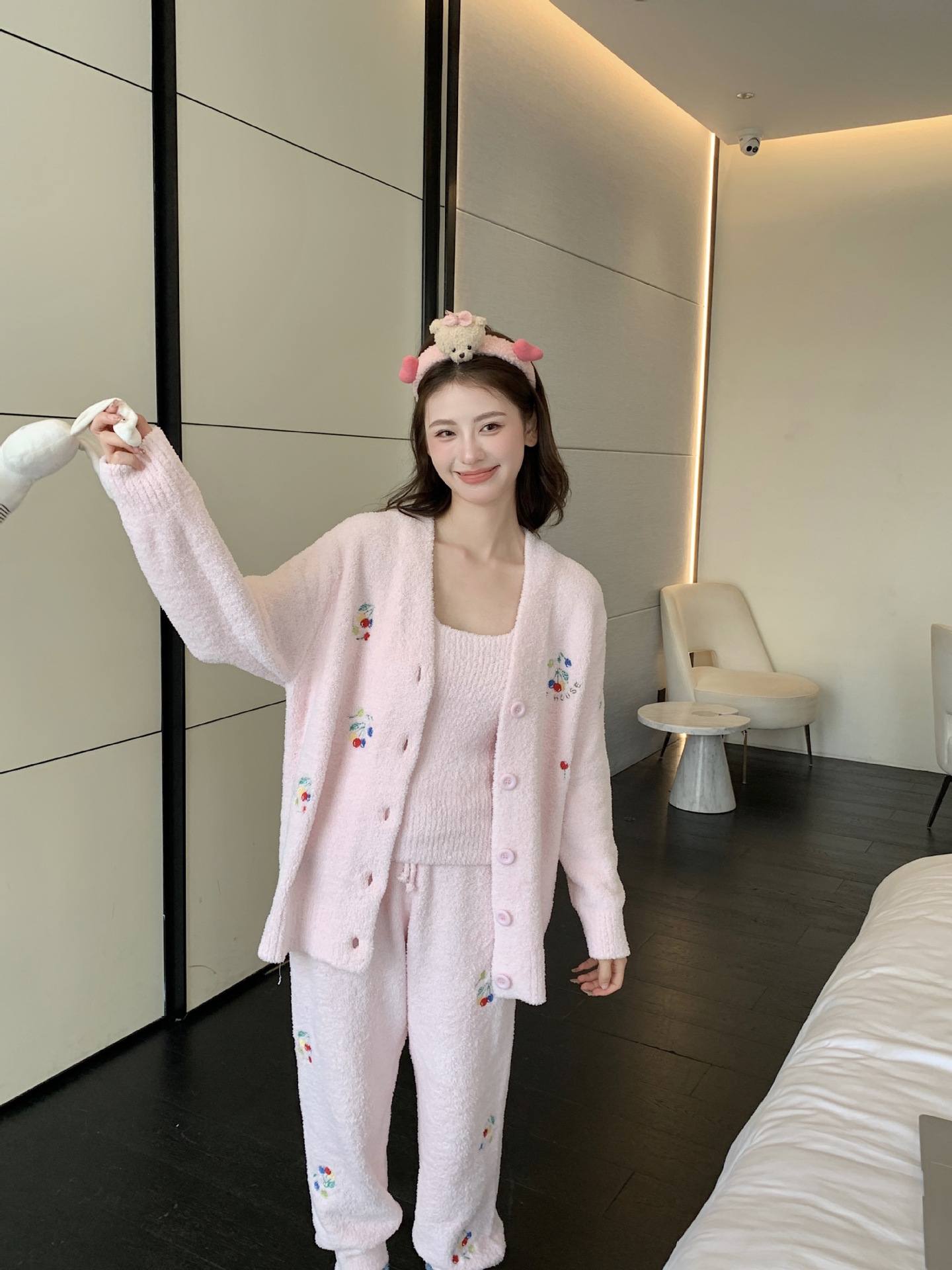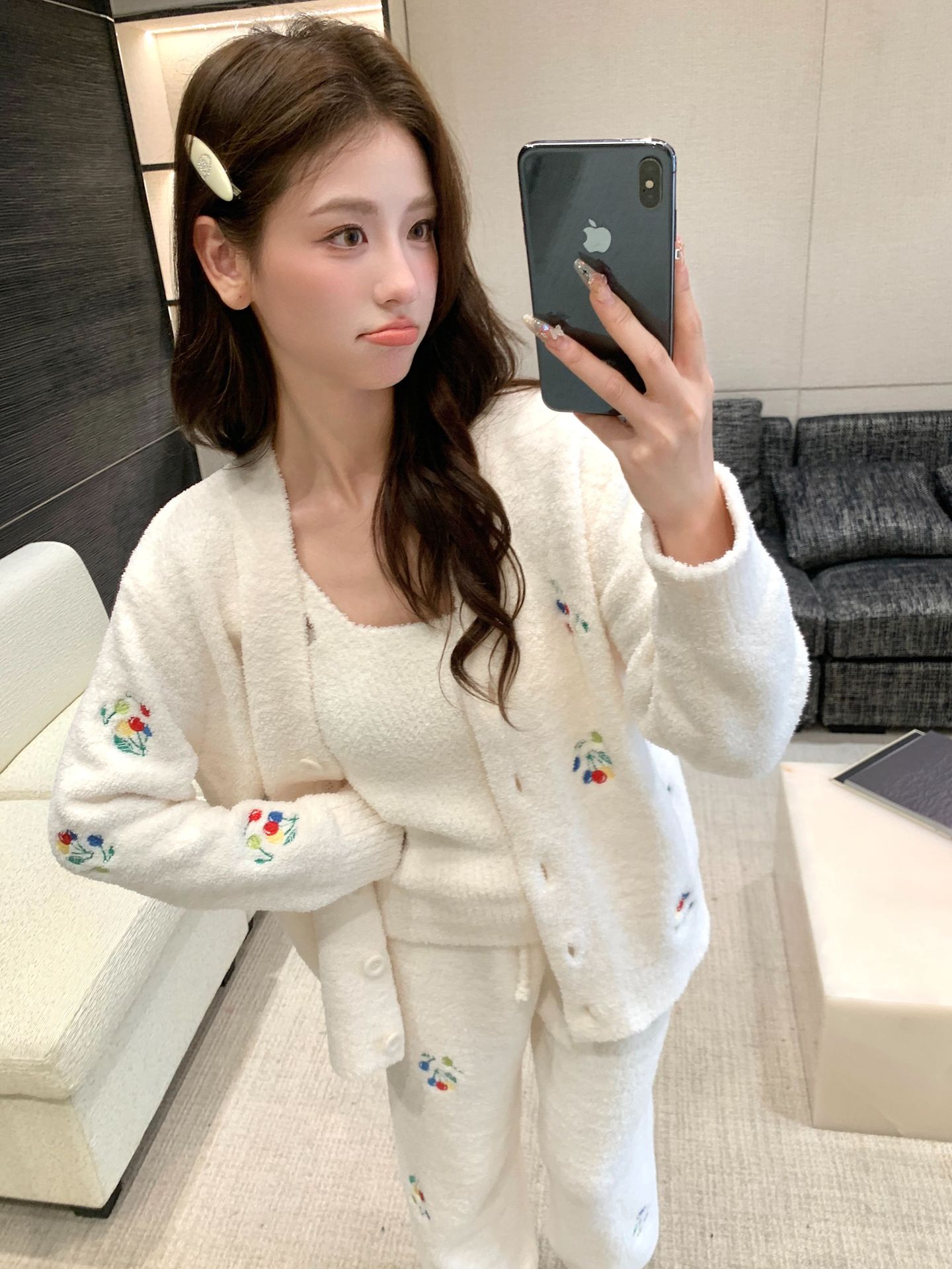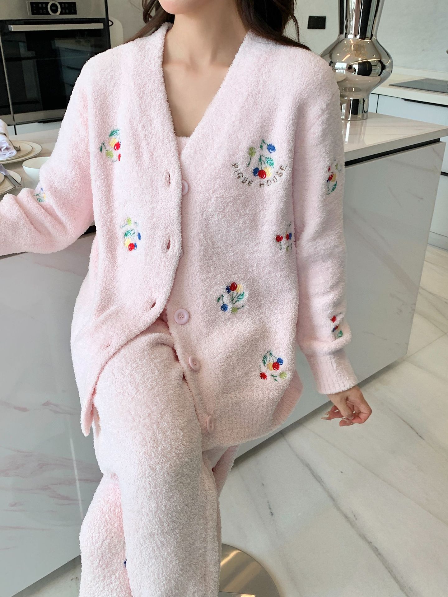 가을과 겨울 새로운 부드러운 달콤한 색상 자수 체리 카디건 게으른 스타일 홈 의류 잠옷 여성용 3 종 세트스토어 가기