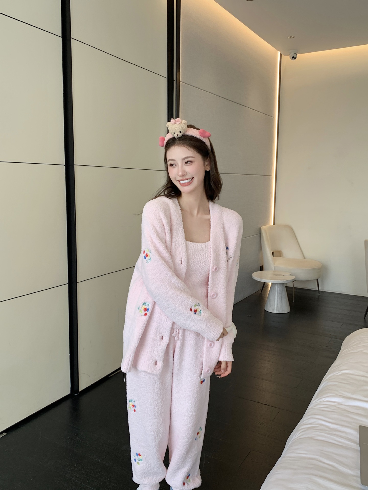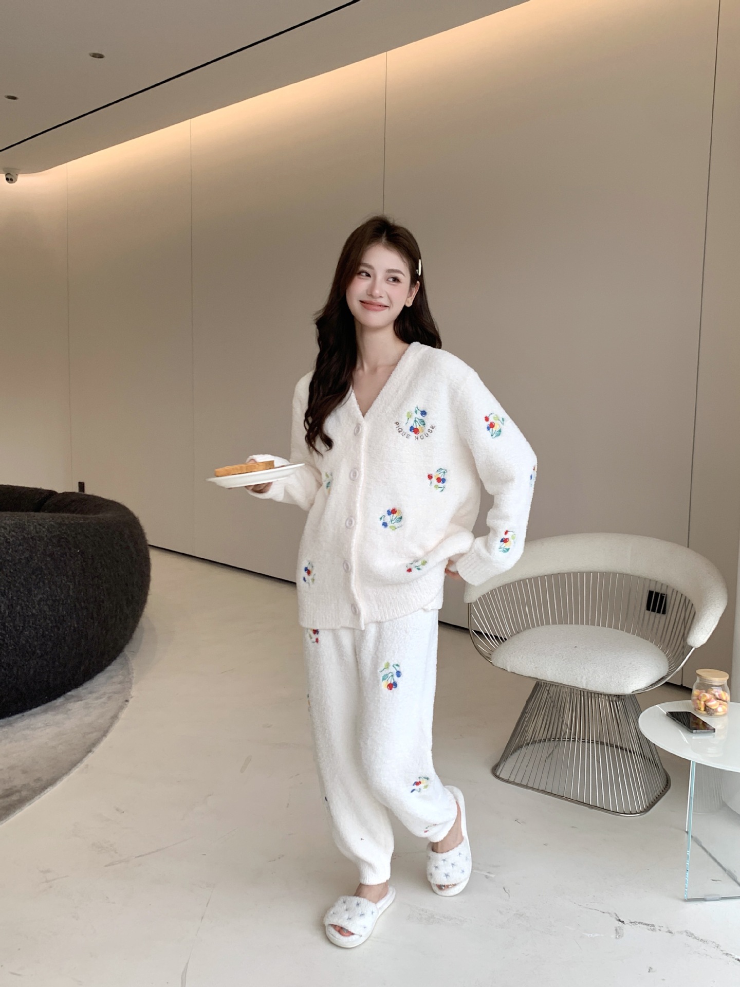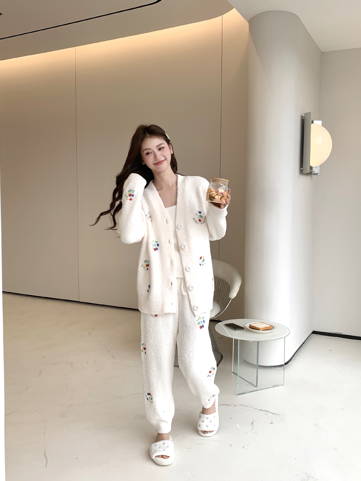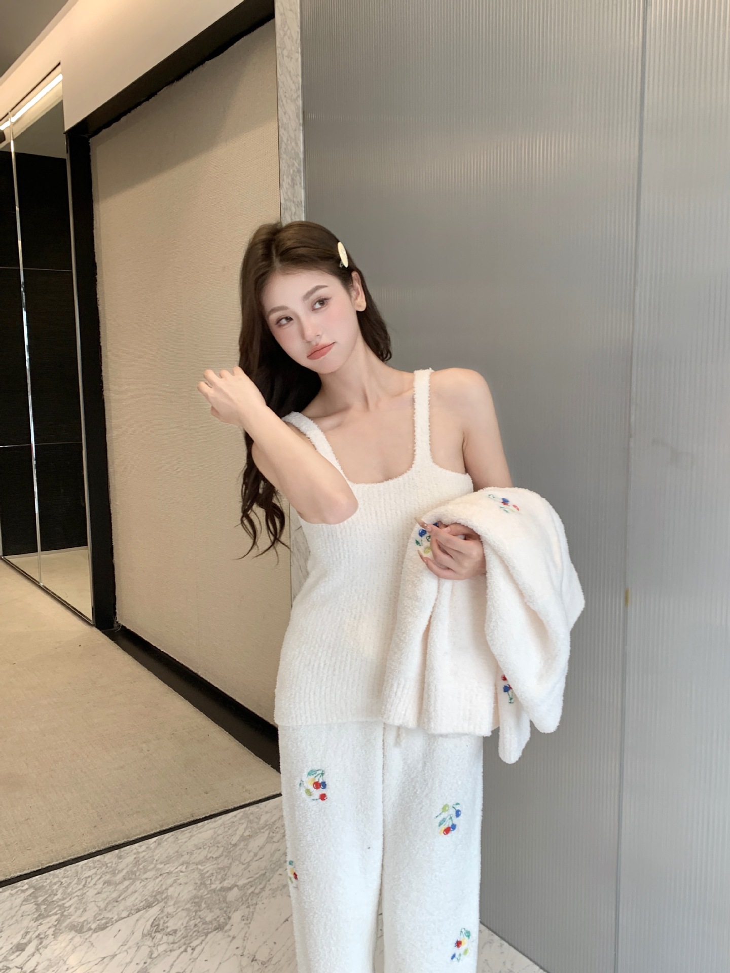 가을과 겨울 새로운 부드러운 달콤한 색상 자수 체리 카디건 게으른 스타일 홈 의류 잠옷 여성용 3 종 세트스토어 가기
