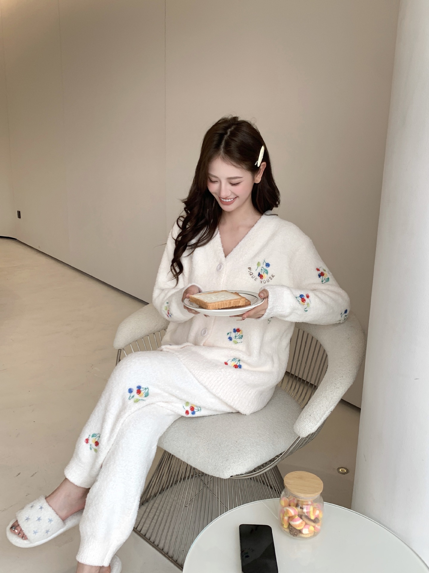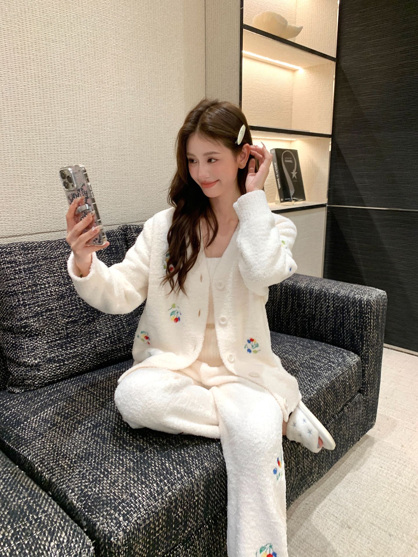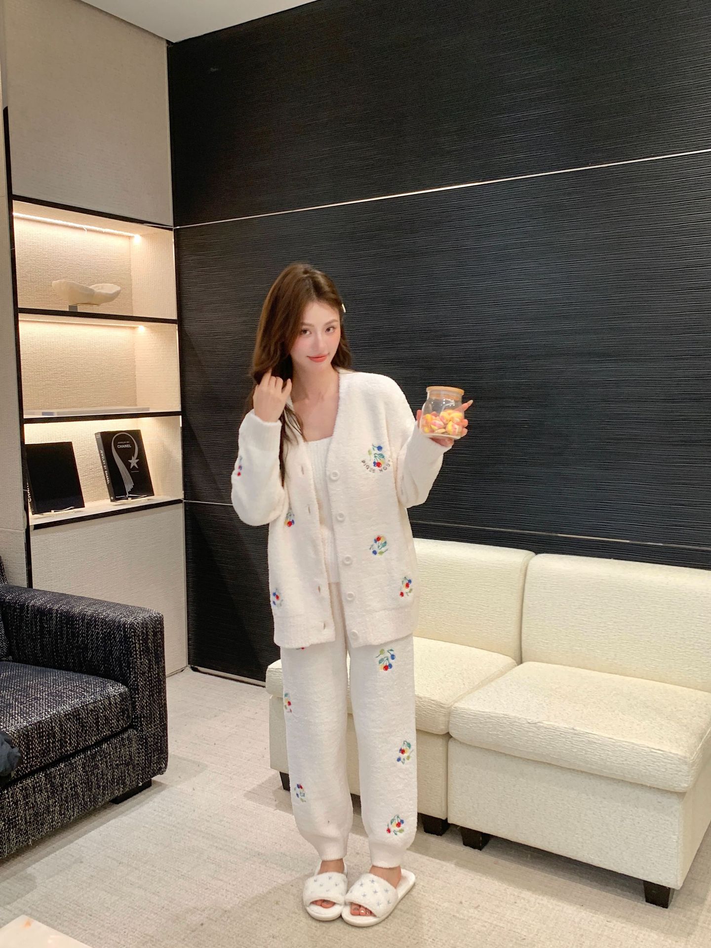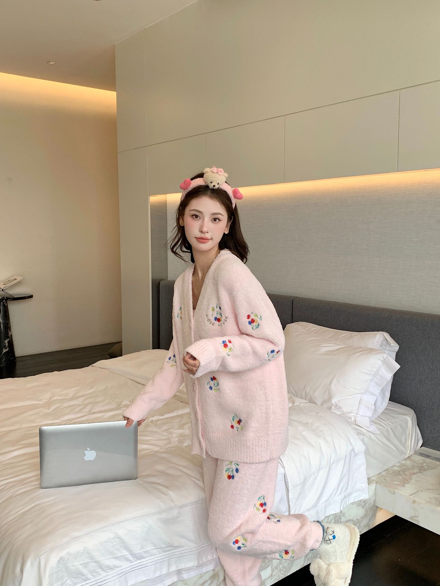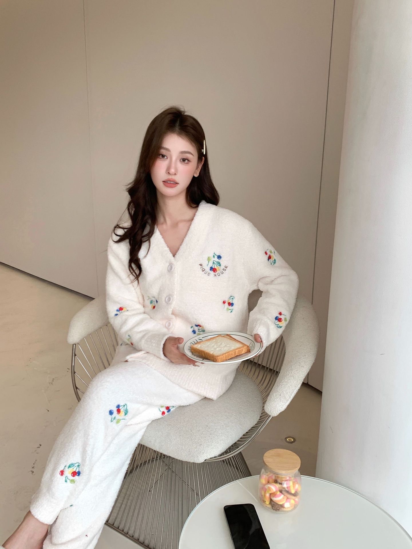 가을과 겨울 새로운 부드러운 달콤한 색상 자수 체리 카디건 게으른 스타일 홈 의류 잠옷 여성용 3 종 세트스토어 가기