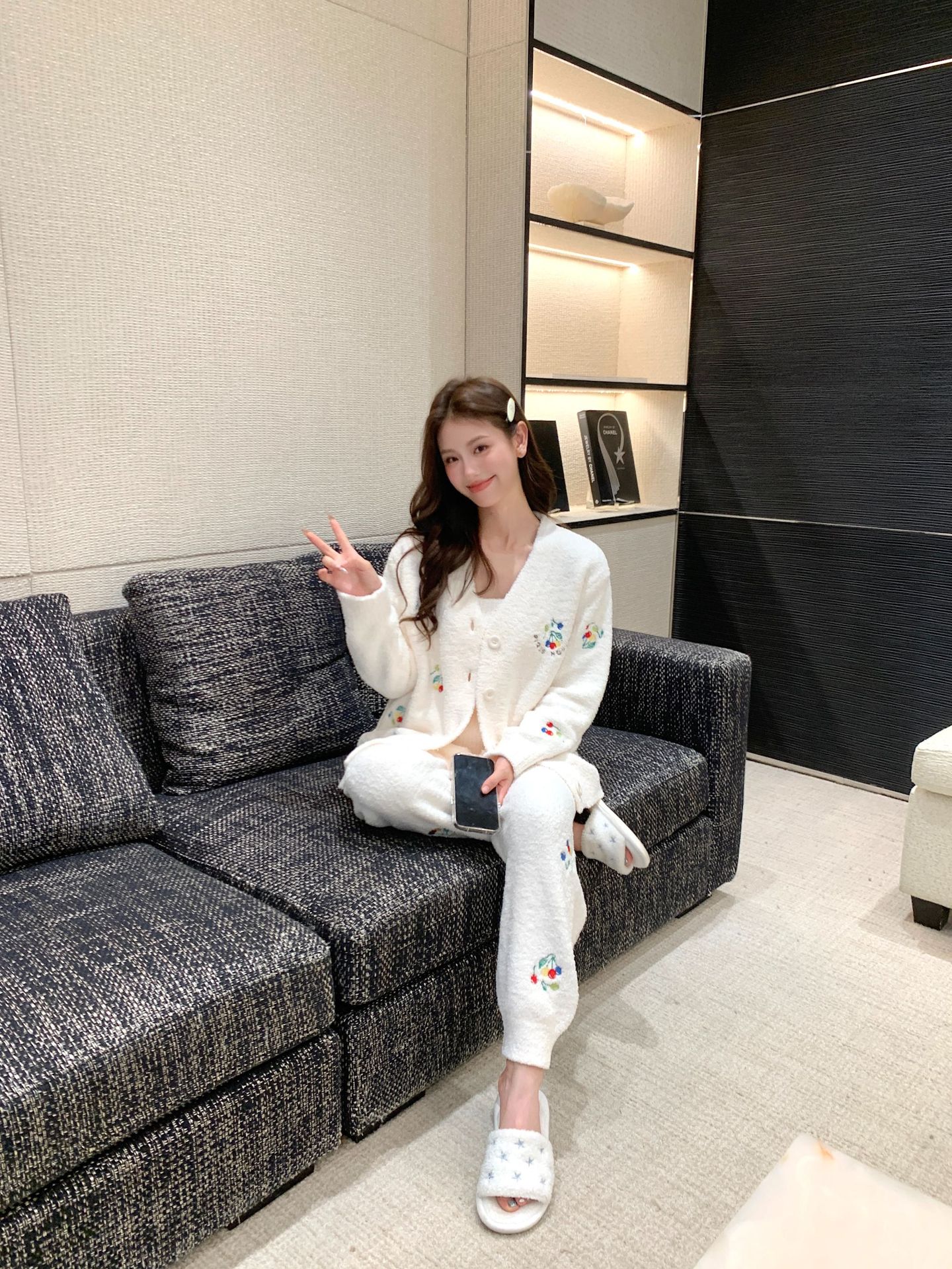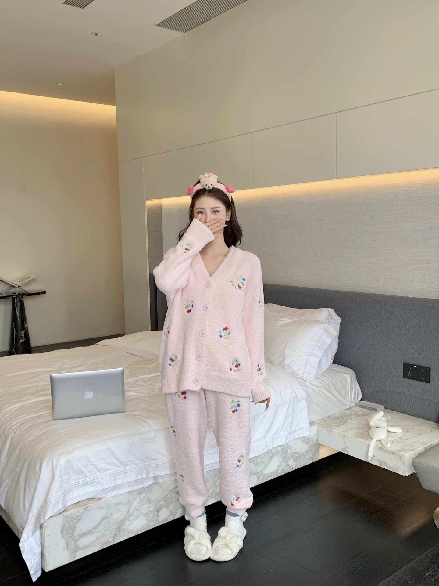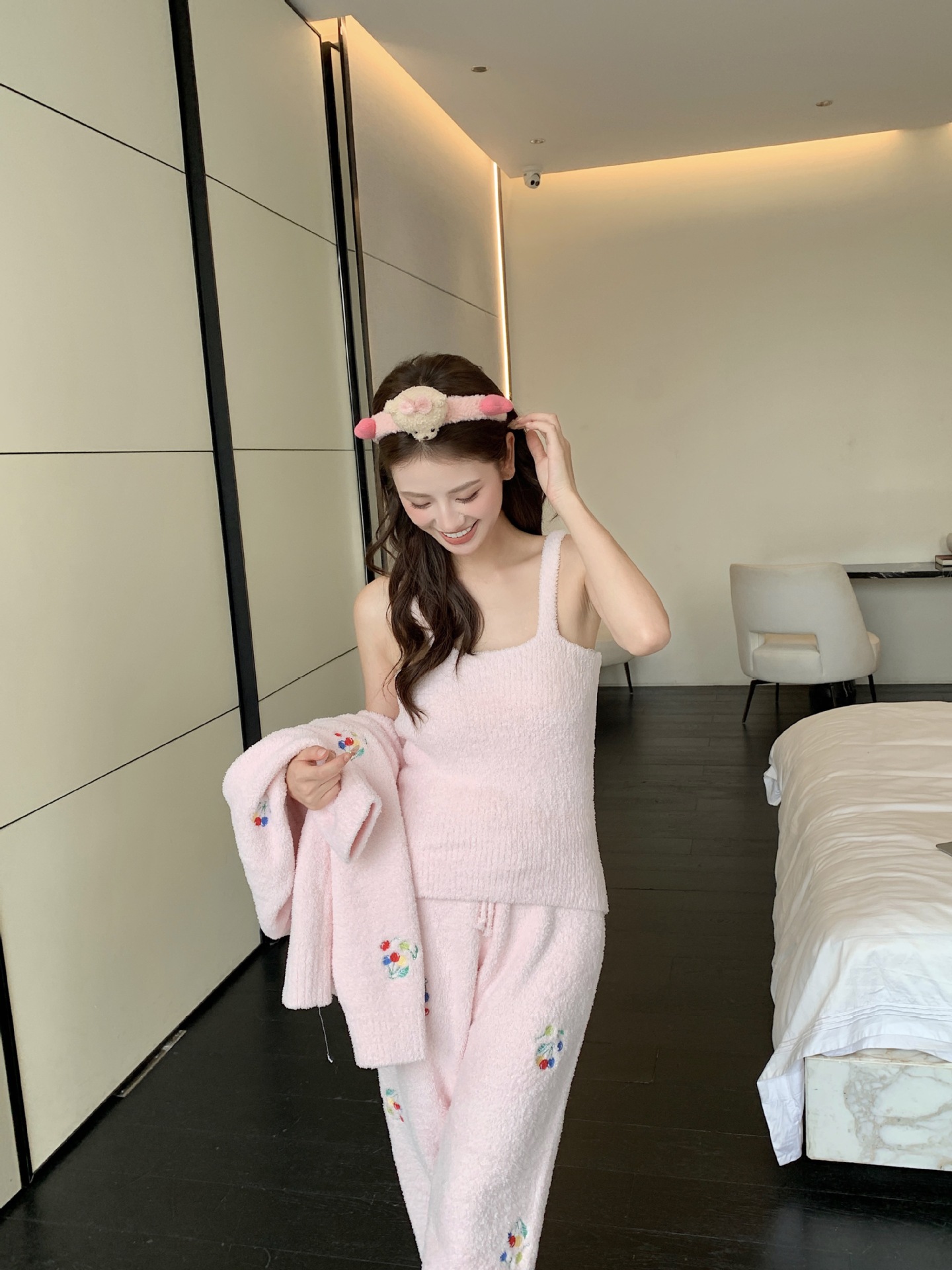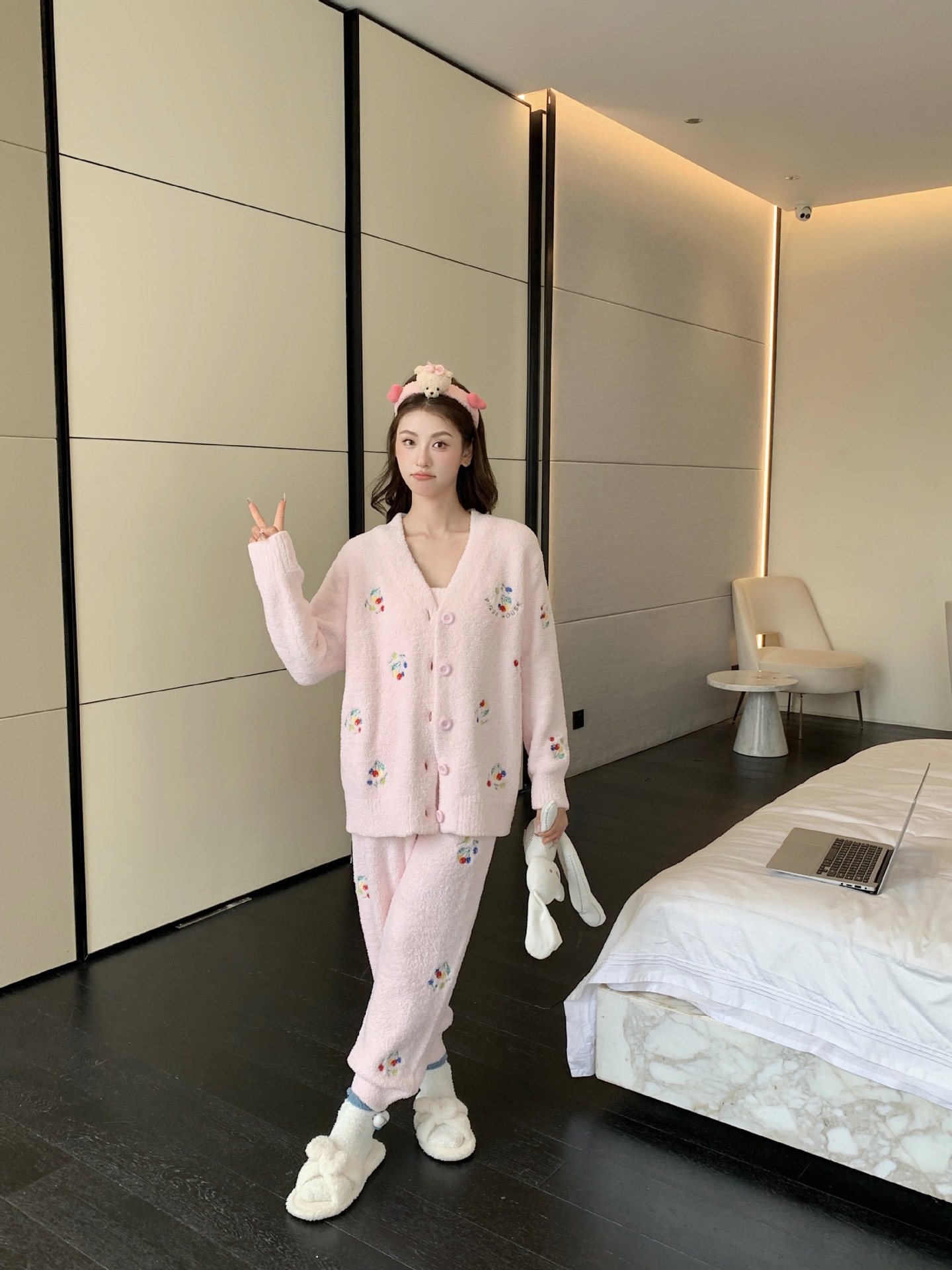 가을과 겨울 새로운 부드러운 달콤한 색상 자수 체리 카디건 게으른 스타일 홈 의류 잠옷 여성용 3 종 세트스토어 가기