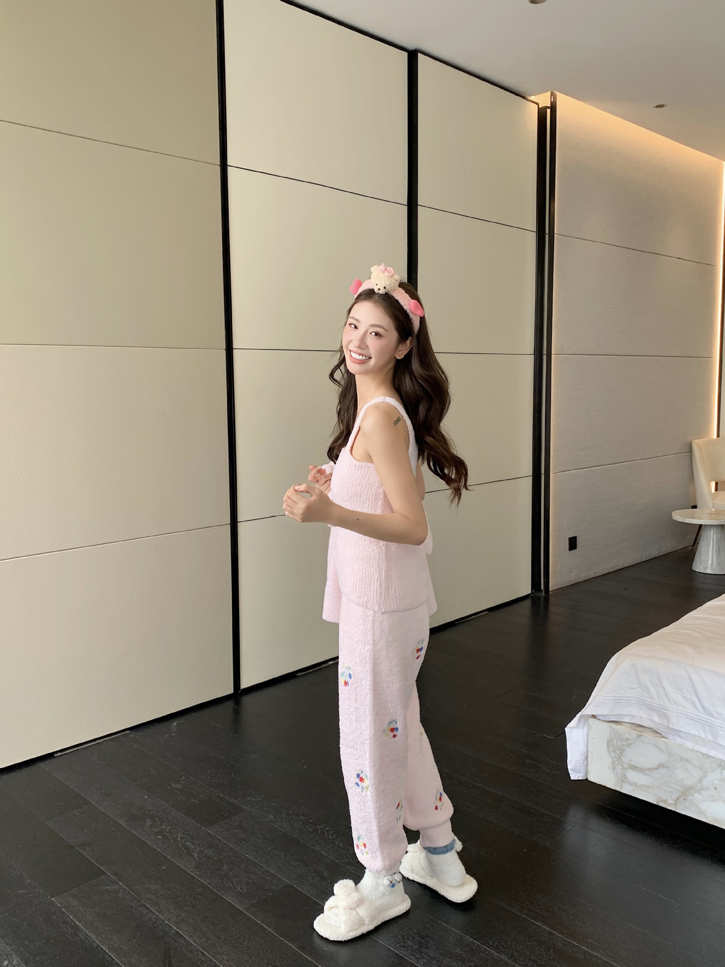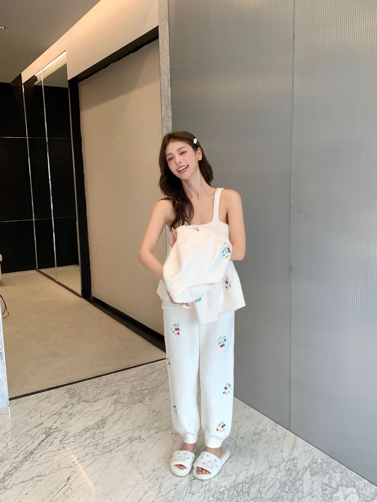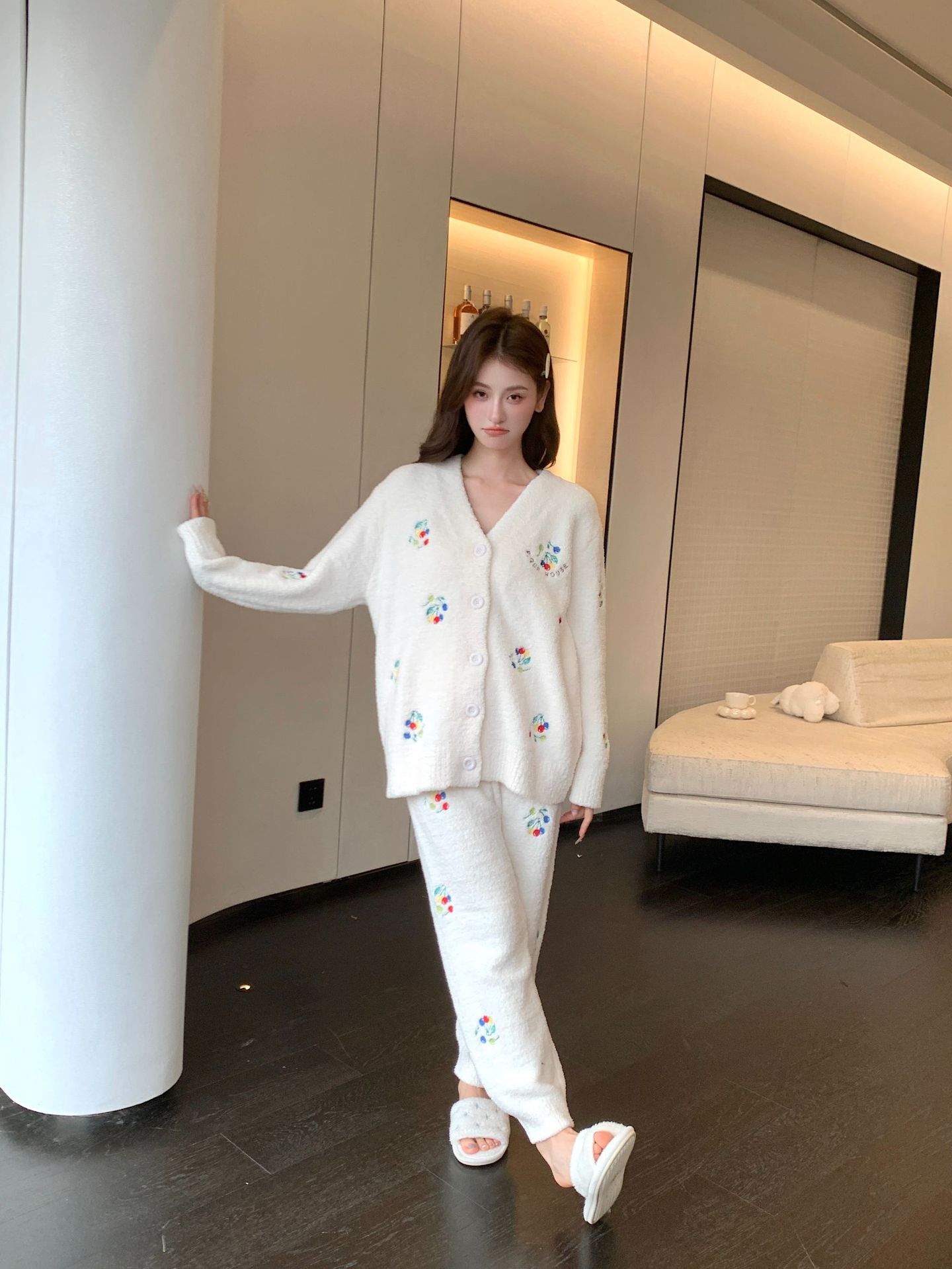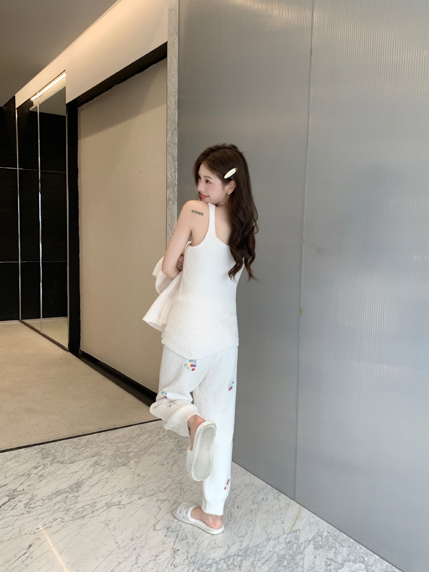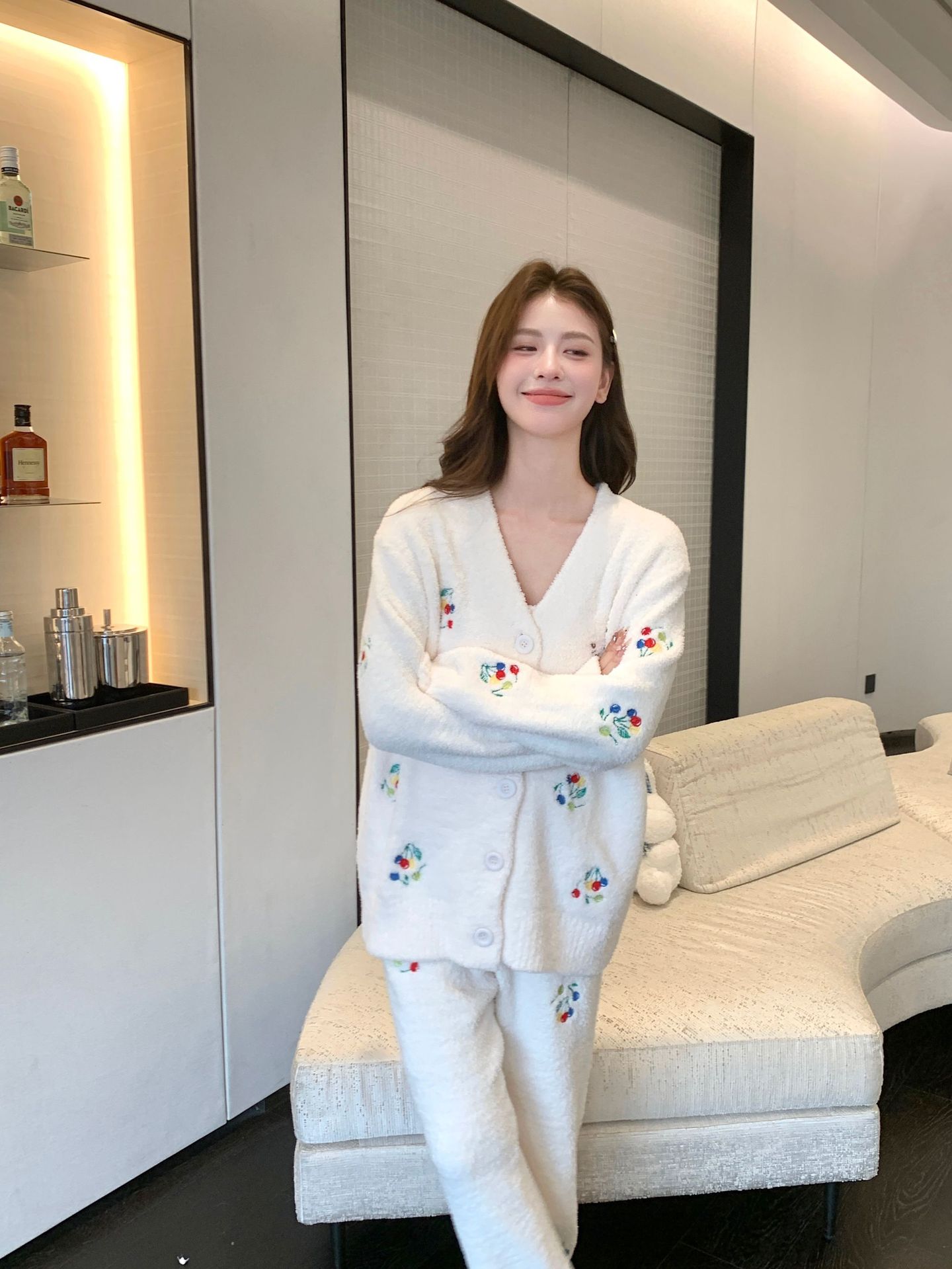 가을과 겨울 새로운 부드러운 달콤한 색상 자수 체리 카디건 게으른 스타일 홈 의류 잠옷 여성용 3 종 세트스토어 가기