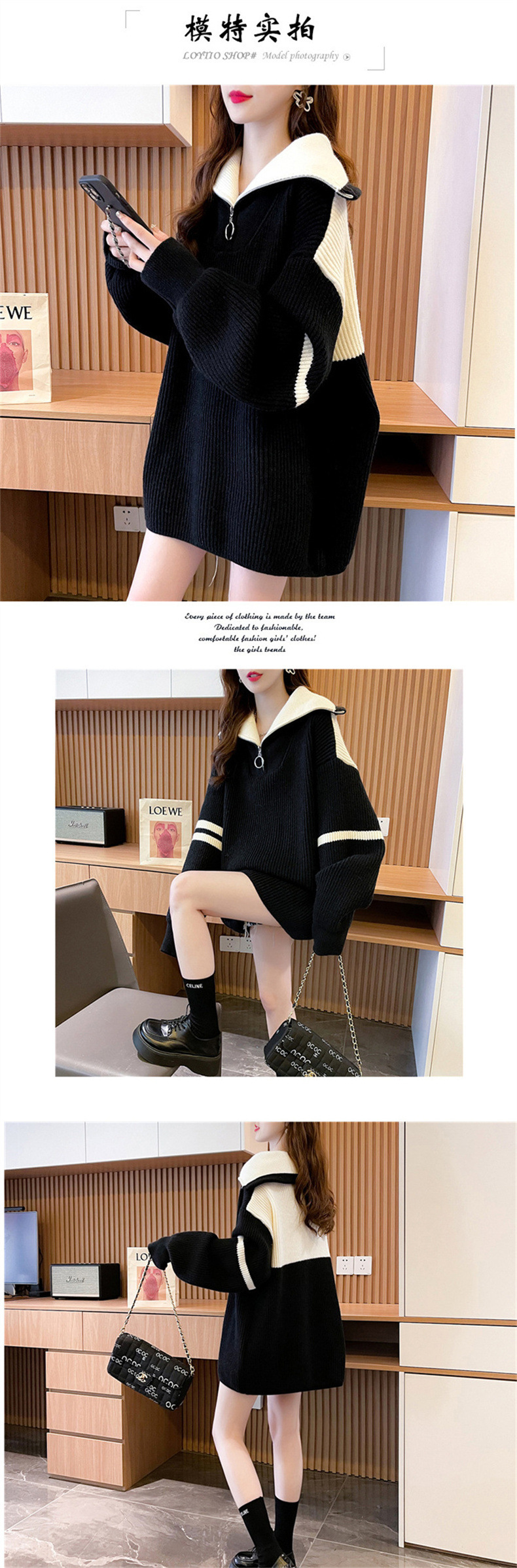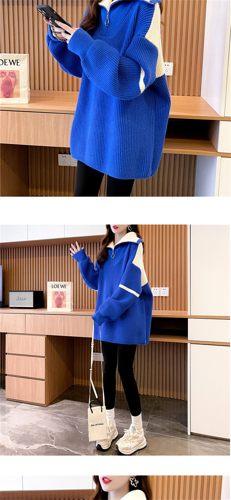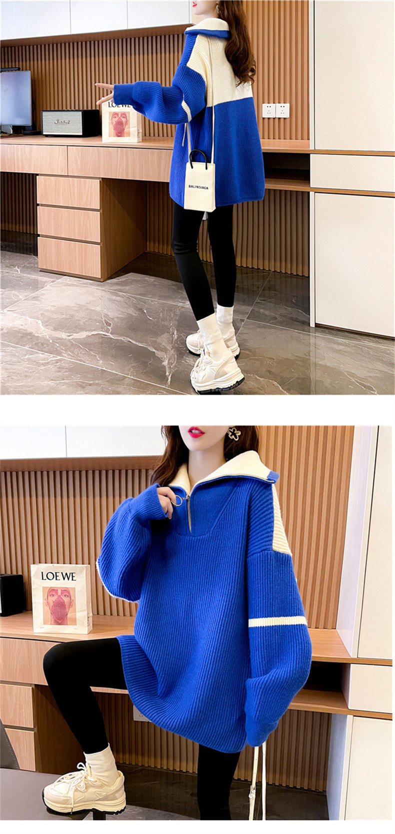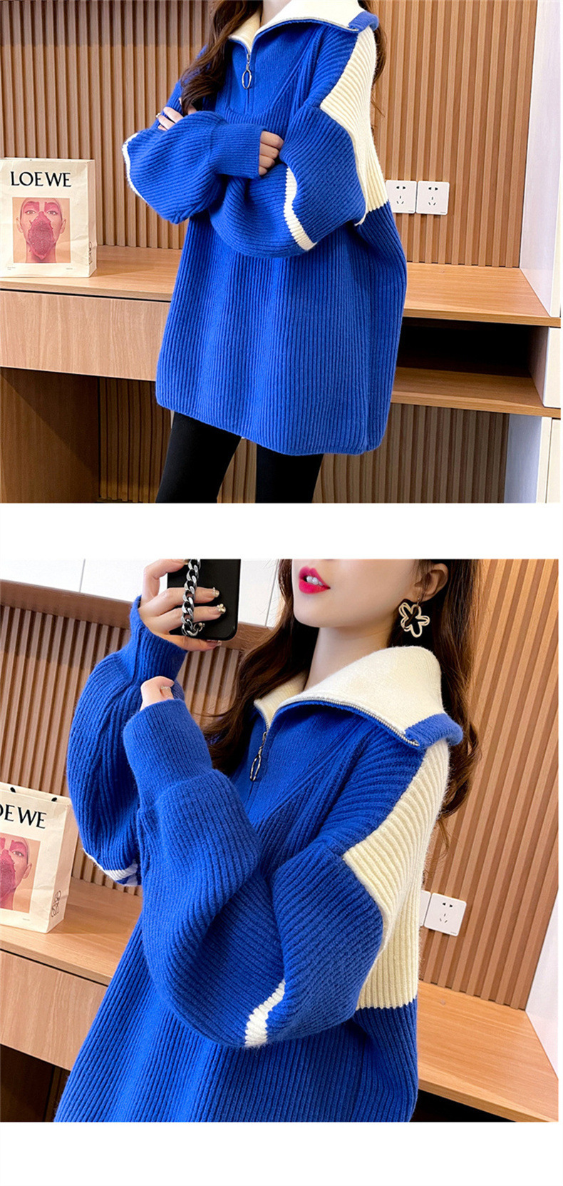 한국 스타일 캐주얼 루즈한 겉옷 니트웨어 여성용 2023 가을과 겨울 새로운 색상 대비 여성용 하프 지퍼 터틀넥 스웨터스토어 가기