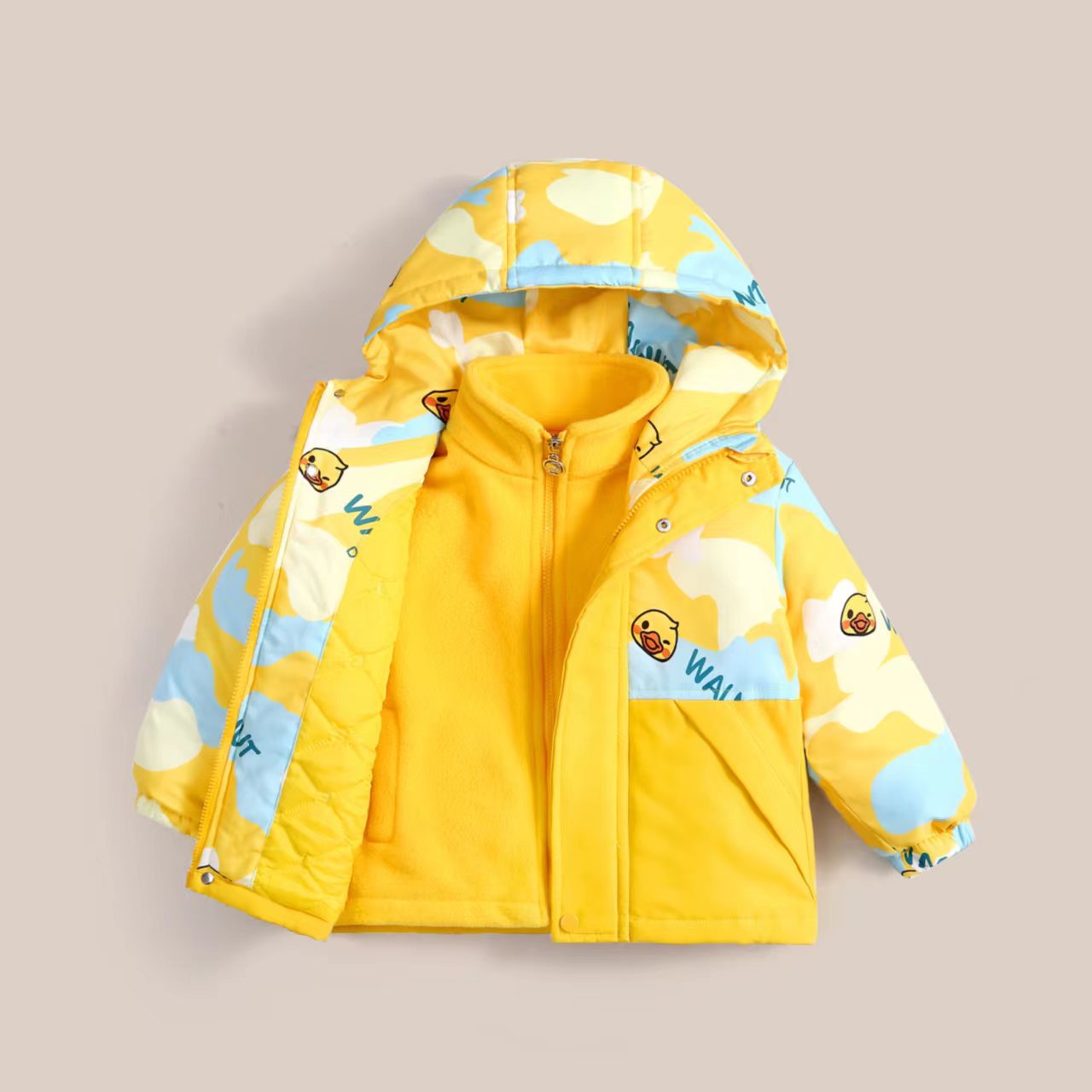 작은 노란 오리 어린이 쓰리-인-원 러쉬 옷 소년 소녀 가을과 겨울 코트 흰색 오리 다운 라이너 방한 코트를 입고