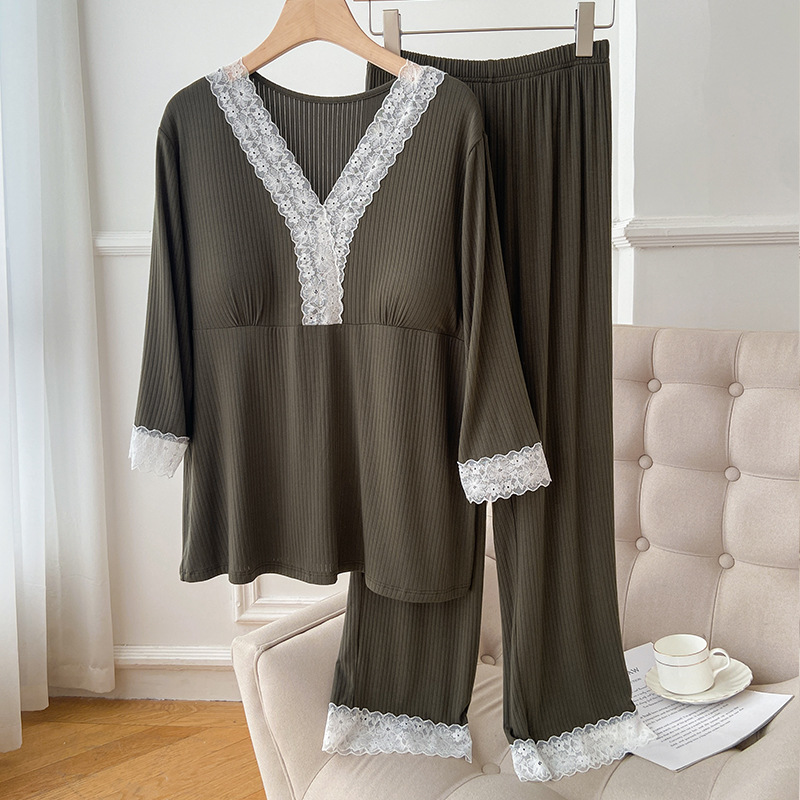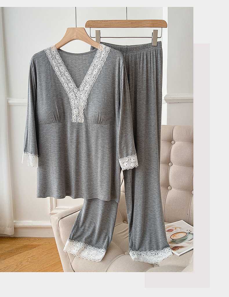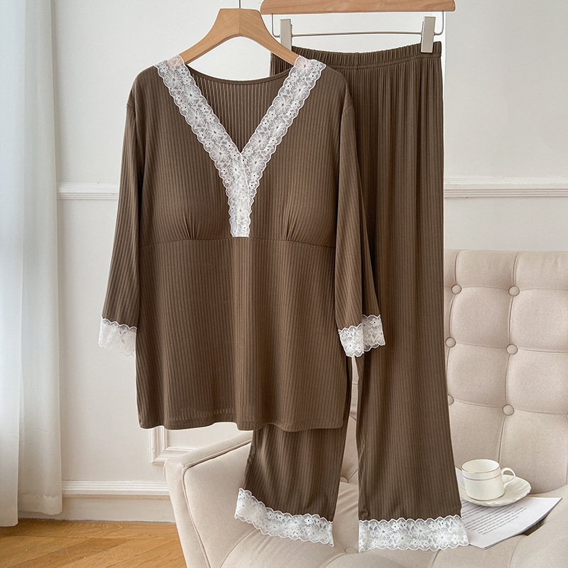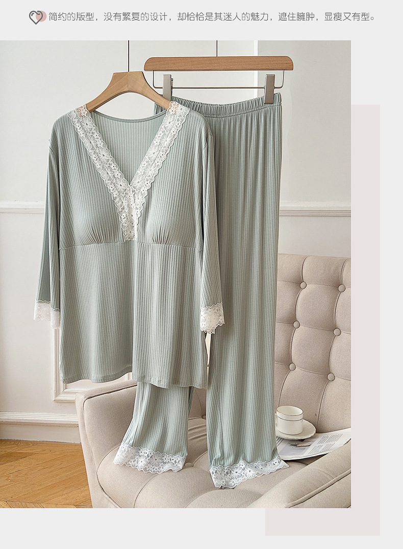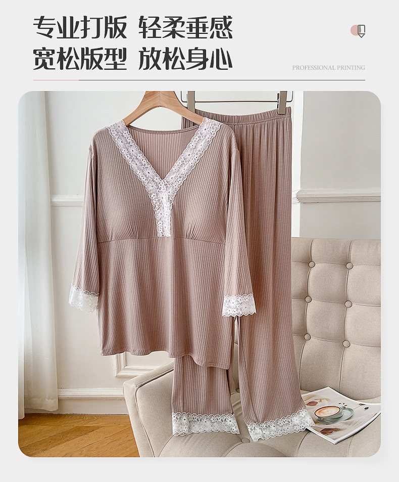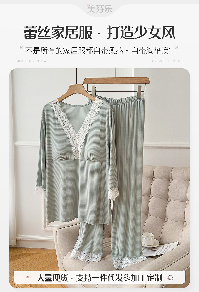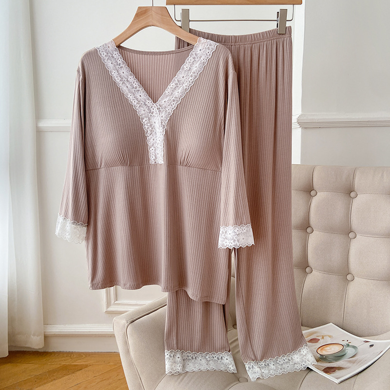 가을과 겨울 모달 드랩 V-넥 세븐 슬리브 홈 의류 세트 여성용 루즈 레이스 사이드 가슴 패드 잠옷