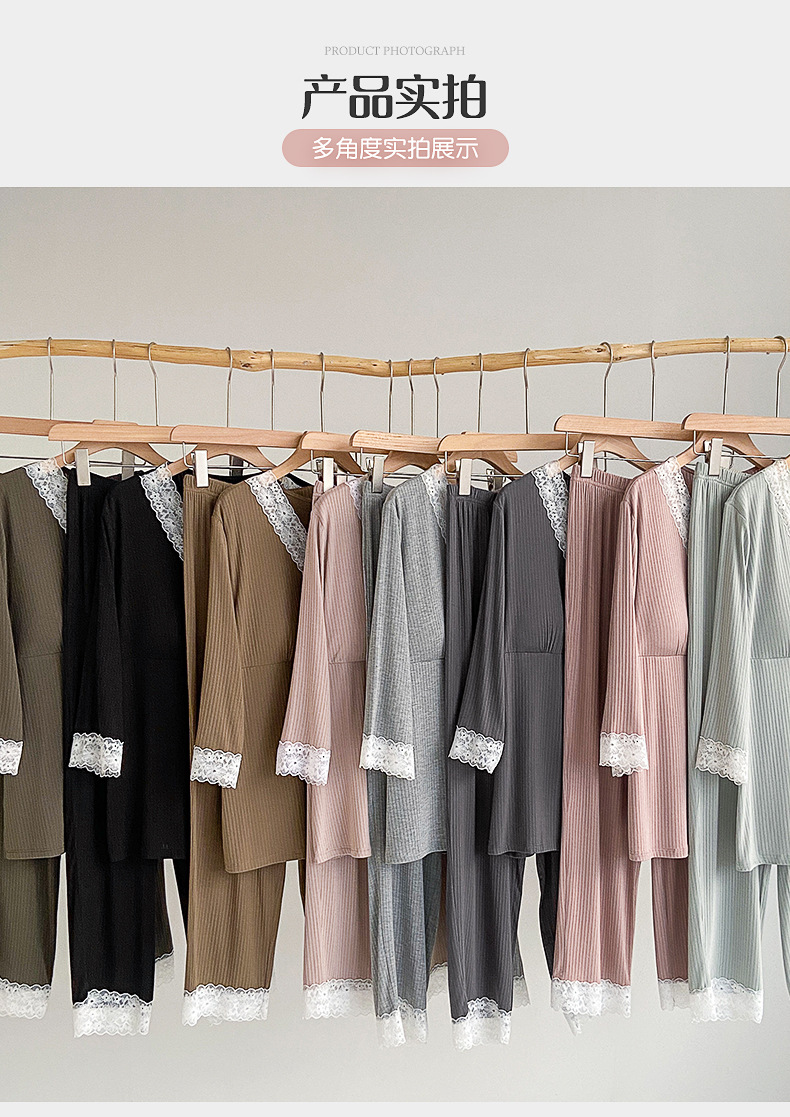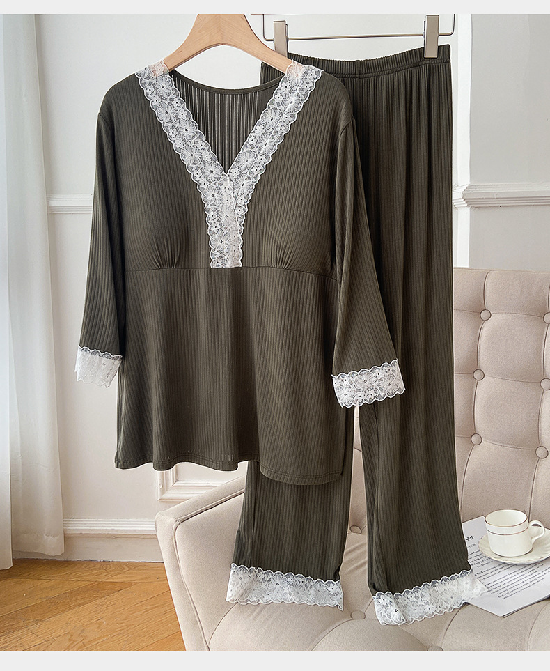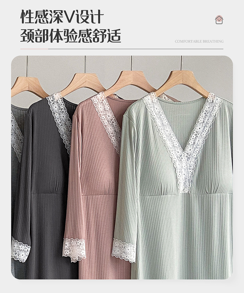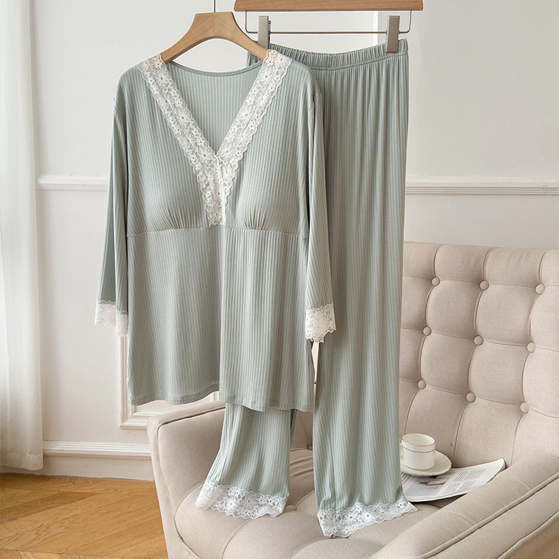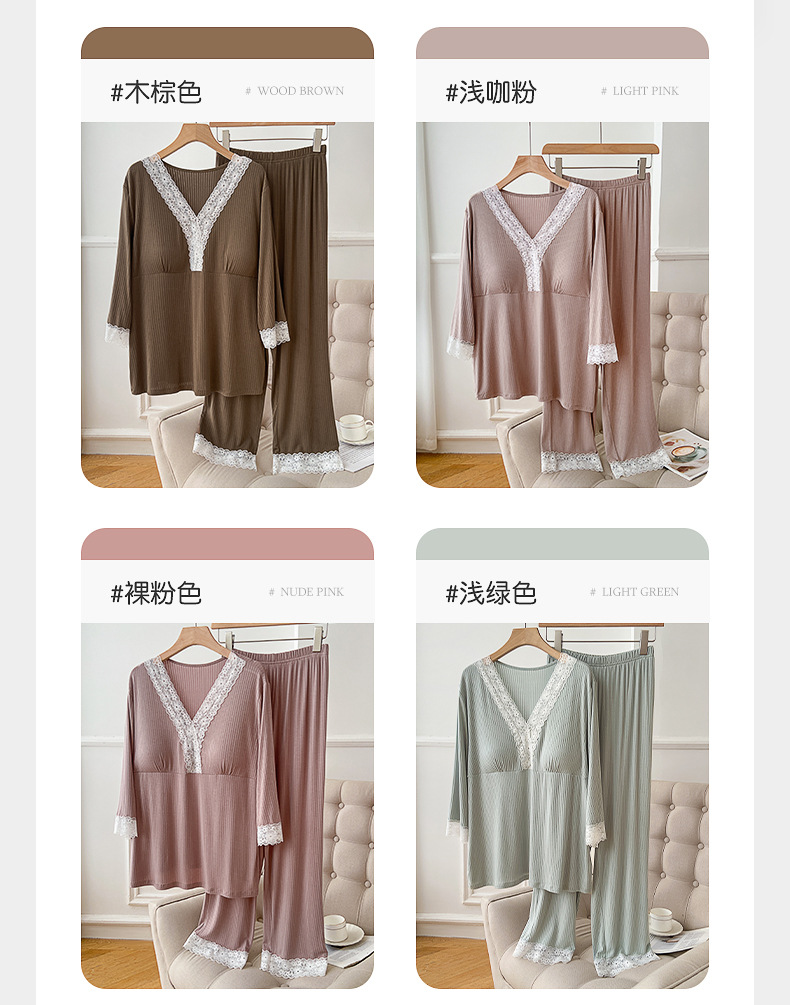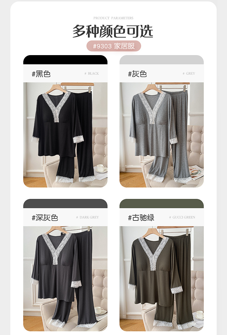 가을과 겨울 모달 드랩 V-넥 세븐 슬리브 홈 의류 세트 여성용 루즈 레이스 사이드 가슴 패드 잠옷