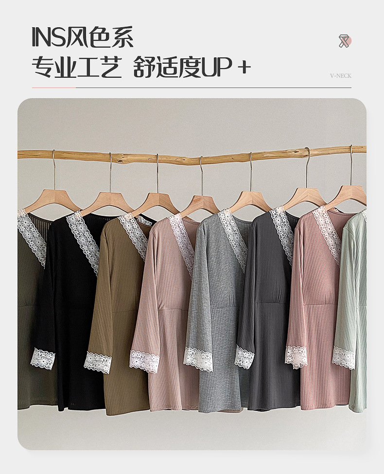 가을과 겨울 모달 드랩 V-넥 세븐 슬리브 홈 의류 세트 여성용 루즈 레이스 사이드 가슴 패드 잠옷스토어 가기